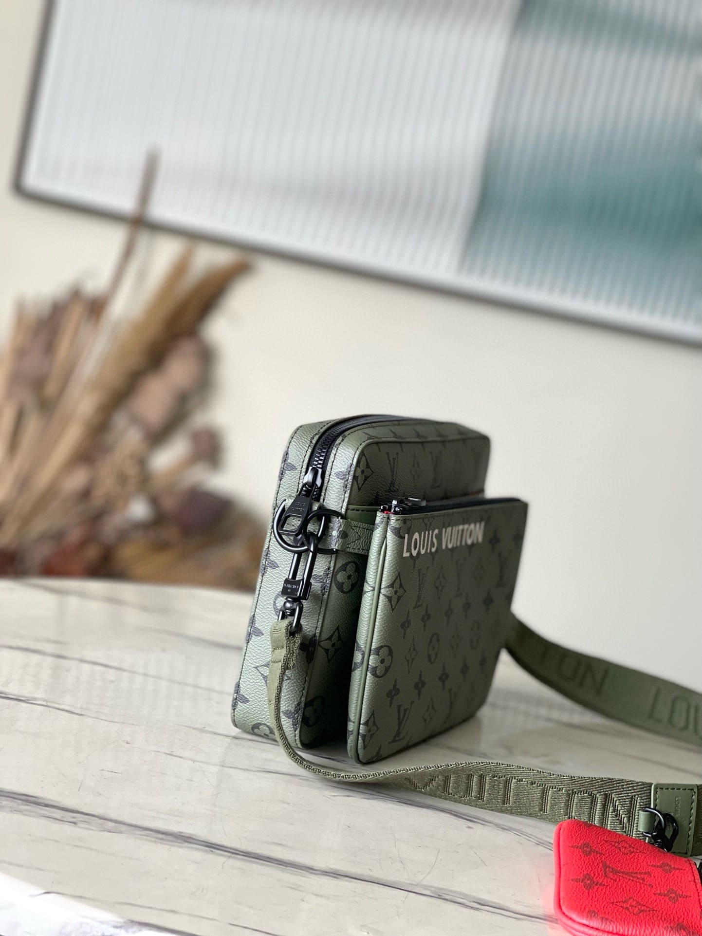 Three accessories in one, the Trio Messenger bag is composed of a removable coin purse, a main compartment, and a detachable front zipped pocket that can be removed and used separately. Crafted from green and red Monogram coated canvas, it comes with a detachable and adjustable textile strap to which the coin purse is attached.