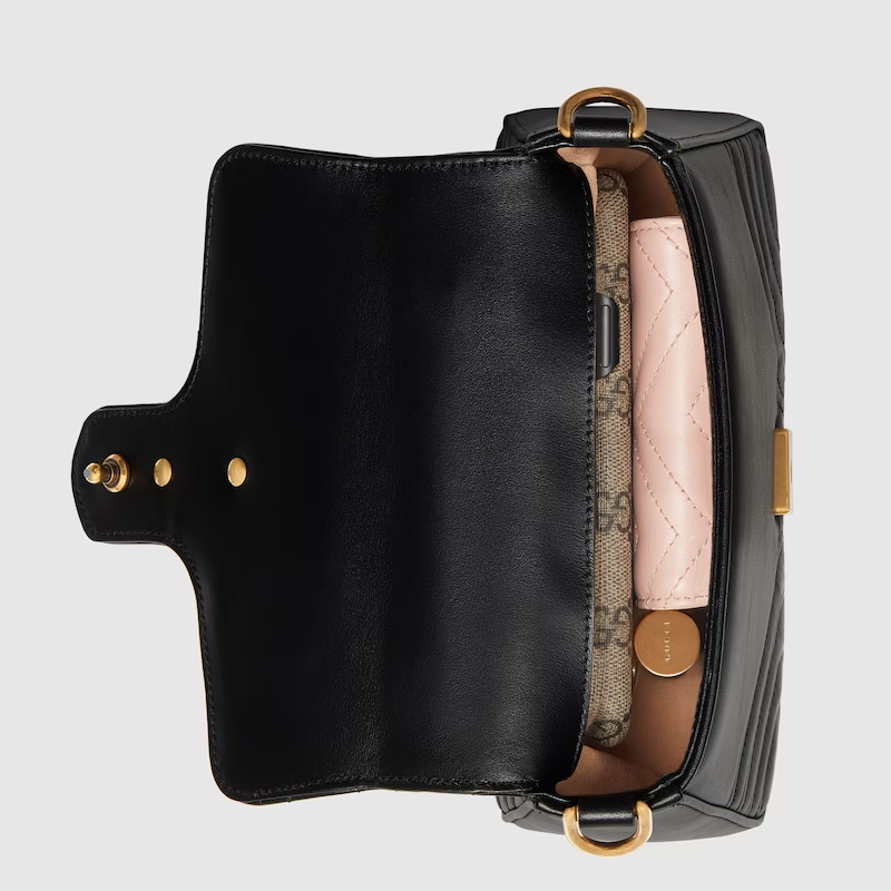 A new introduction to the GG Marmont line for Cruise 2019, the mini GG Marmont top handle bag has a softly structured shape and an oversized flap closure with Double G hardware. Equipped with a leather top handle and chain shoulder strap, made in matelassé chevron leather with a heart on the back.