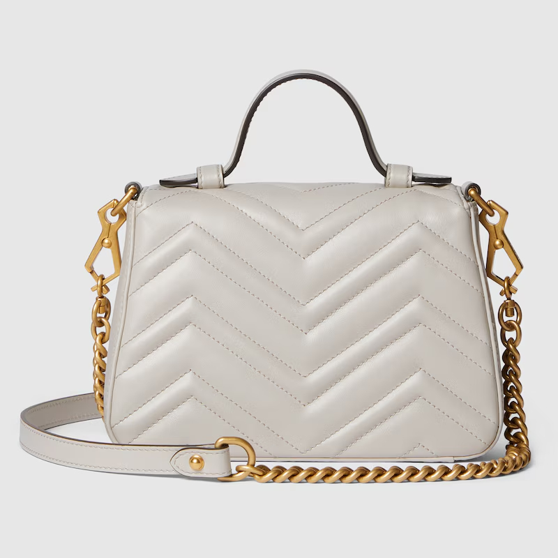 The GG Marmont mini top handle bag has a softly structured shape and an oversized flap closure with Double G hardware. Equipped with a leather top handle and chain shoulder strap, this piece is crafted in light grey matelassé leather highlighting curved lines.