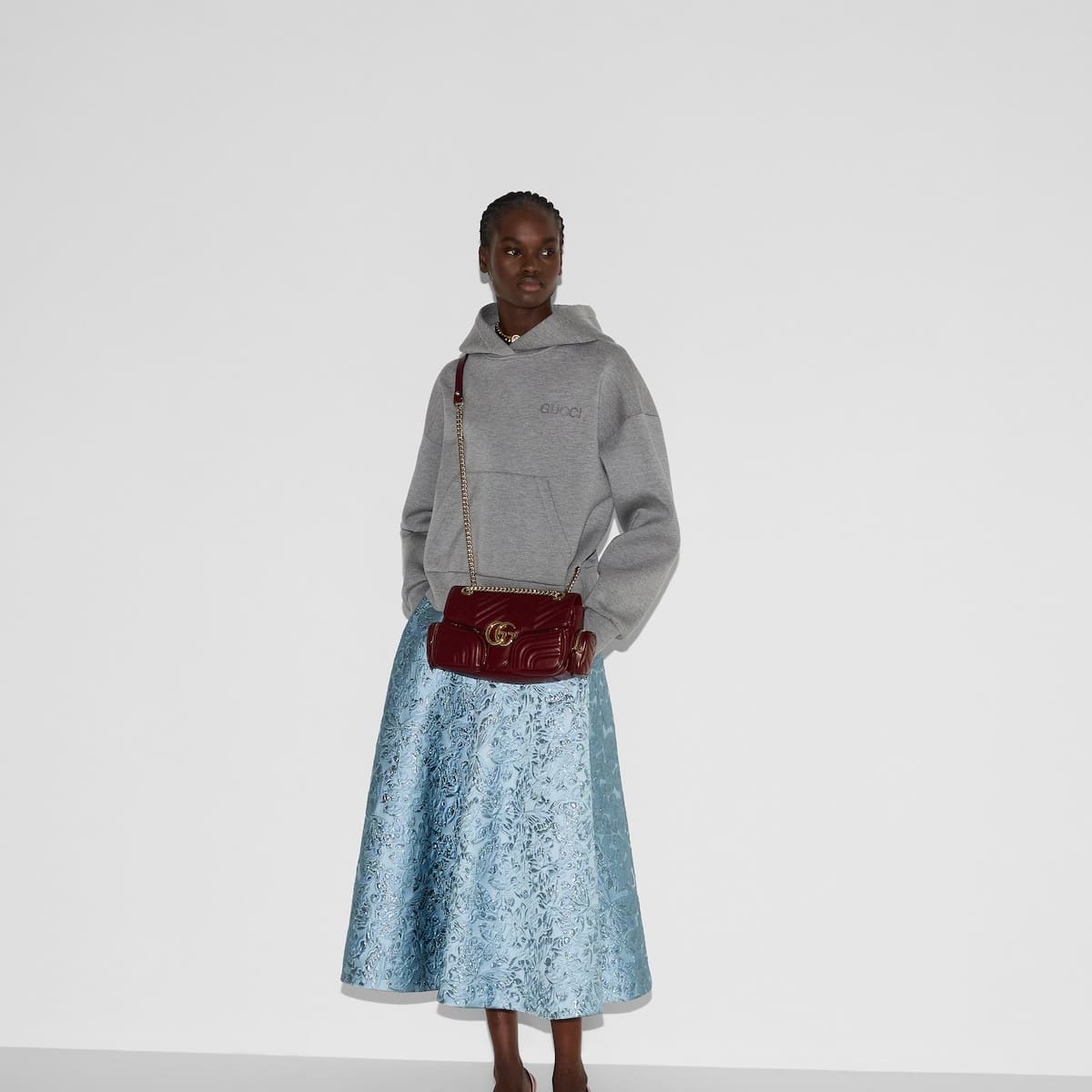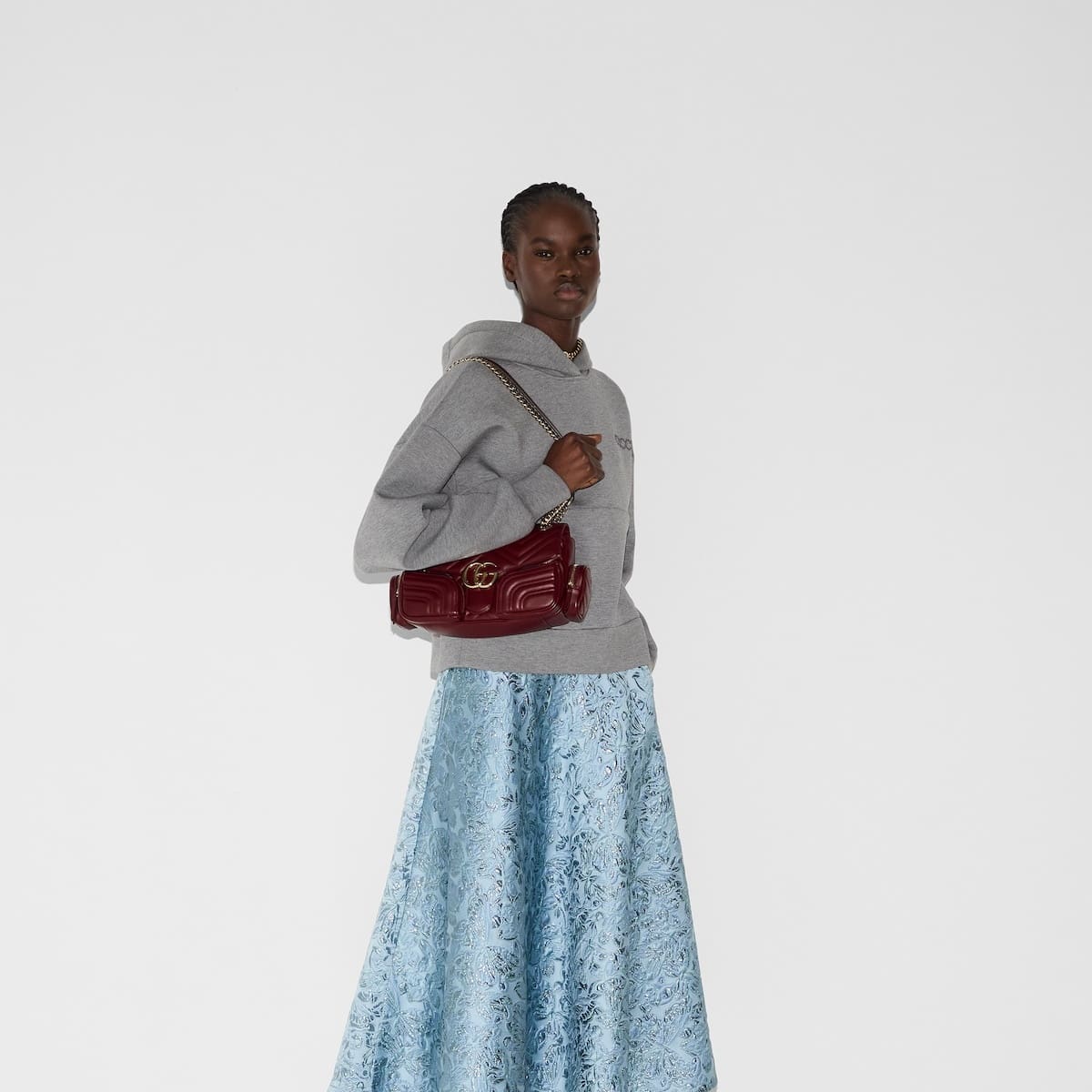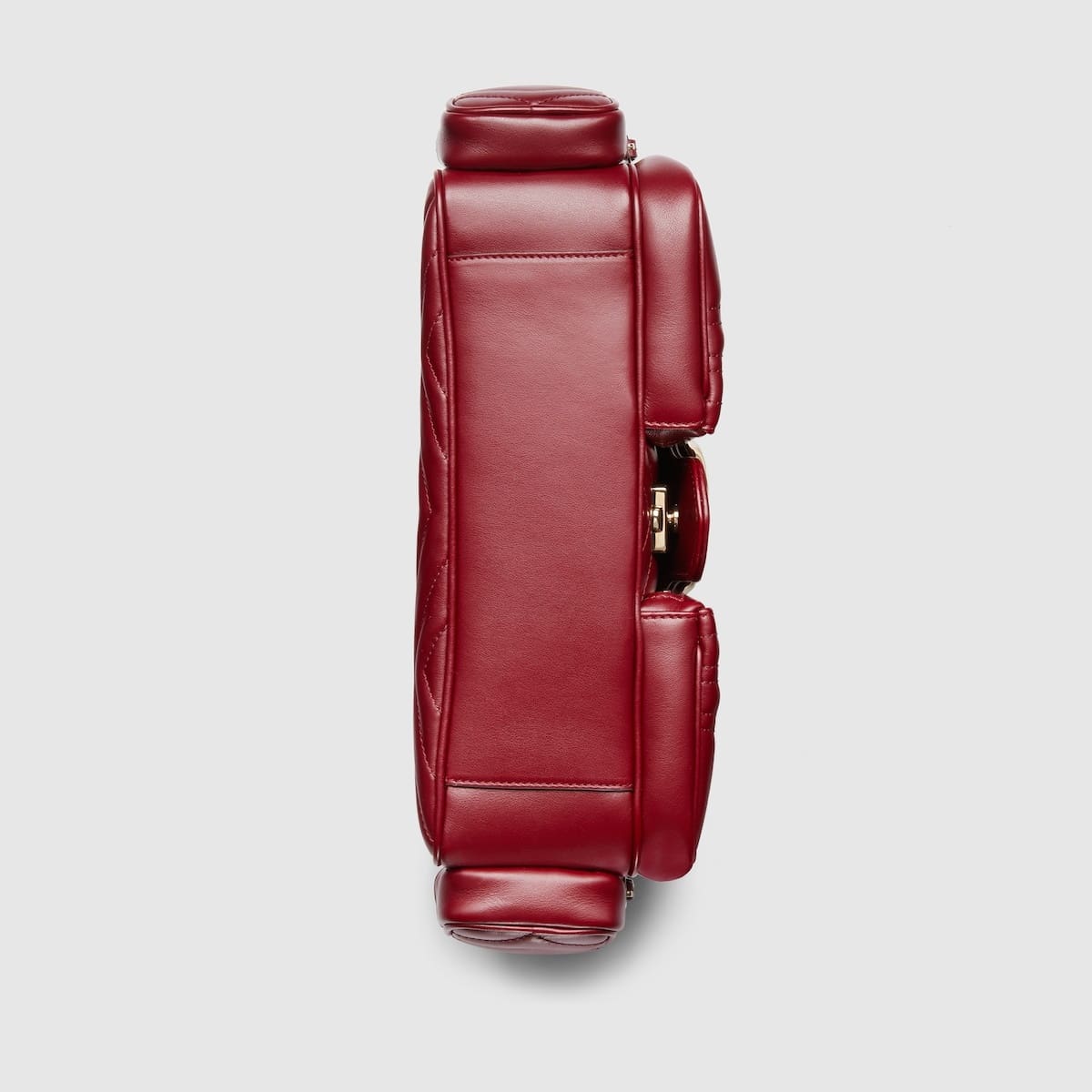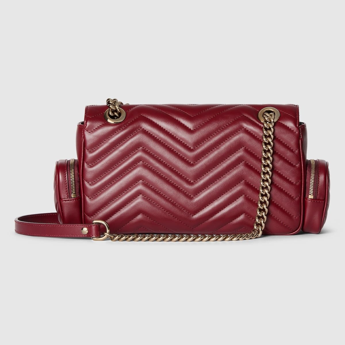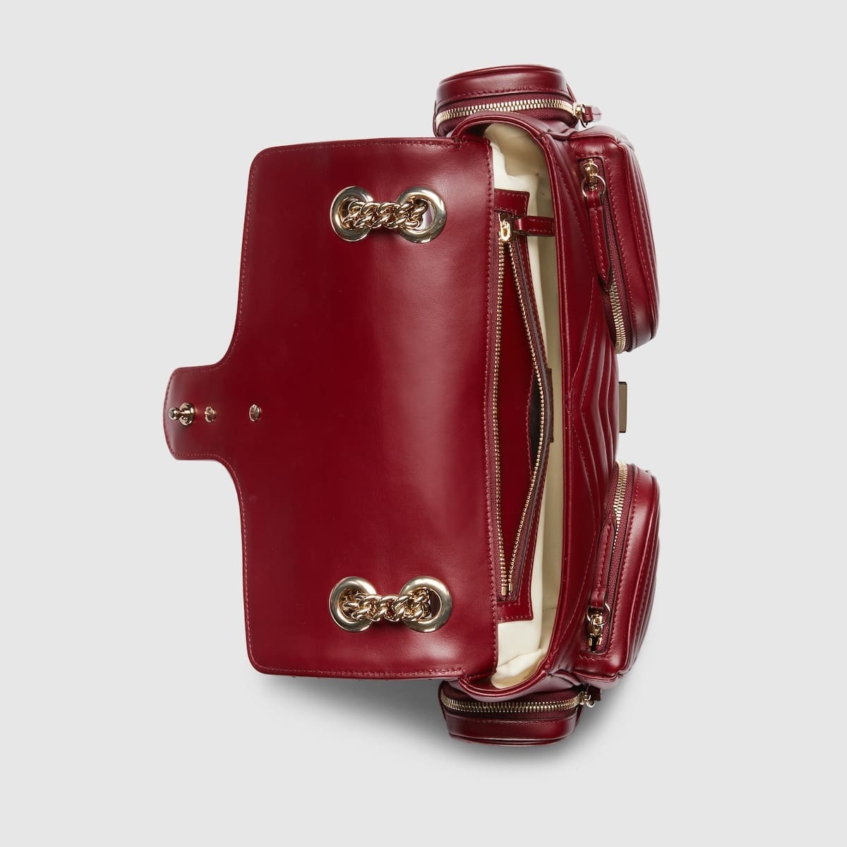 The GG Marmont line has always combined innovative material and design, and for Pre-Fall, multiple zip pockets placed on the outside further emphasize the geometry and sophistication of the matelassé chevron leather. Ivory leather lining, light gold toned hardware, and an adjustable leather and chain shoulder strap completes this small shoulder bag in the Gucci Rosso Ancora hue.