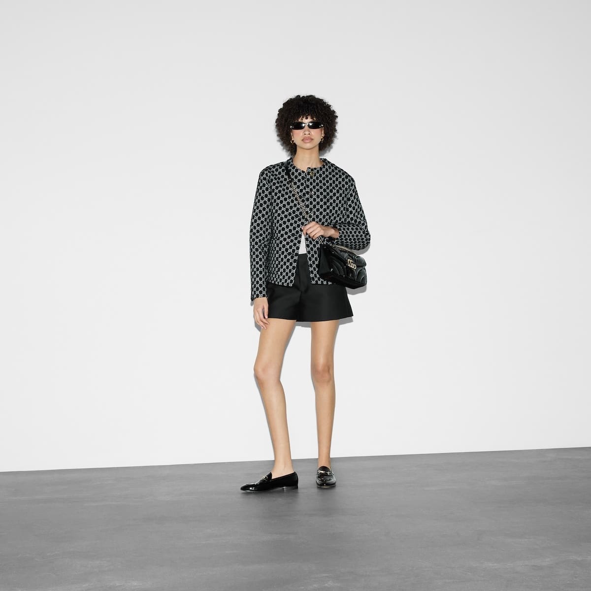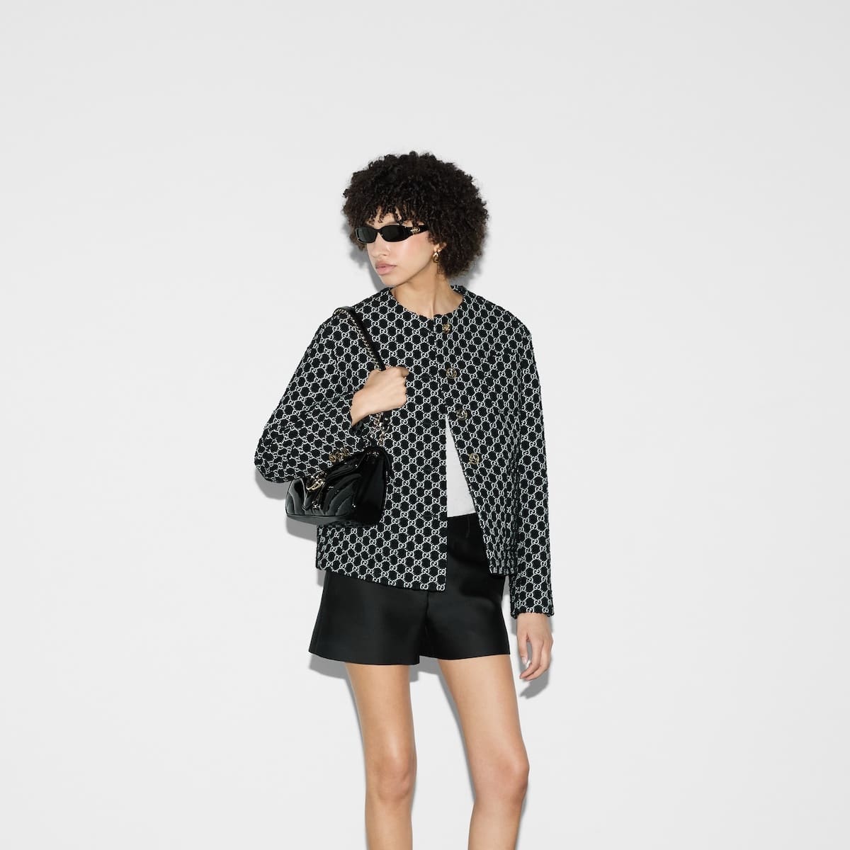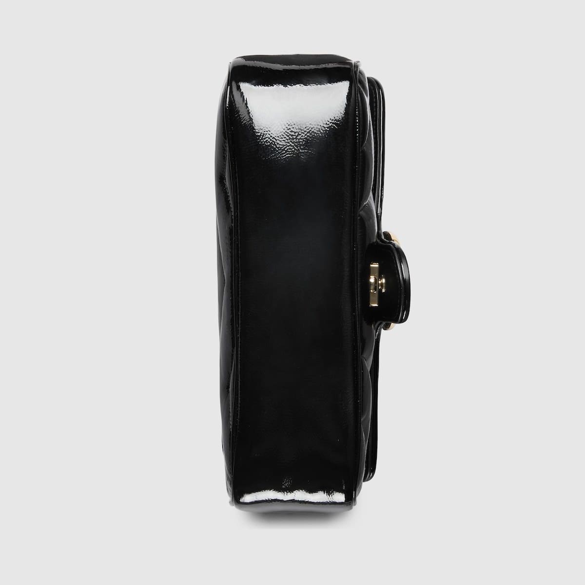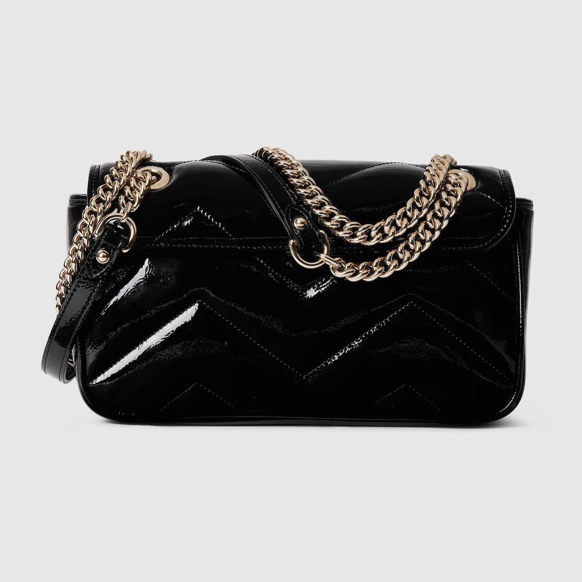 he GG Marmont collection spotlights sophisticated leather in dark tones to welcome Pre-Fall. Crafted in quilted chevron patent leather, this small shoulder bag underlines its contemporary silhouette in black, complete with light gold toned hardware.