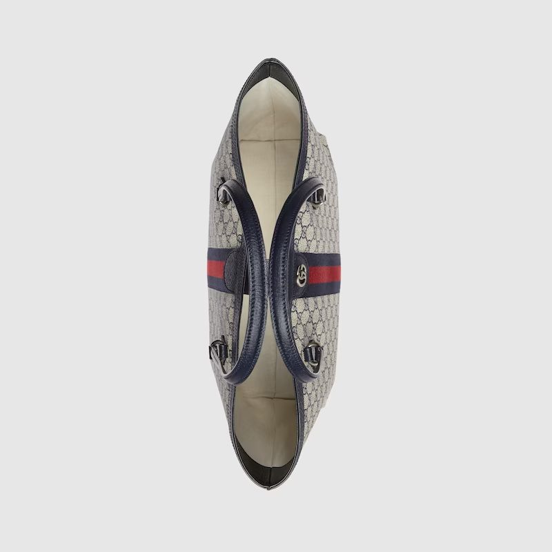 Mirroring the material’s historic origins, GG Supreme is introduced in a timeless mix of blue and beige for Gucci Love Parade. The canvas has come to the front of each collection decade after decade to become a hallmark of the House. Here, the classic palette defines this medium-sized Ophidia tote bag, completed by the Web stripe in red and blue.