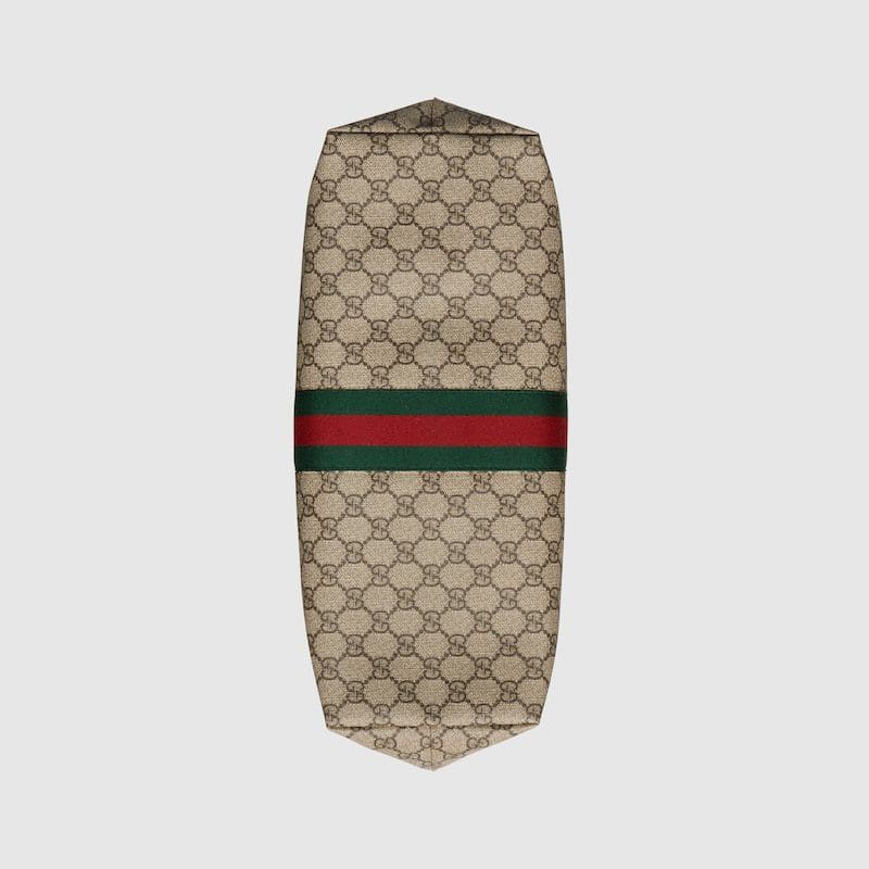 The world of Ophidia continues to evolve with new iterations for the Pre-Fall collection. The top handle bag is made of beige and ebony GG Supreme canvas and has a detachable and adjustable shoulder strap. The House Web stripe and Double G hardware complete the piece.