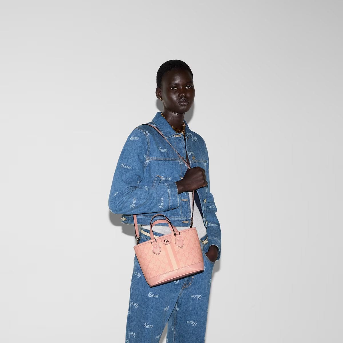 The Ophidia line is further elevated through new sizes and styles, like this mini tote bag which has a detachable pouch and detachable leather shoulder strap, allowing for versatile wear. The dusty pink GG Supreme canvas is complete with light gold-toned Double G hardware.