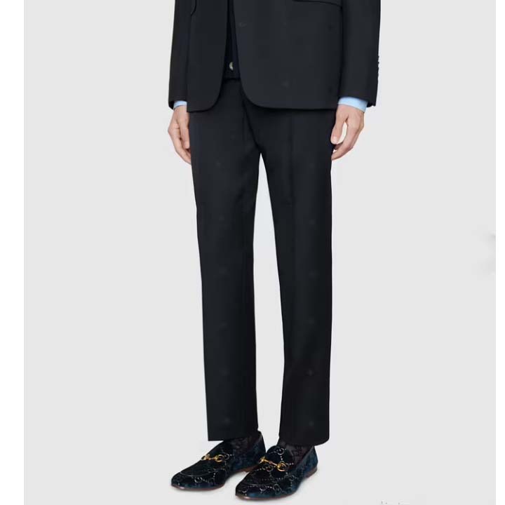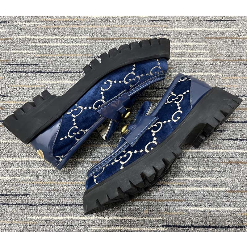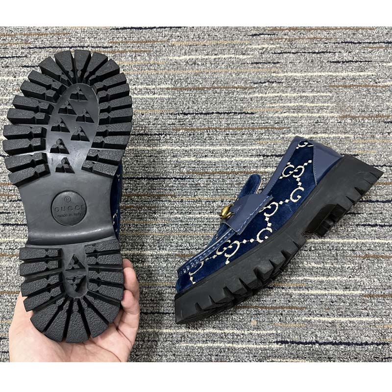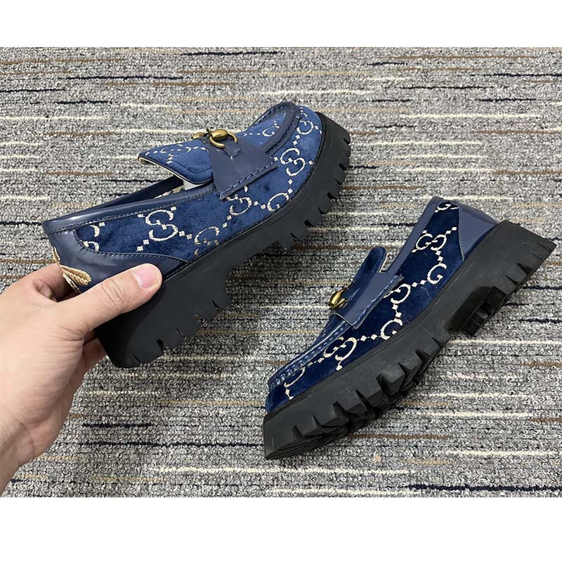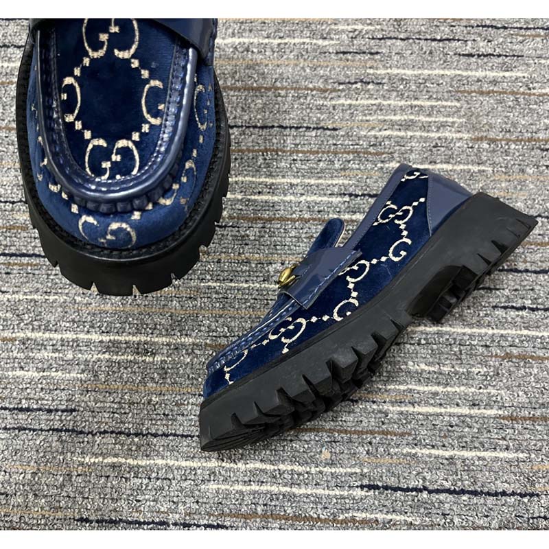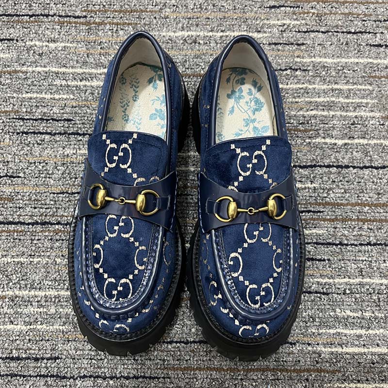 - Made in GG velvet—a distinctive fabric taken from the archives—the shoe is outlined with blue leather and topped with the Horsebit.