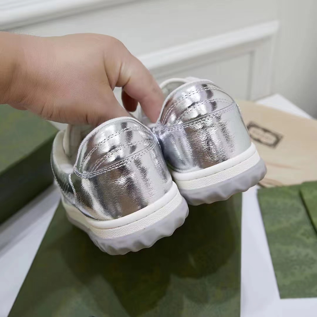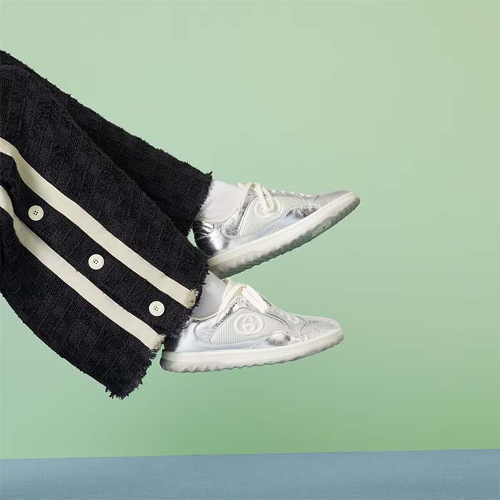 - Presented against metallic silver leather. the motif brings the House logo to the fore in this retro-inspired sneaker design.