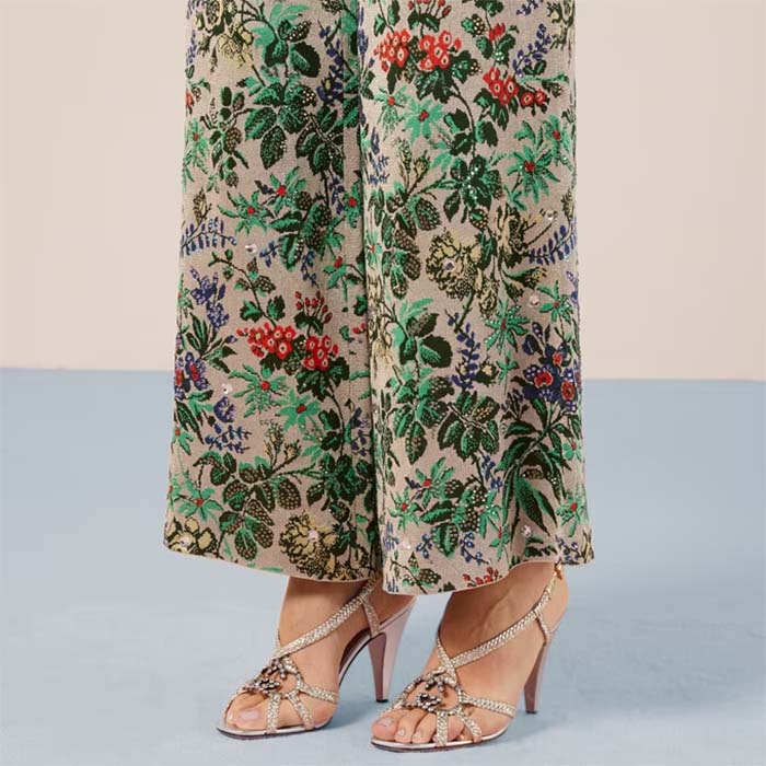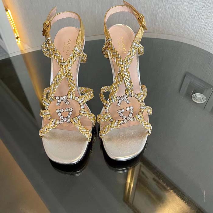 - Shimmering gold and silver leather intertwines to bring light and definition to this high heel sandal. enriched with a crystal-studded Interlocking G.