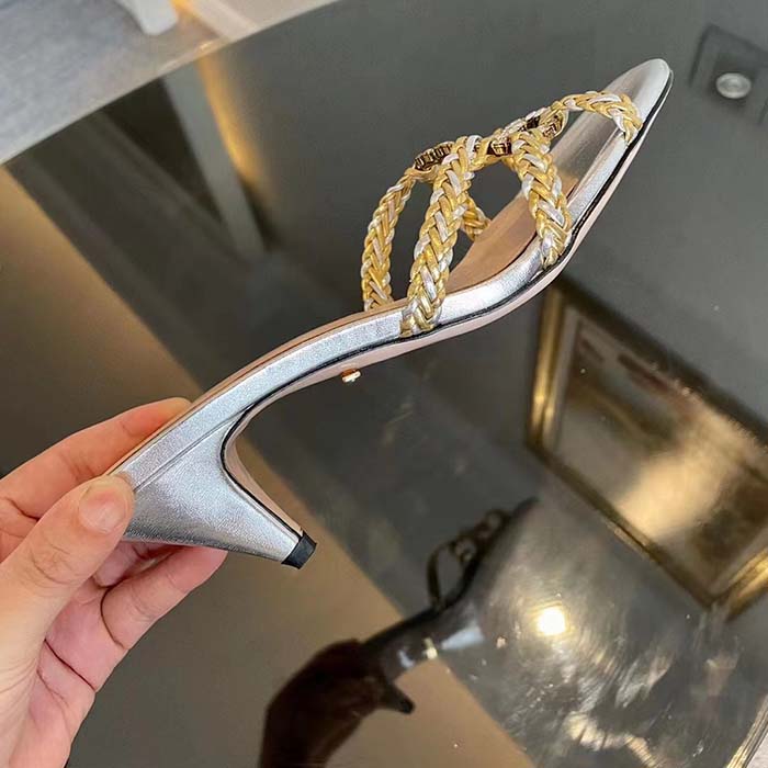 - Shimmering platinum and silver leather intertwines to bring light and definition to this slide sandal. enriched with a crystal-studded Interlocking G.