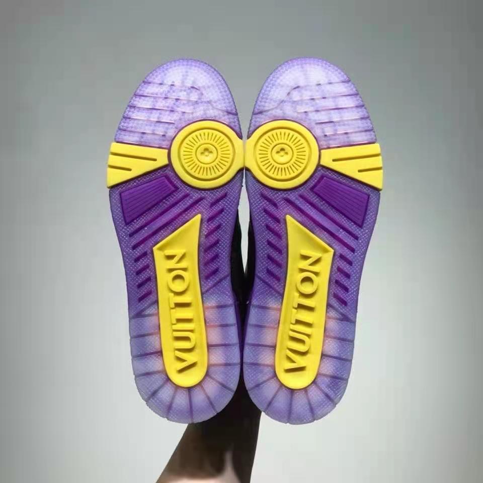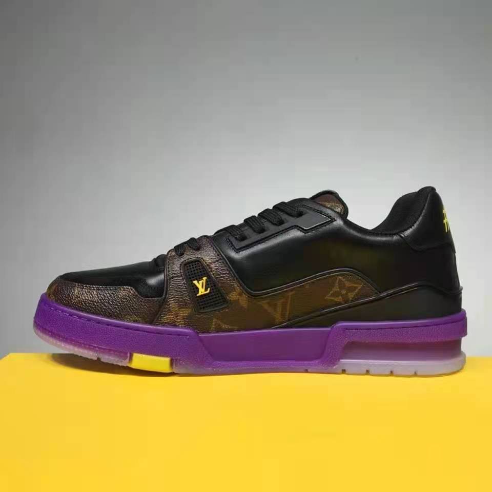 • This version of the iconic LV Trainer sneaker combines Monogram canvas with black calf leather. It features distinctive detailing in yellow rubber. including a #54 signature at the back. which refers to 1854. the year Louis Vuitton was founded.
