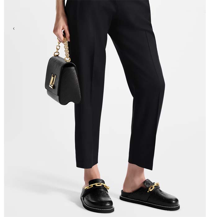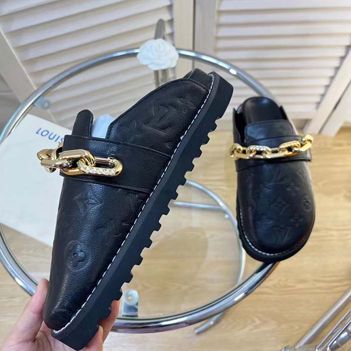 - The LV Cosy flat comfort clog comes in soft calf leather. which is embossed all over with the iconic Monogram pattern.