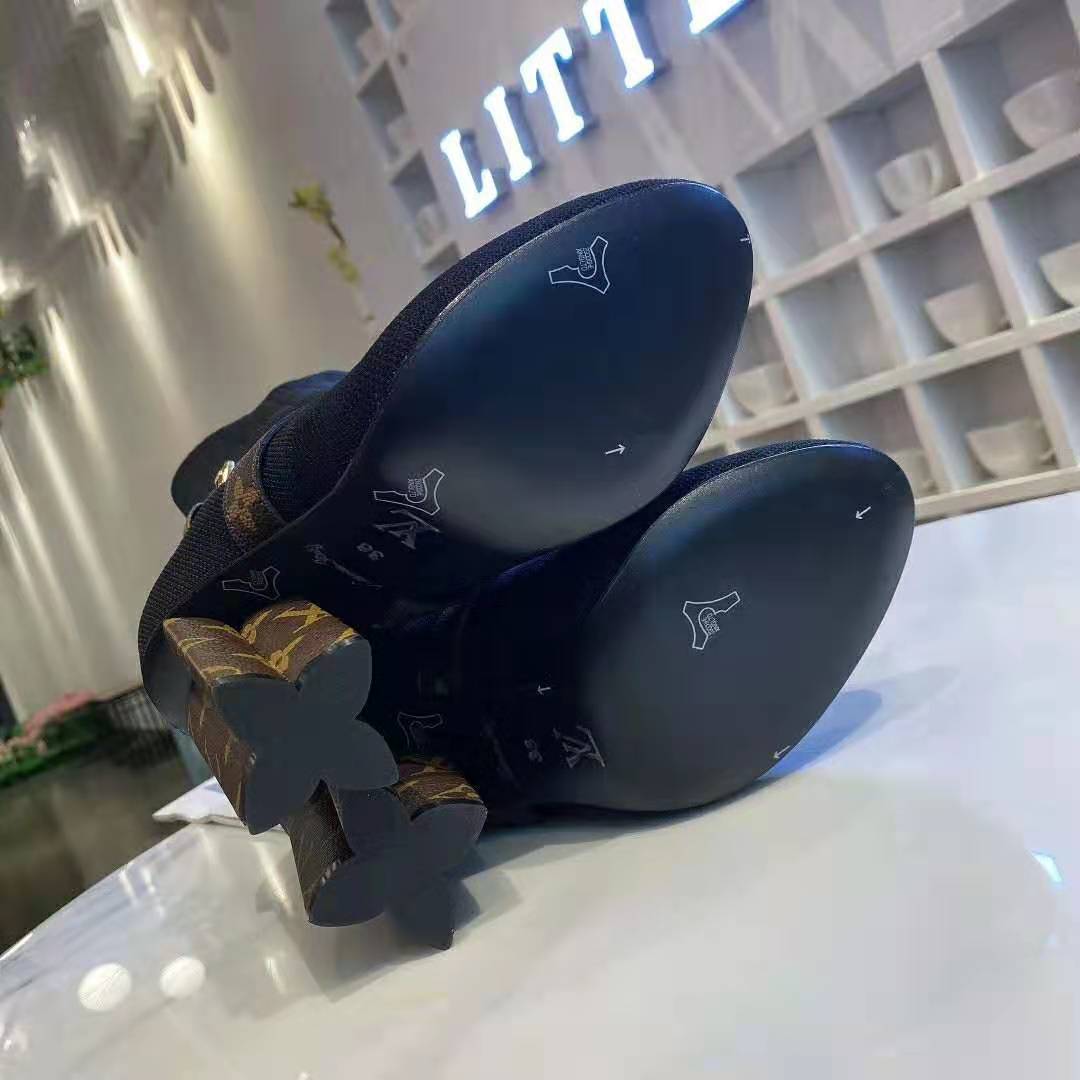 - This design is complemented by Monogram-canvas trim on the straps which cross over the foot and on the Monogram Flower-shaped heel. which is a key signature of the Louis Vuitton shoe collection.