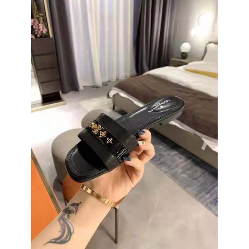 - Elegant yet easy to wear. the Revival flat mule features a wide front strap in soft black calf leather with tonal glazed calf-leather trim.