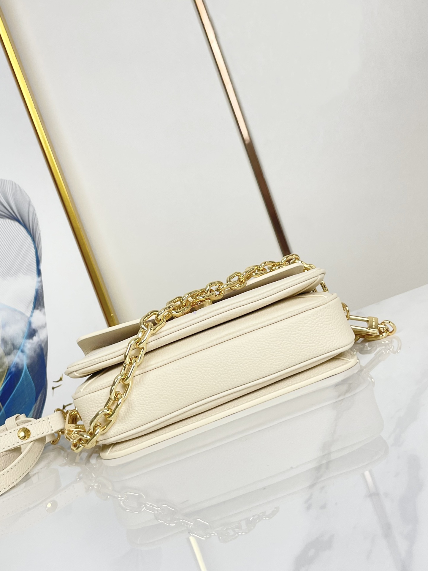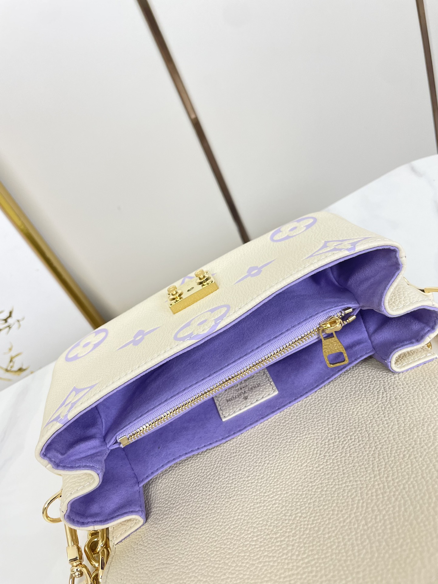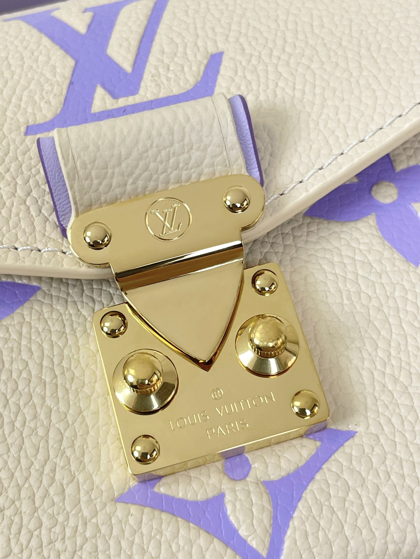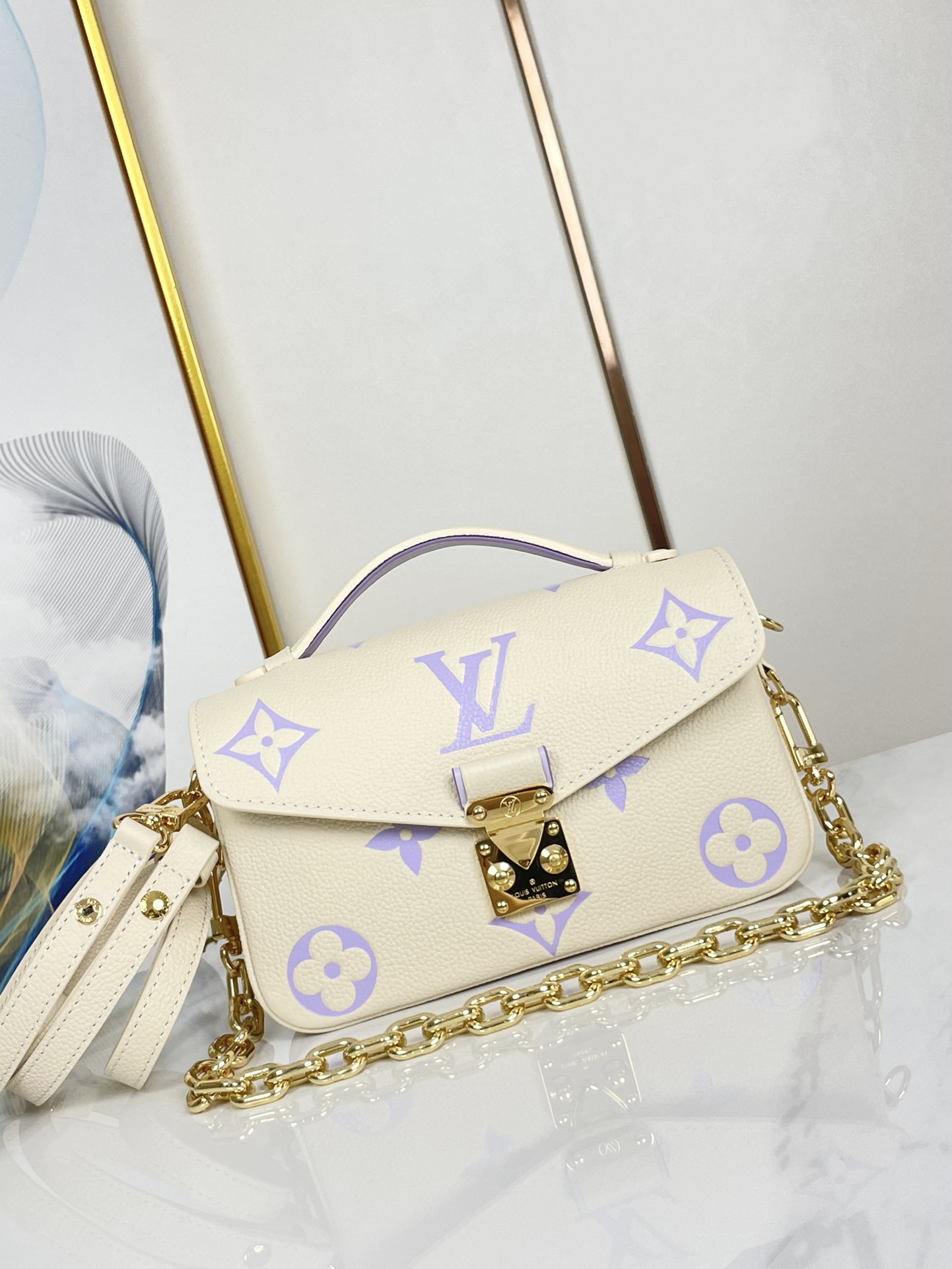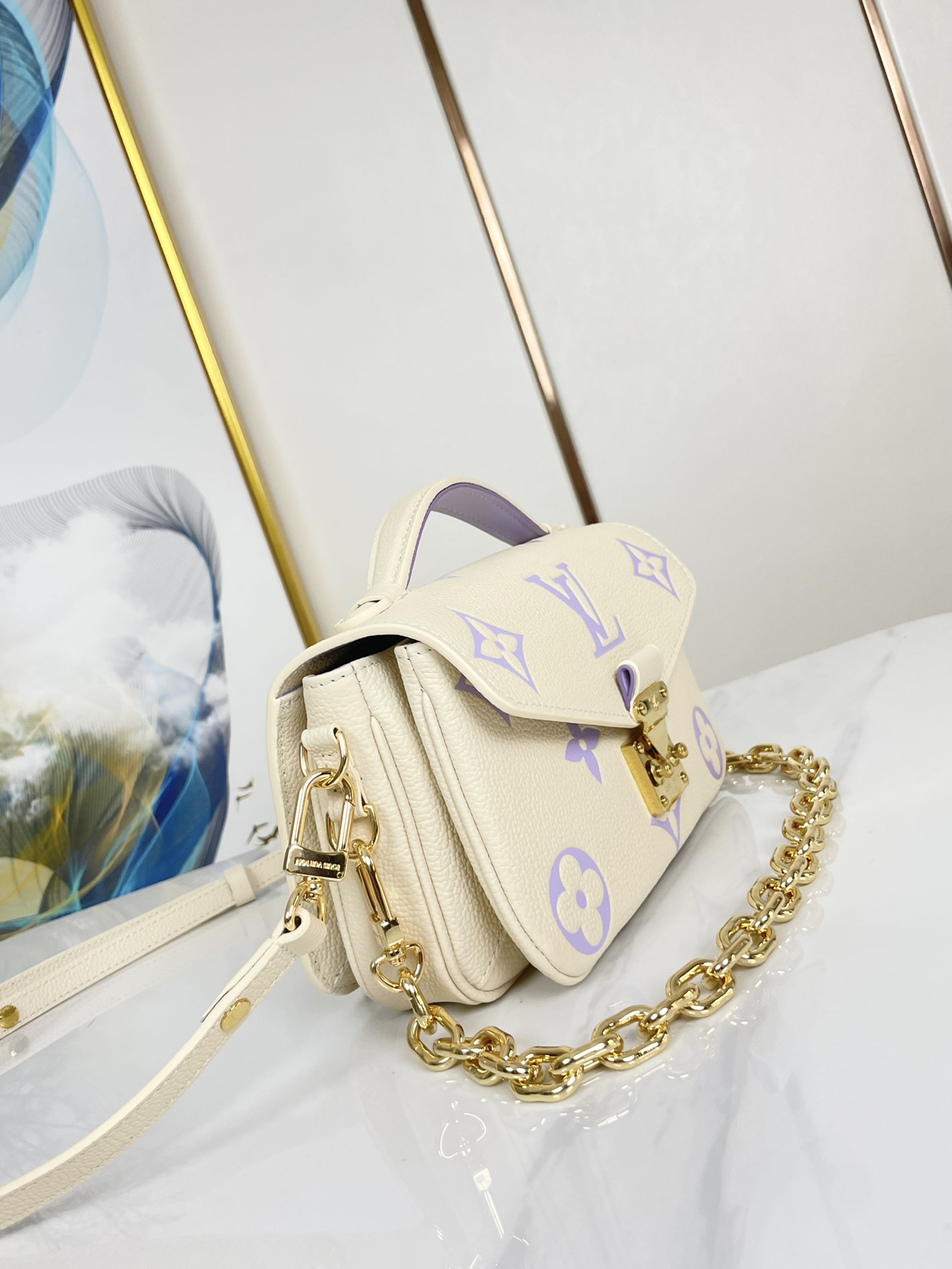Part of the Milky Way capsule, the two-color Monogram Empreinte leather of this Pochette Métis East West handbag features a luminous off-white base with the Monogram motif embossed and then printed on the leather in a muted pastel tone. The Pochette Métis has a leather handle, a removable chain, and a detachable strap for carry options.