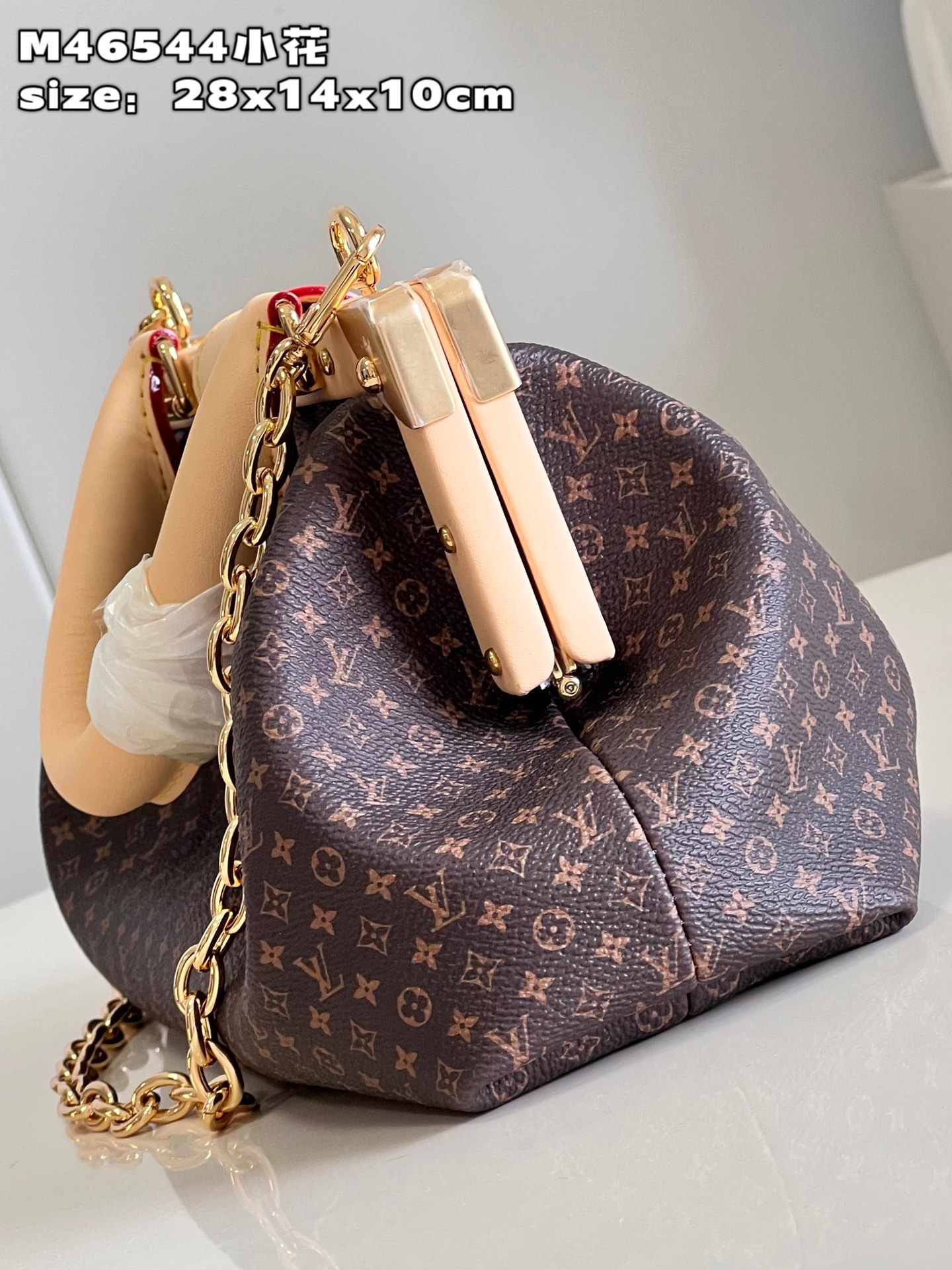 Seen at the Spring-Summer 2023 show, the Monogram Clutch is fashioned from Monogram canvas with natural calfskin trim and gold-color hardware, including the classic Louis Vuitton S-lock and the riveted clasp with metallic corners. In addition to the rolled-leather top handle, there’s a removable chain, attached to retractable, rotating chain mounts.
