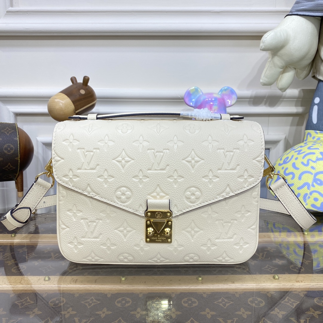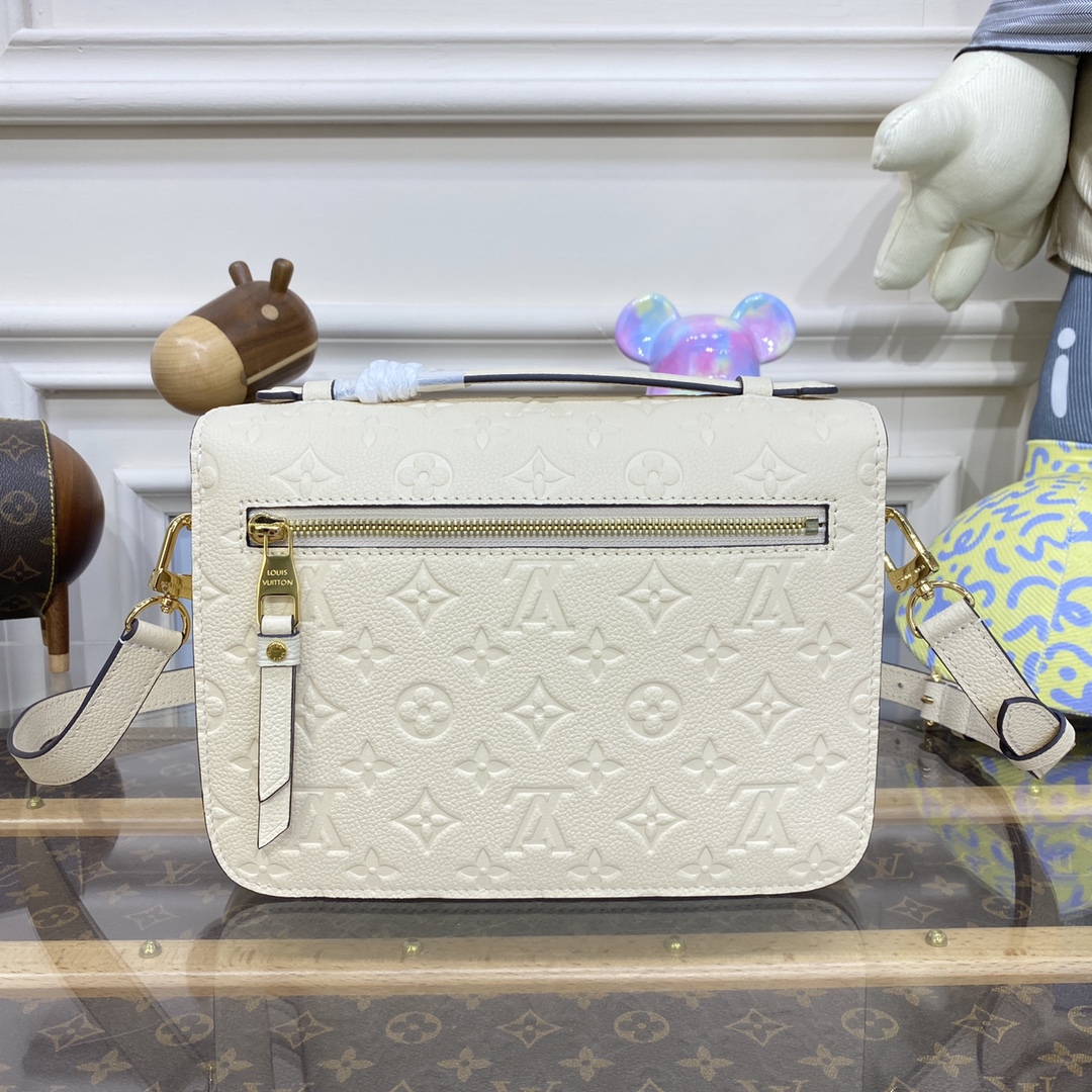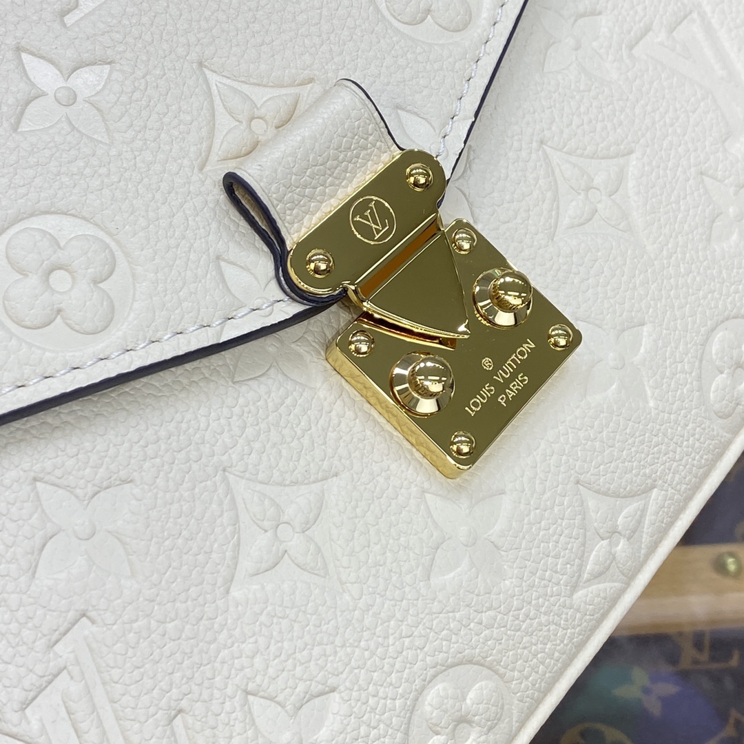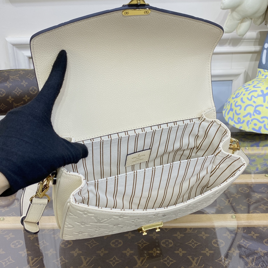 The Pochette Métis handbag, with its classic satchel silhouette, looks luminous in cream-color Monogram Empreinte leather with a matching microfiber lining. The discreet Monogram pattern embossed into the leather and the gold-color hardware, including the S-lock closure, give a modern elegance to this distinctive bag