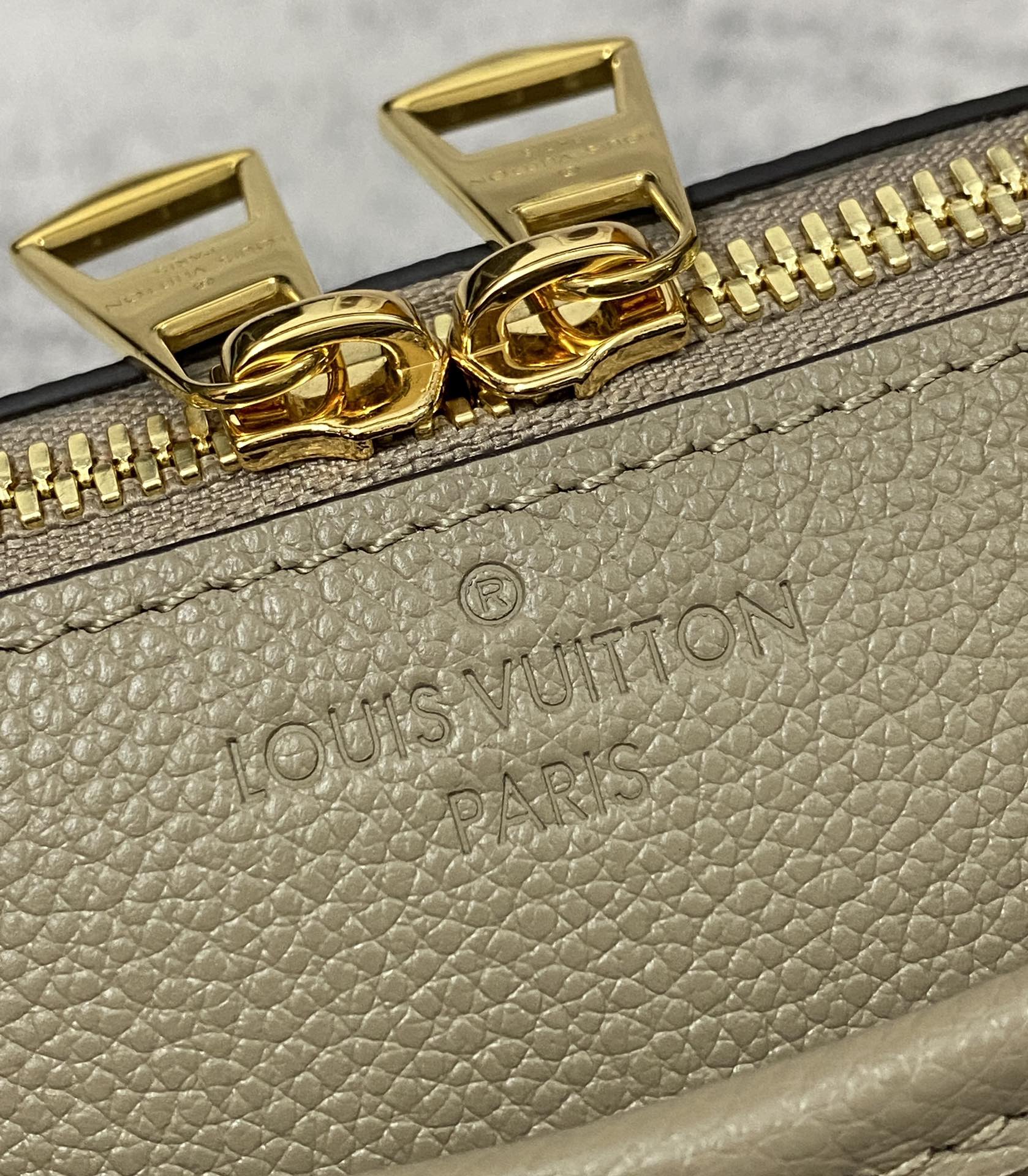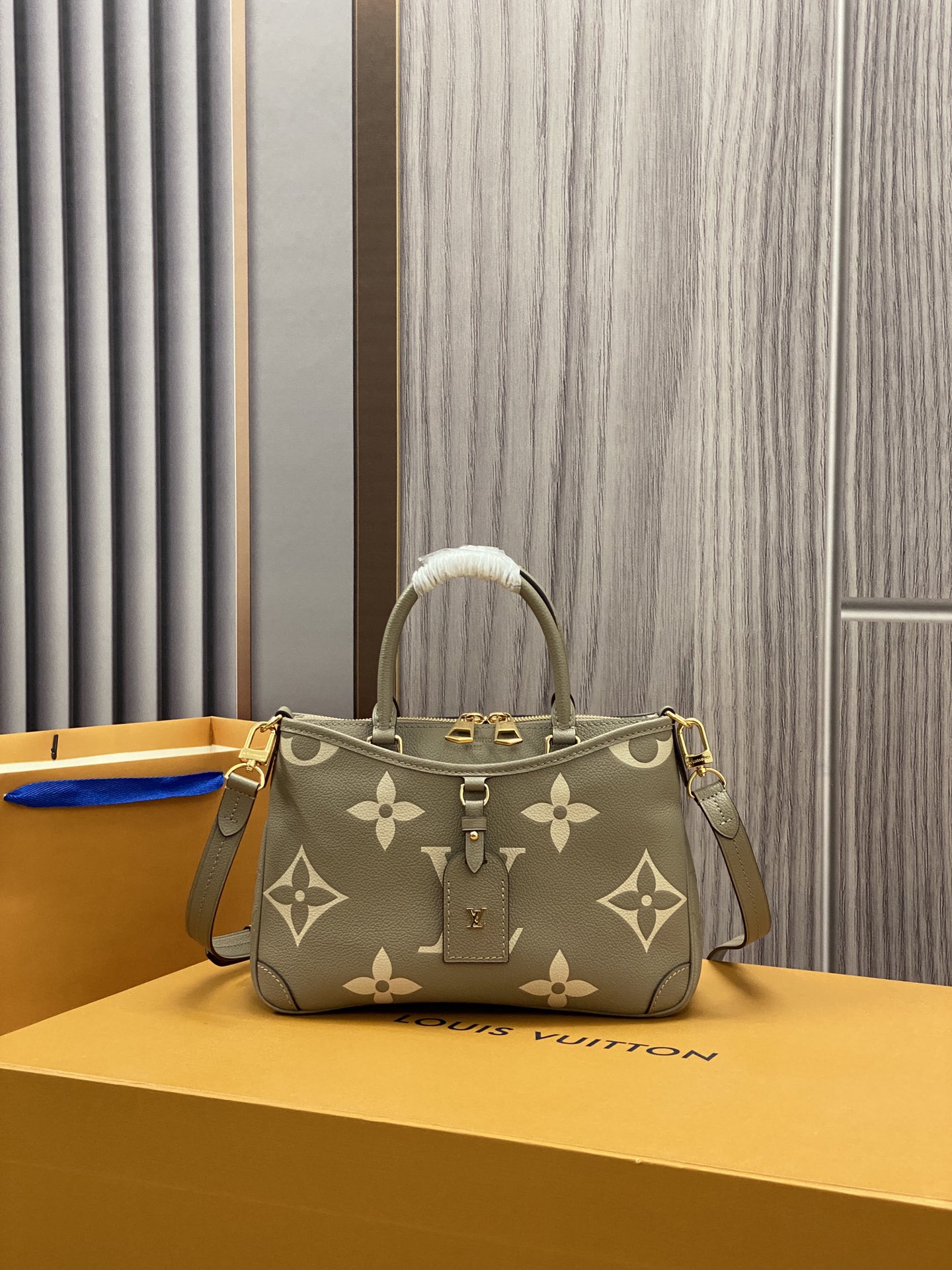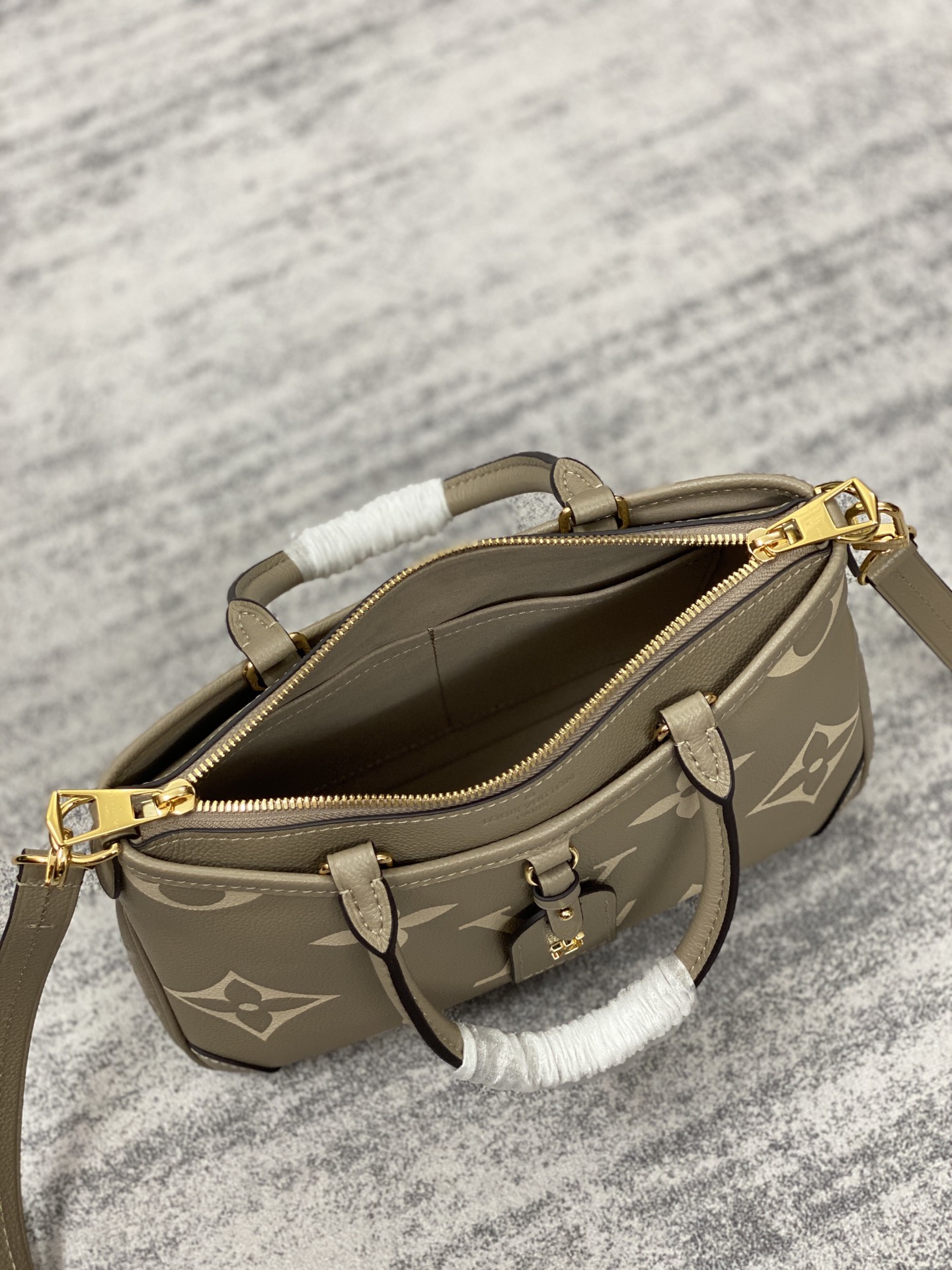 The Trianon PM tote, with its distinctive V-cut silhouette, is made from grained Monogram Empreinte leather with the Monogram Flowers and LVs embossed then printed on the leather in a soft cream tone. A long adjustable and removable strap, in addition to the two top handles, give carry options.