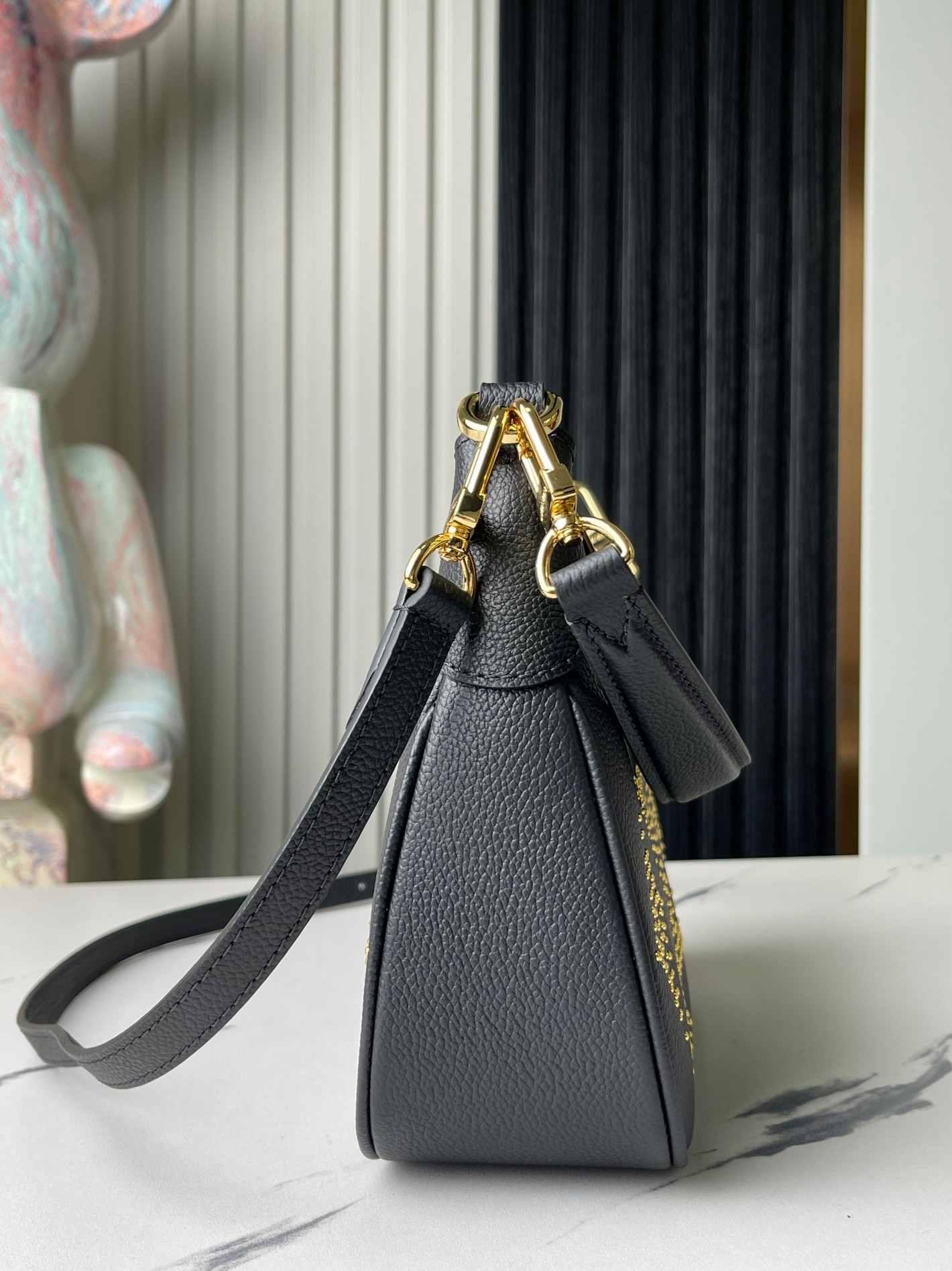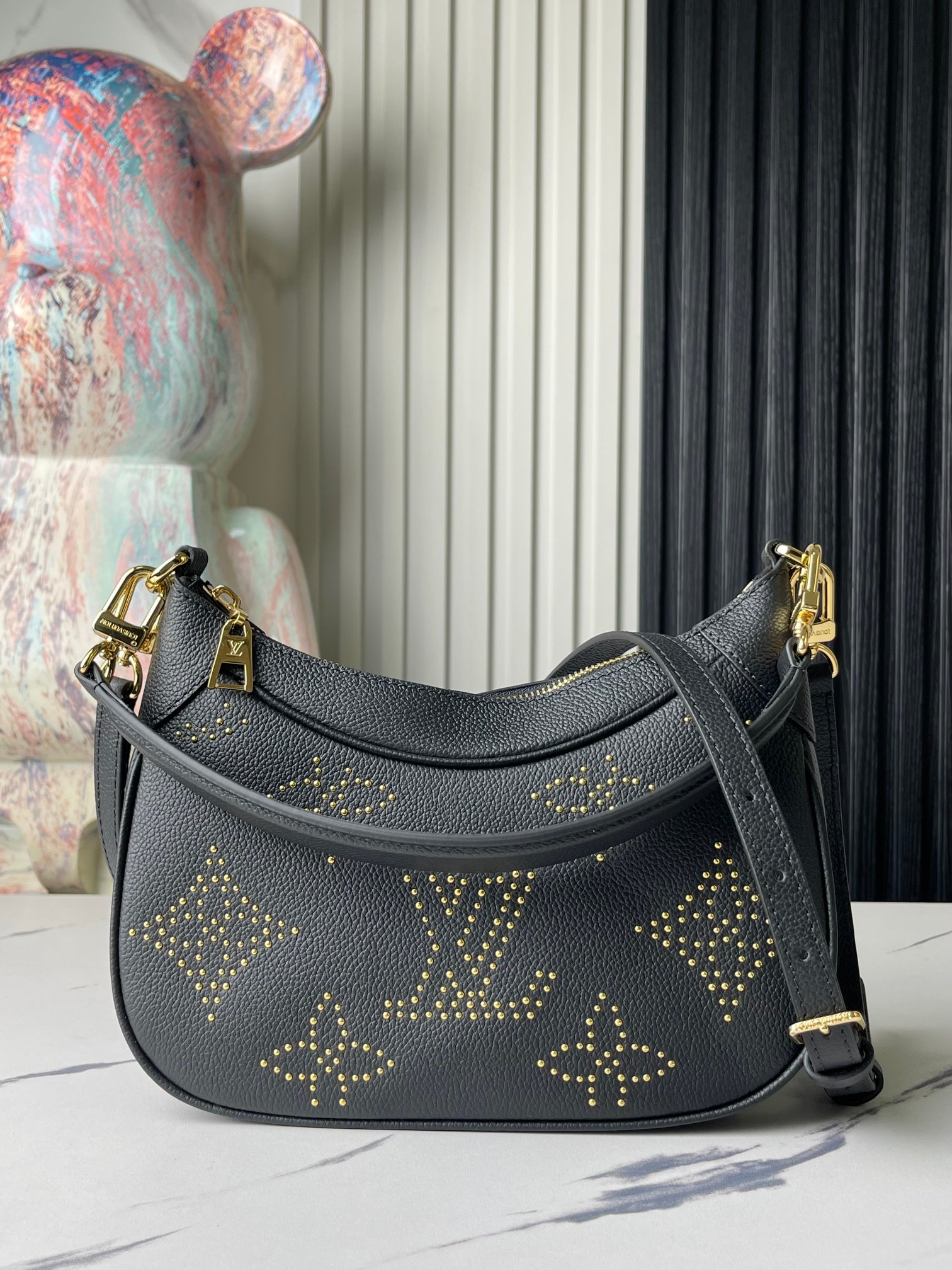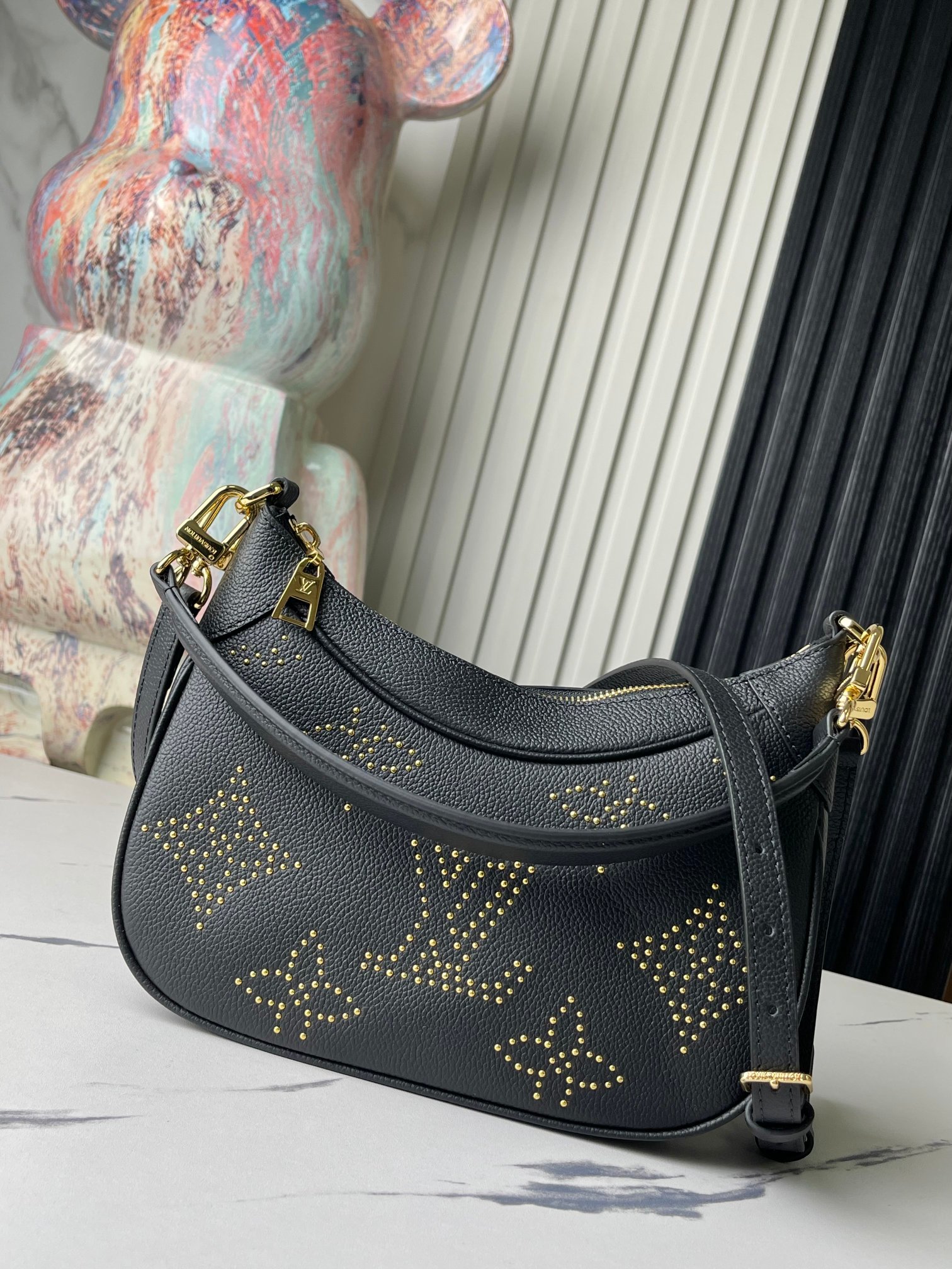 This rock-chic version of the Bagatelle handbag is made from Monogram Empreinte leather, with gold-color studs forming the iconic Monogram pattern. The meticulous process of applying the studs is a testament to the House’s craftsmanship. Each stud is coated with 0.25 microns of gold. There’s a removable handle and a detachable and adjustable strap.