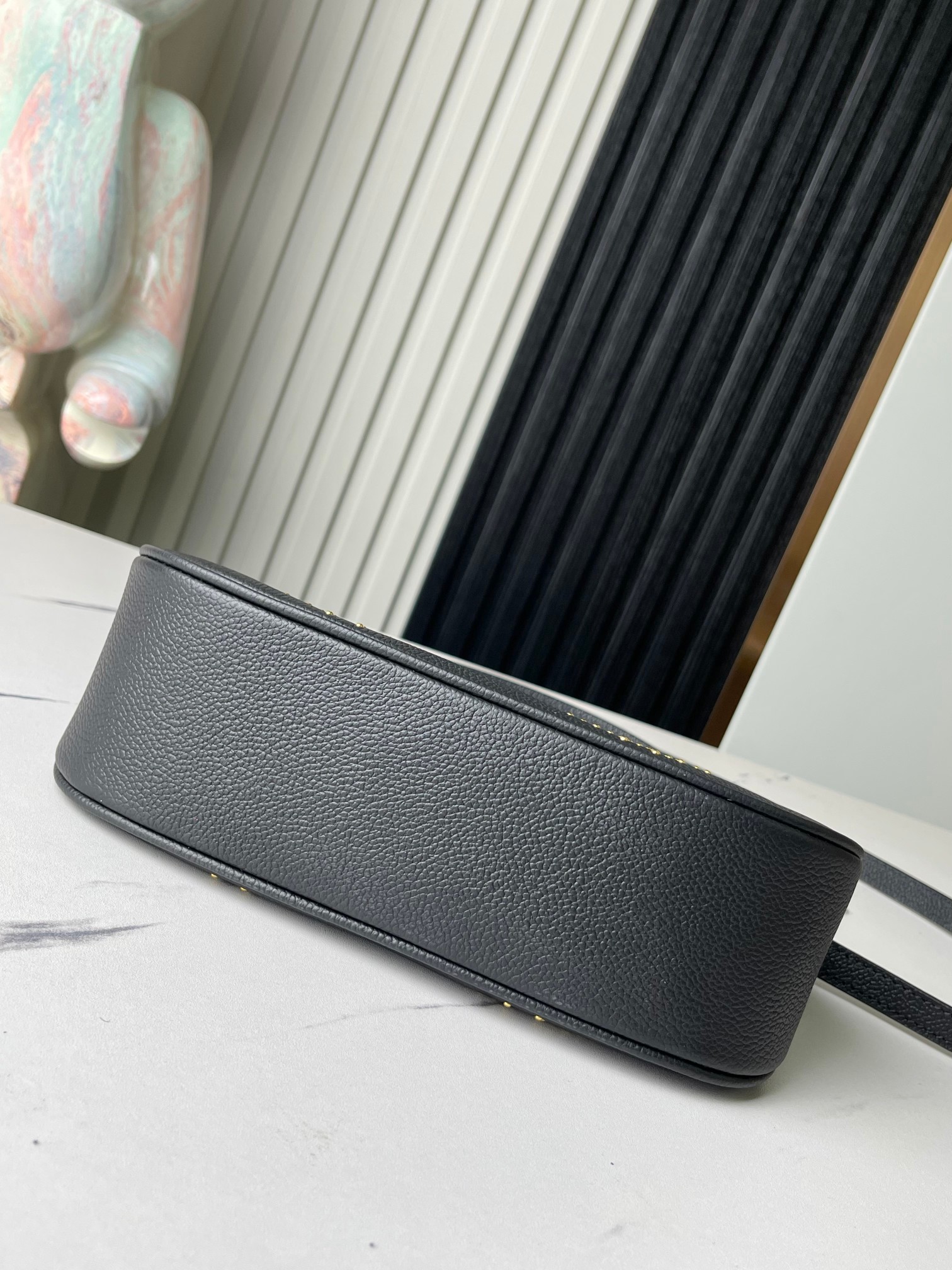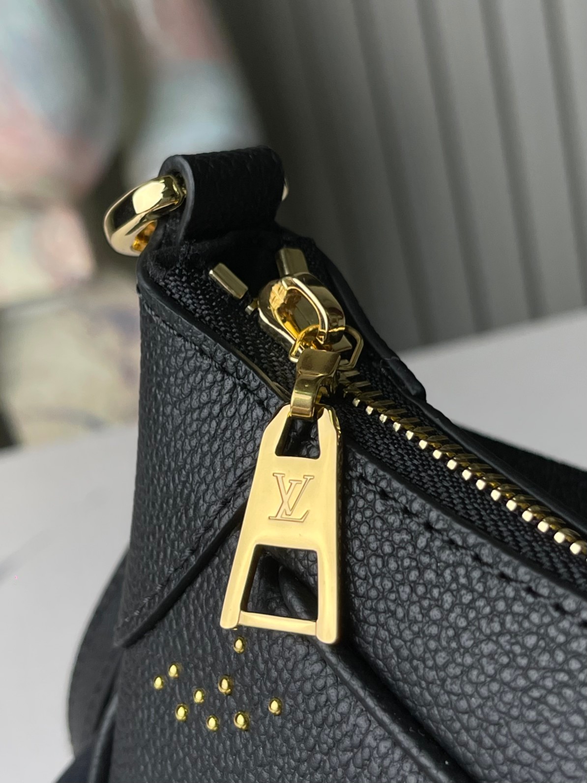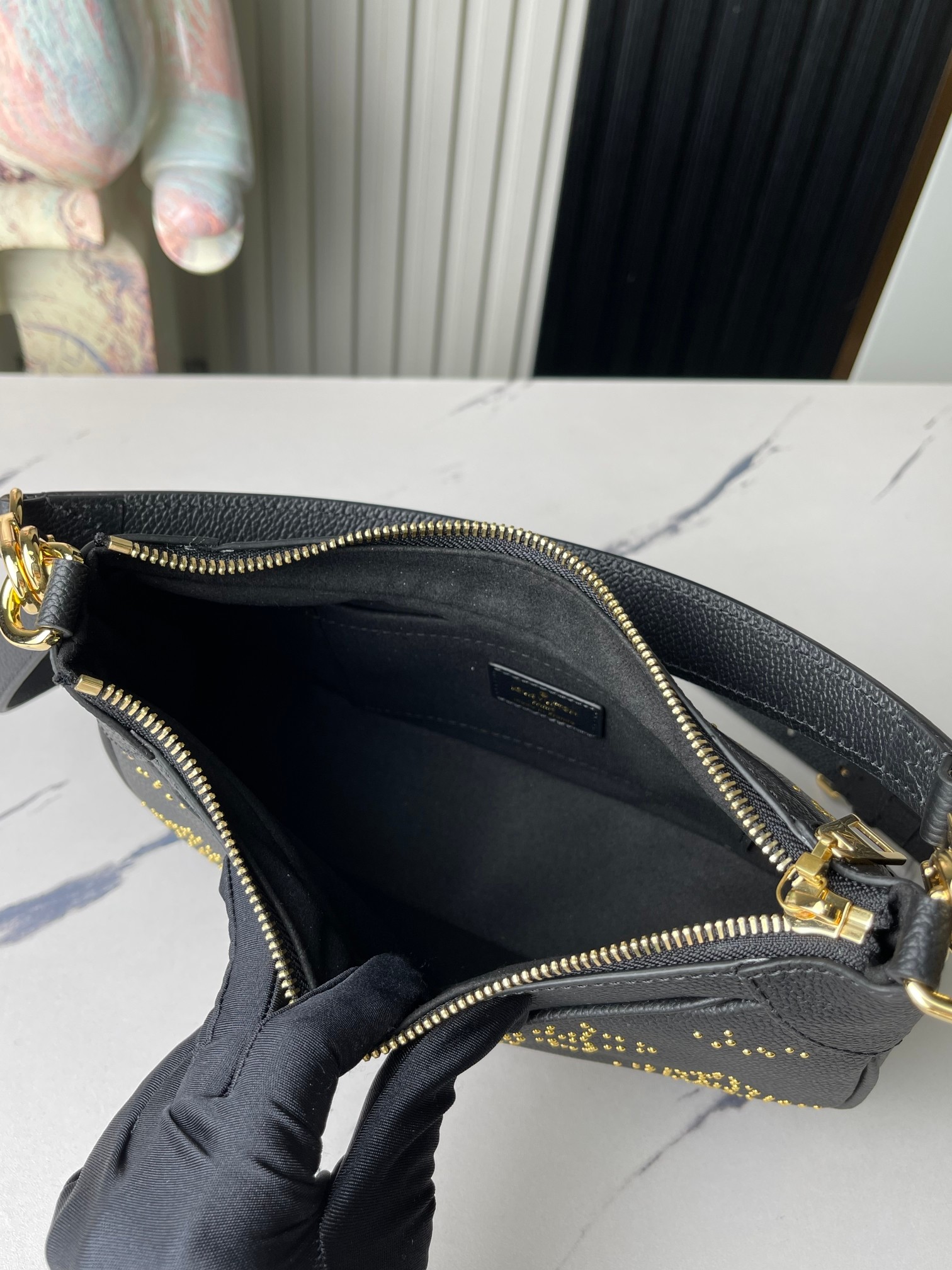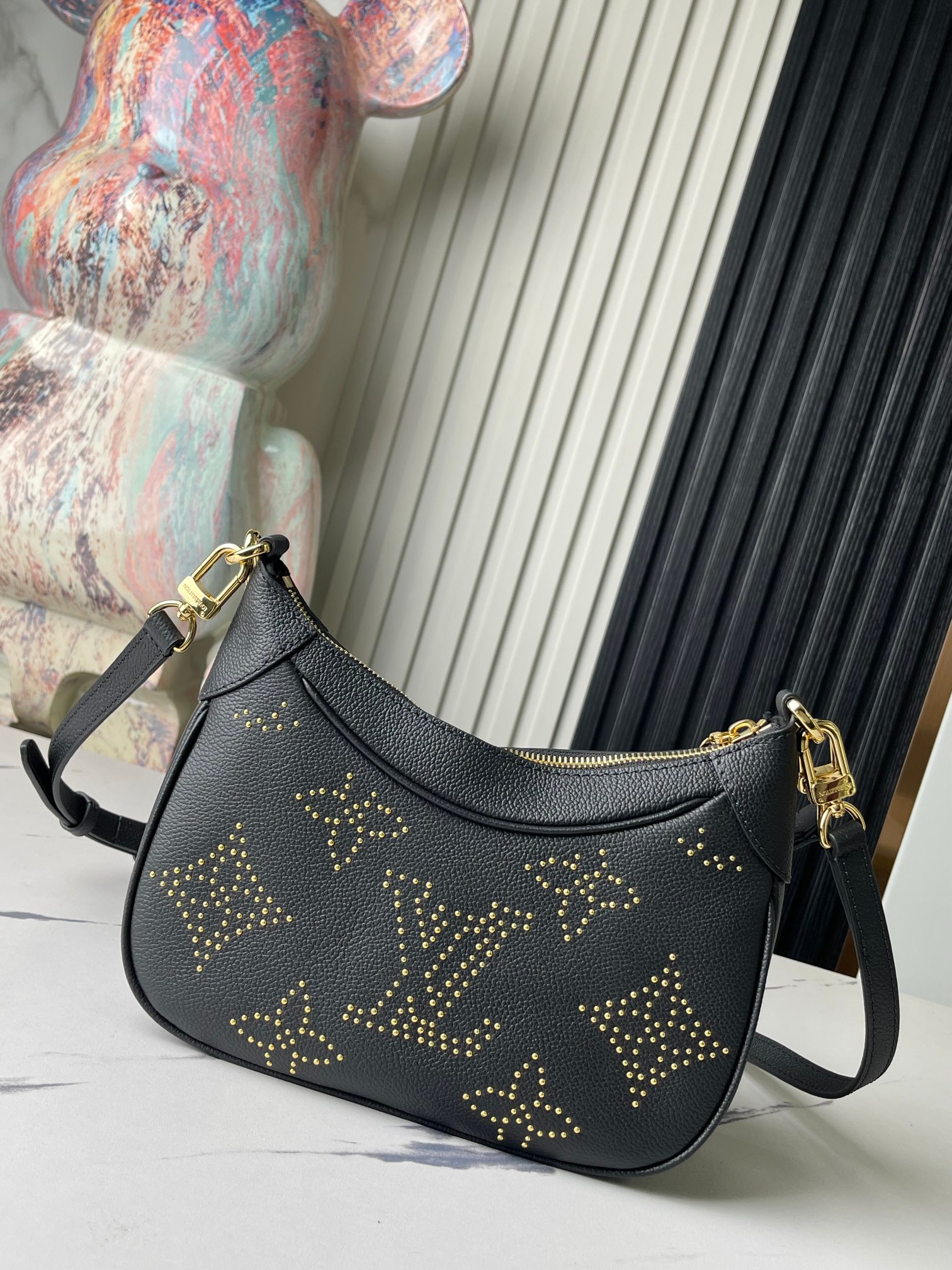 This rock-chic version of the Bagatelle handbag is made from Monogram Empreinte leather, with gold-color studs forming the iconic Monogram pattern. The meticulous process of applying the studs is a testament to the House’s craftsmanship. Each stud is coated with 0.25 microns of gold. There’s a removable handle and a detachable and adjustable strap.