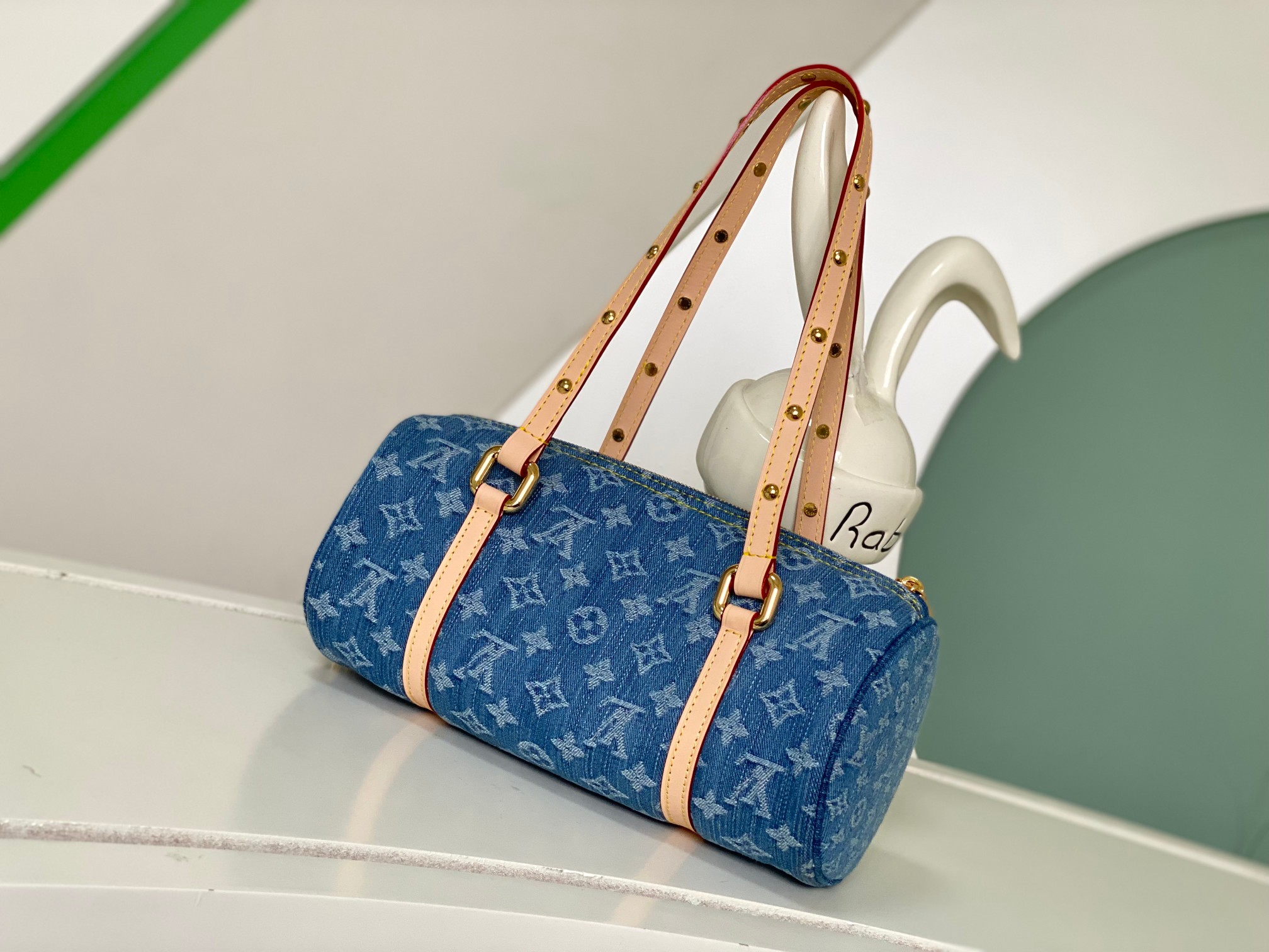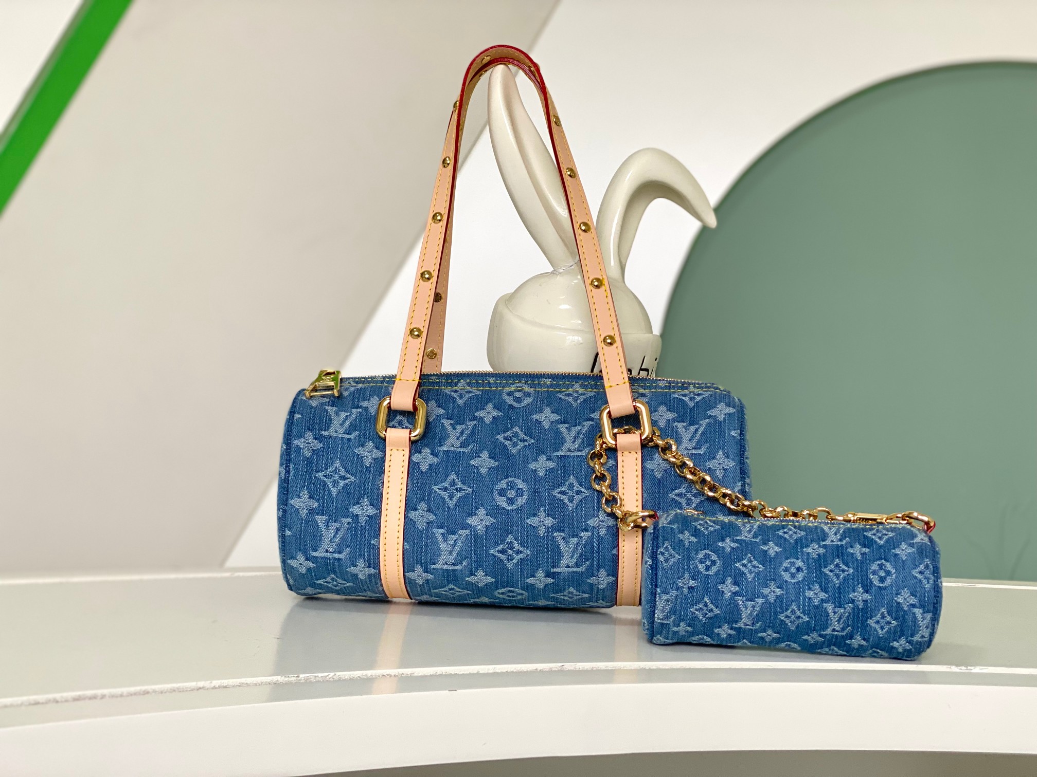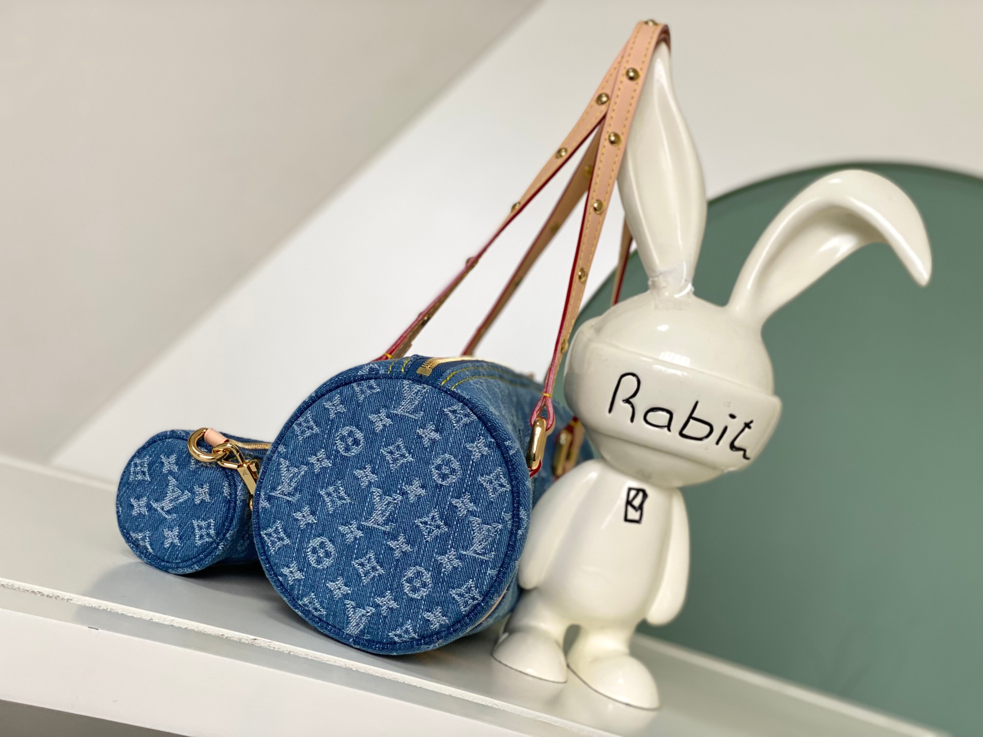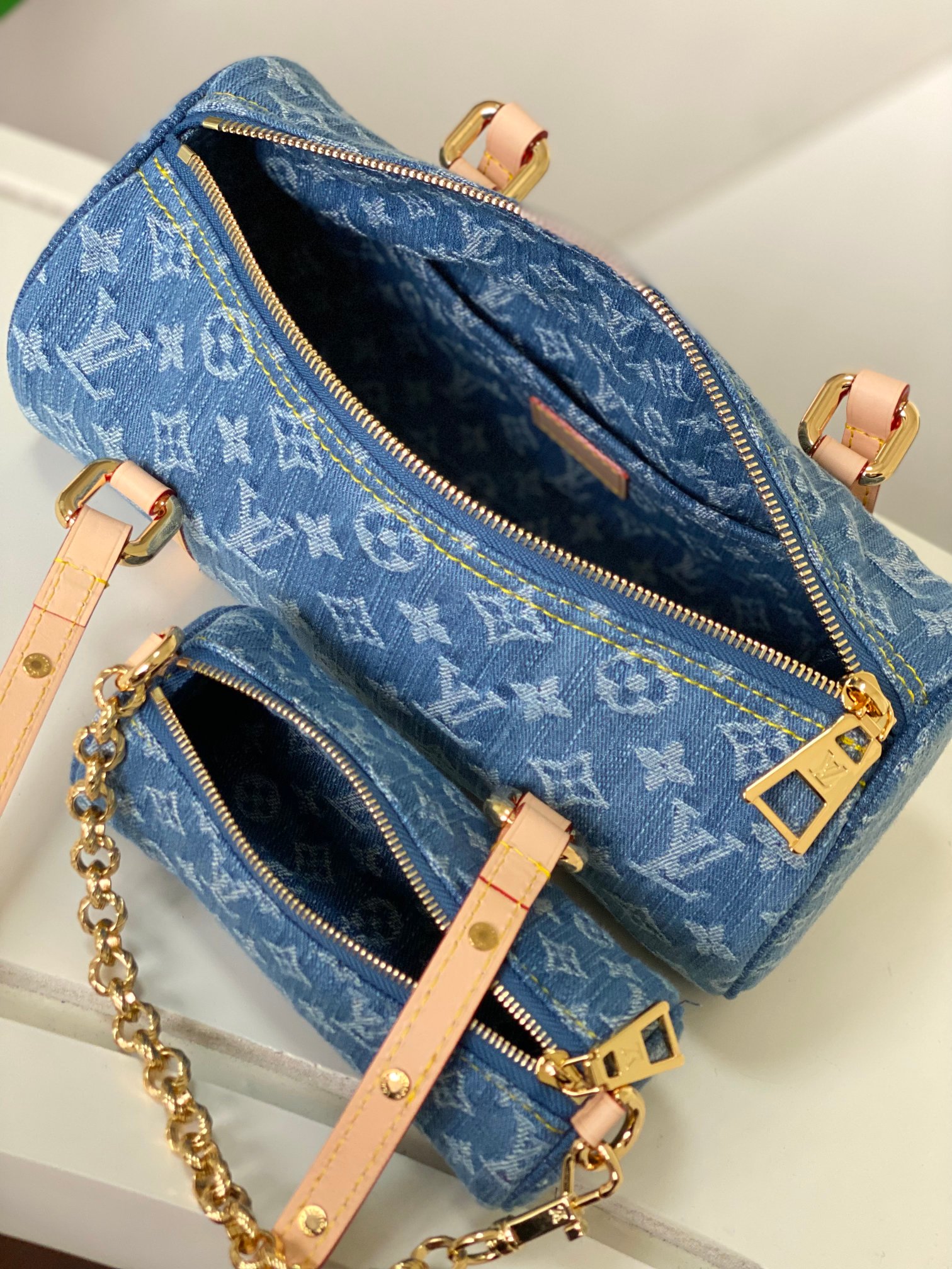 The Papillon handbag is made from Monogram Denim and features a miniature Papillon bag attached to the bag. Monogram Denim is created through a multi-step process that begins by weaving the Monogram motif into the cotton. Next the cotton is bleached and then the bag assembled. Finally the bag is stonewashed, making it unique.