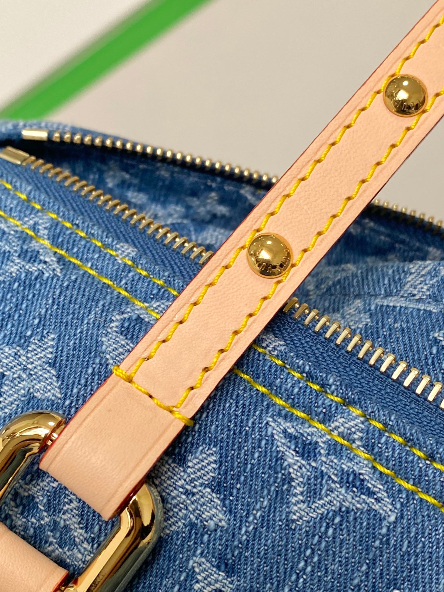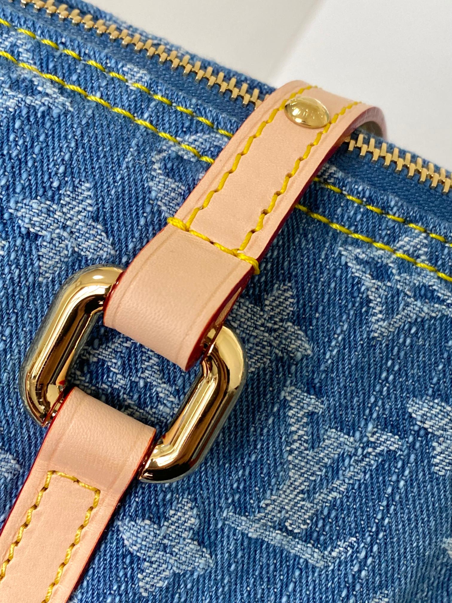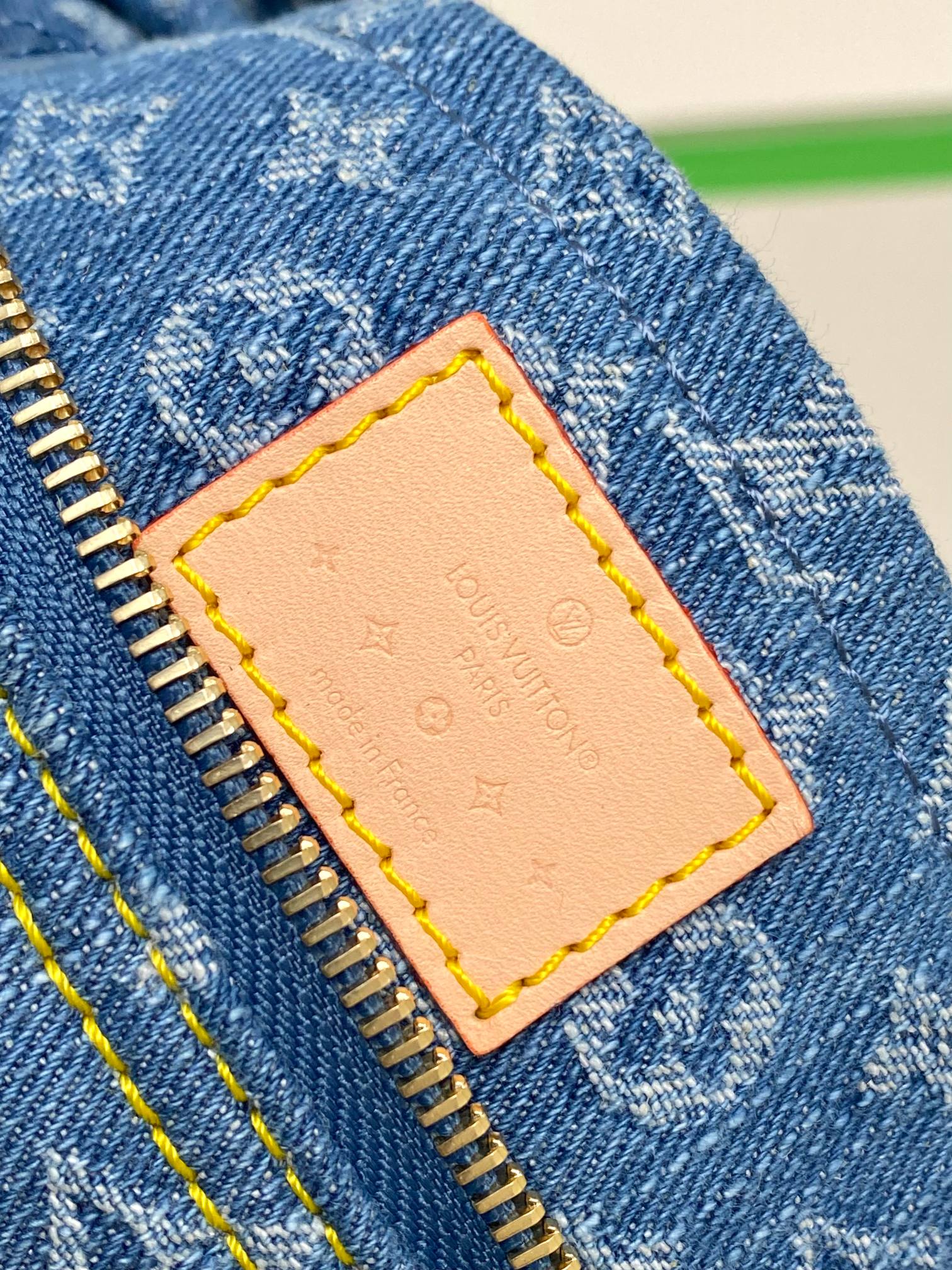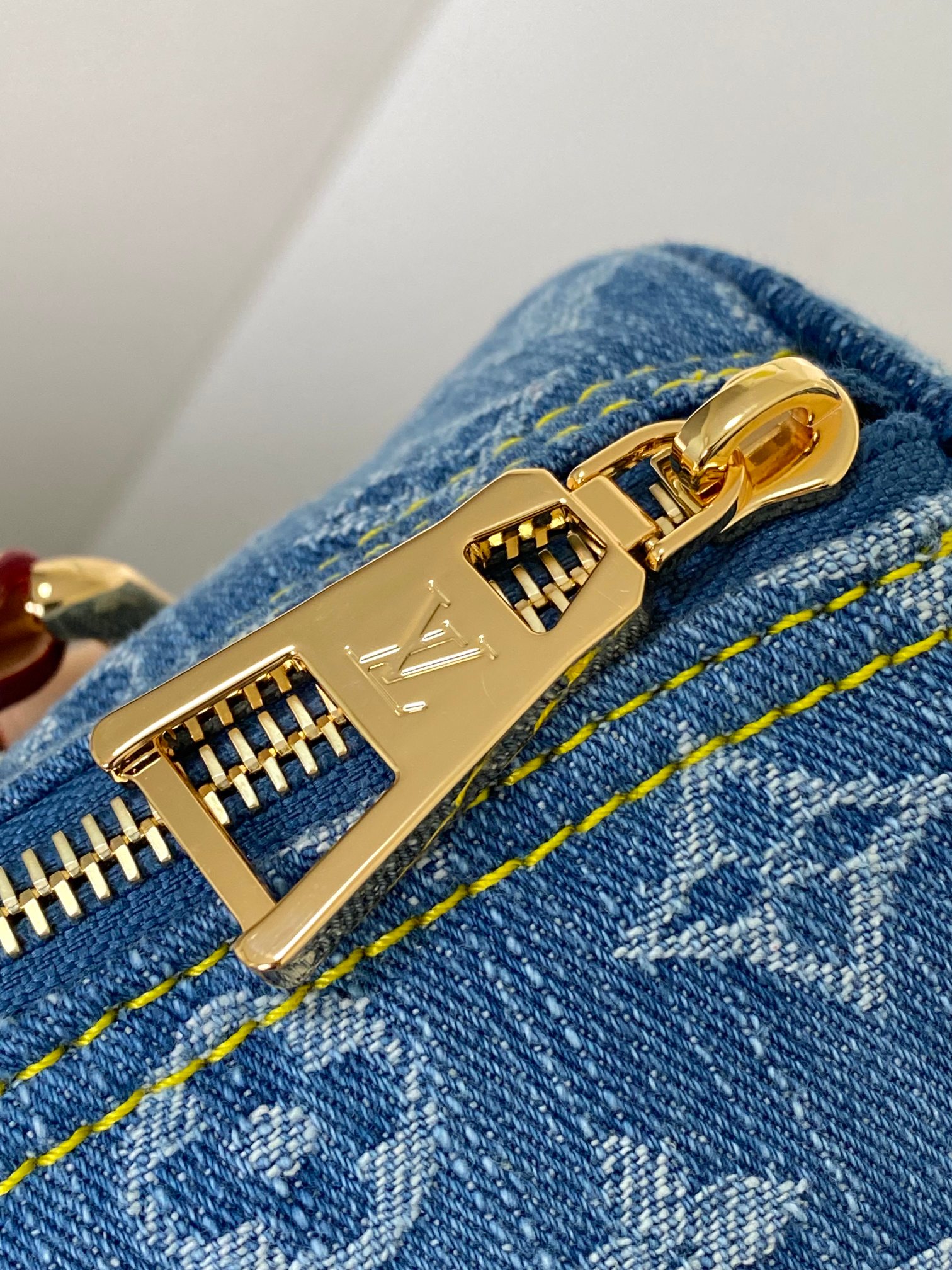 The Papillon handbag is made from Monogram Denim and features a miniature Papillon bag attached to the bag. Monogram Denim is created through a multi-step process that begins by weaving the Monogram motif into the cotton. Next the cotton is bleached and then the bag assembled. Finally the bag is stonewashed, making it unique.