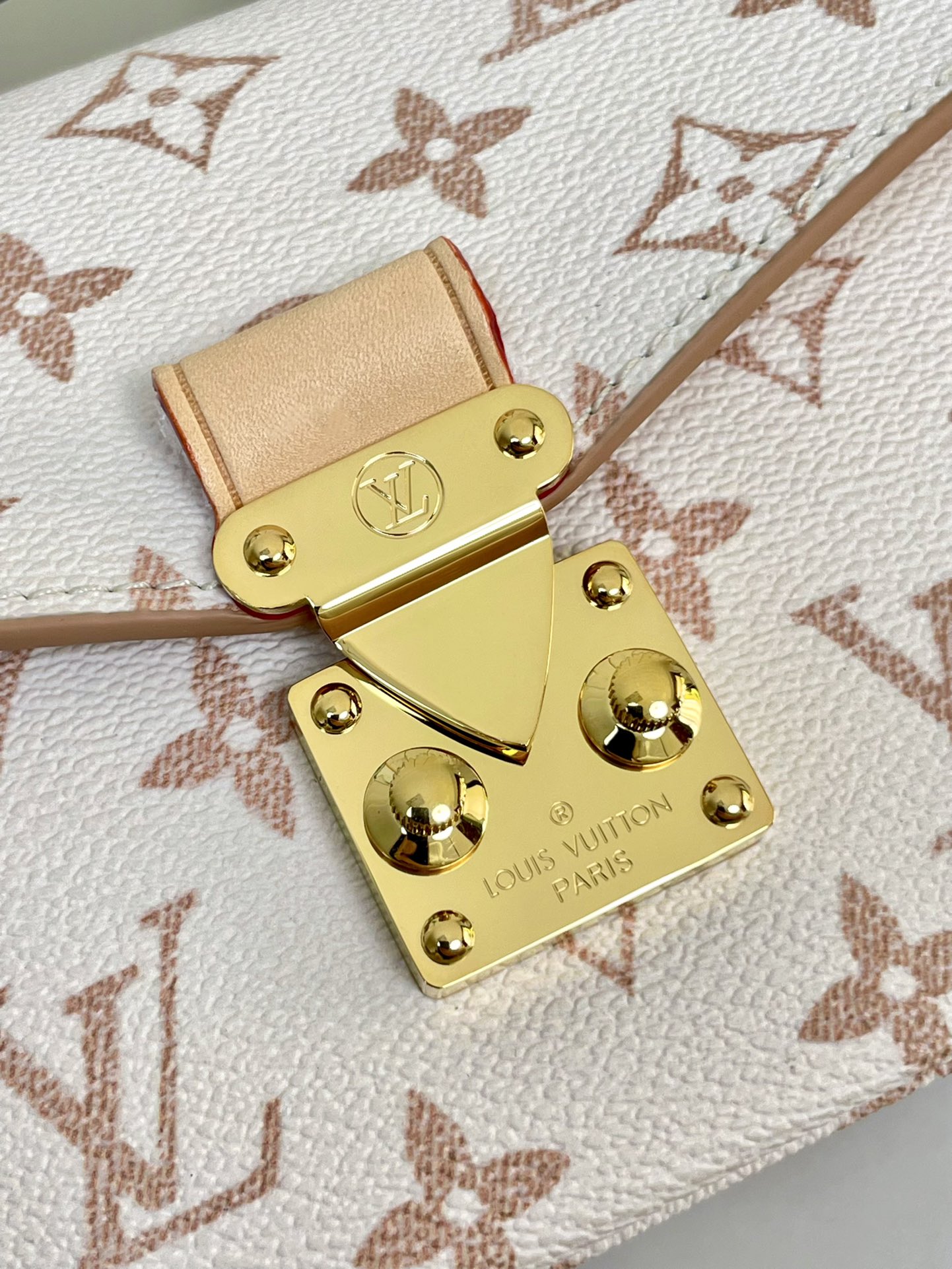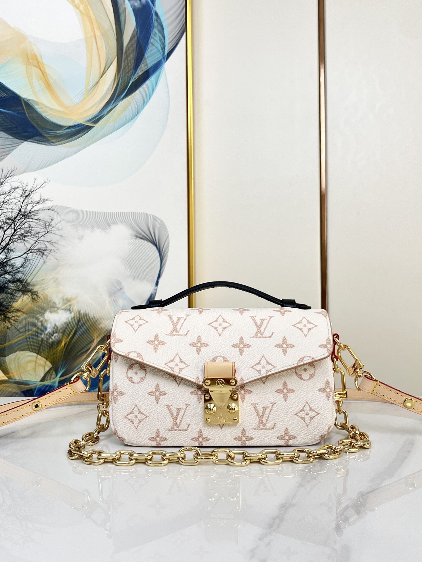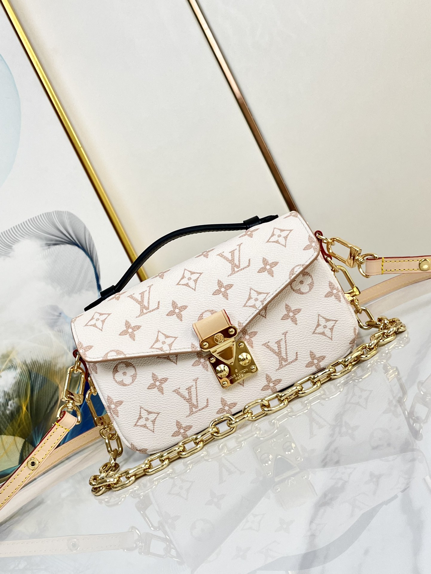 Fresh from Cruise 24, the versatile Pochette Métis East-West handbag showcases a new signature canvas: Monogram Dune. A soft yet strong colorway, the sand-inspired shade brings an air of effortless chic to any ensemble. This east-west model can be styled in a variety of ways, thanks to a leather top handle, detachable chain, and removable leather strap.
