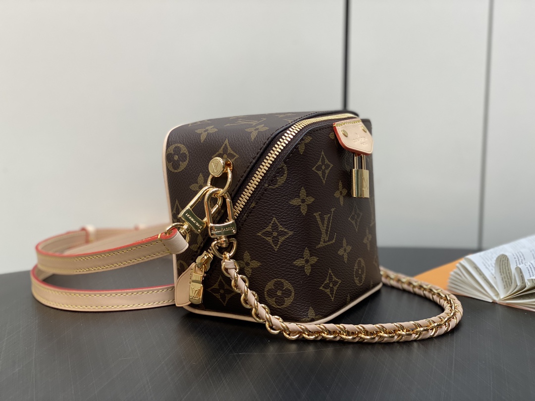 The Maison salutes its travel heritage with the Just In Case handbag. Made from Monogram canvas with natural cowhide-leather trim, this compact model keeps essentials – smartphone, keys, makeup – always close at hand. Detailed with a signature padlock and key bell, the bag is fitted with a leather-braided chain and a leather strap, both removable, for a variety of modern carry options.