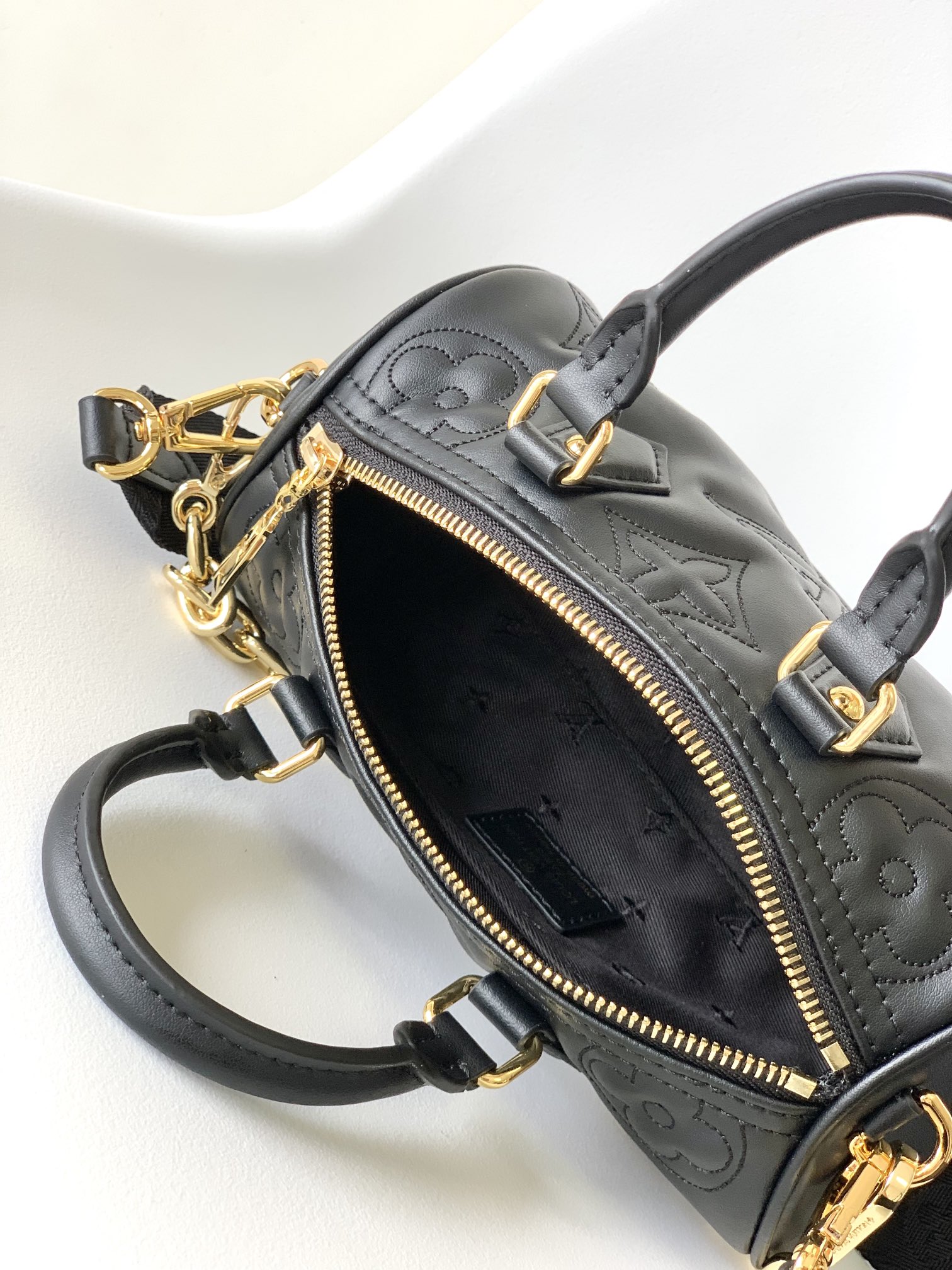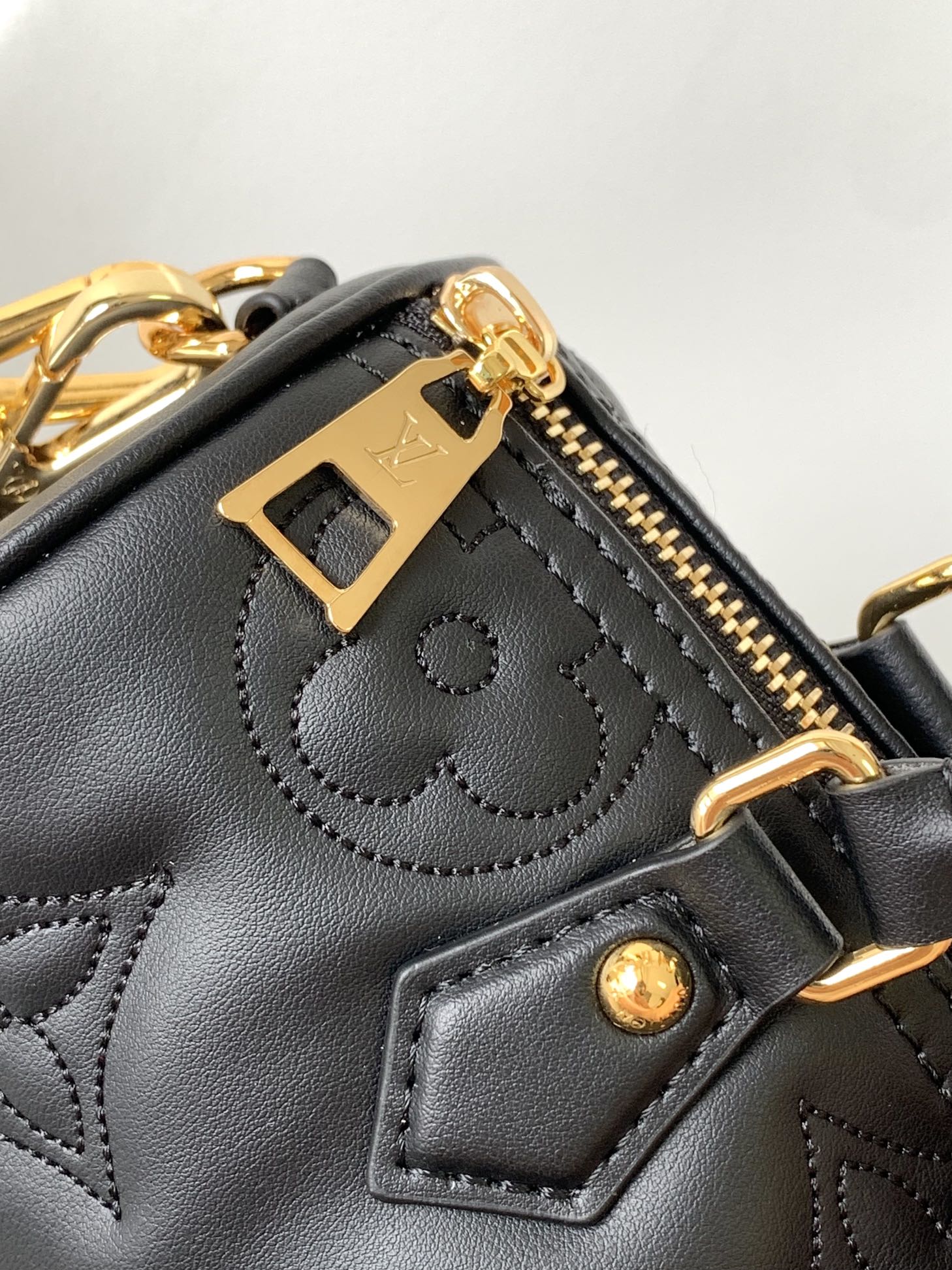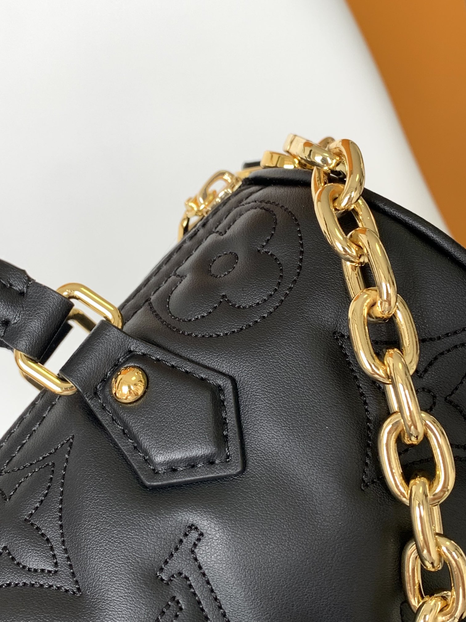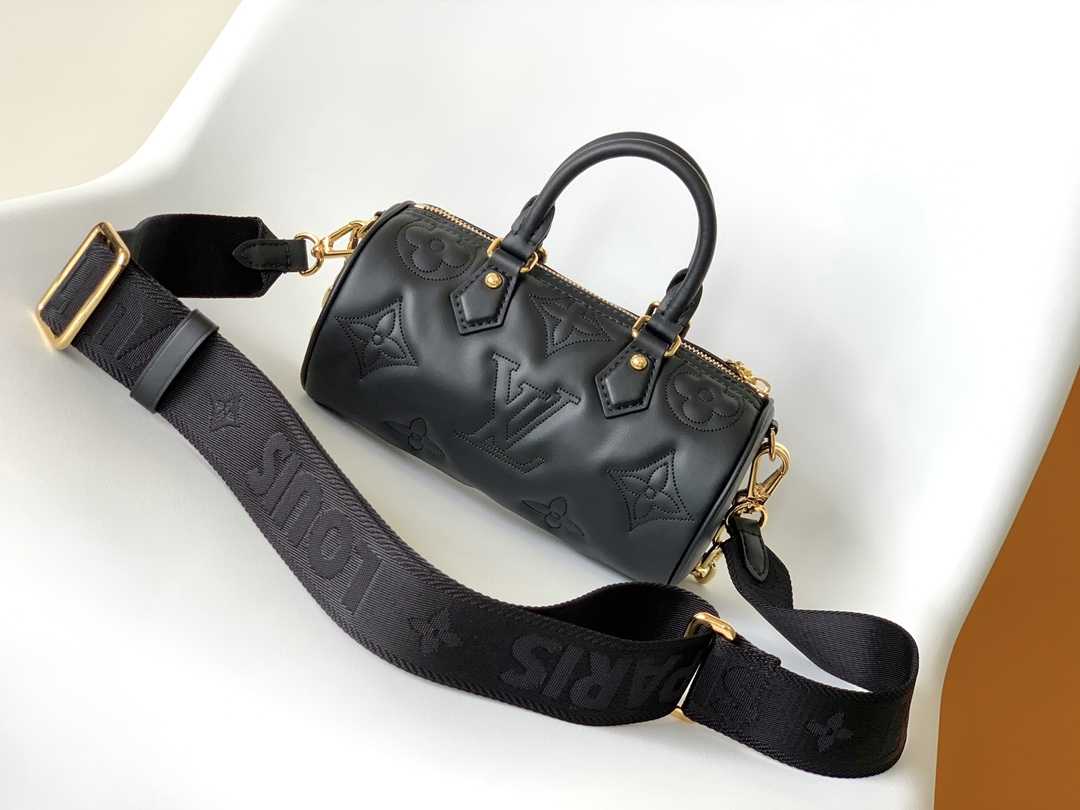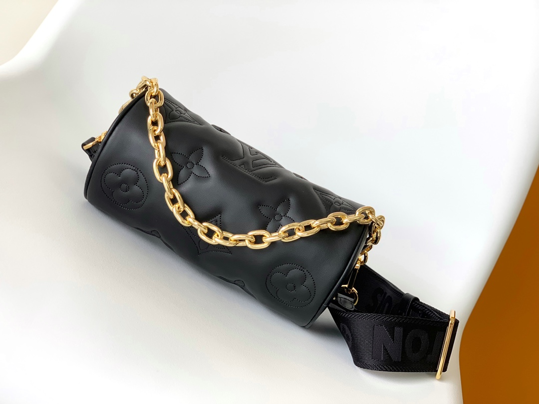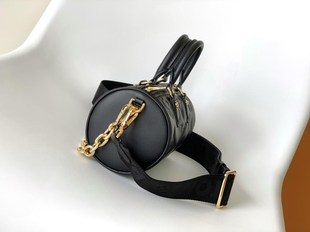 The compact, sporty Papillon BB handbag is made from soft, padded calf leather, embroidered with Louis Vuitton’s classic Monogram pattern. It features a removable gold-color chain in addition to a detachable shoulder strap and rolled leather top handles, enabling multiple ways of carrying the bag.