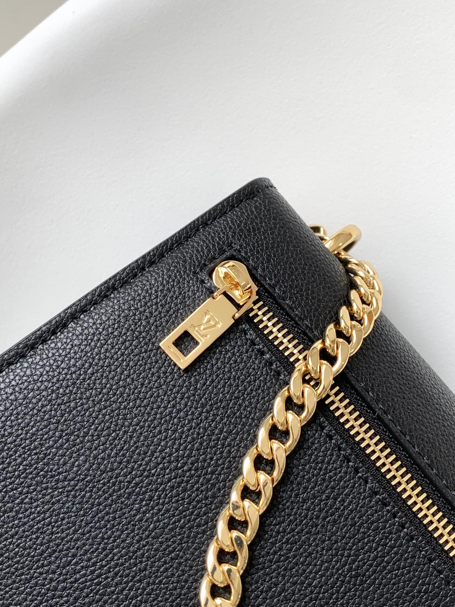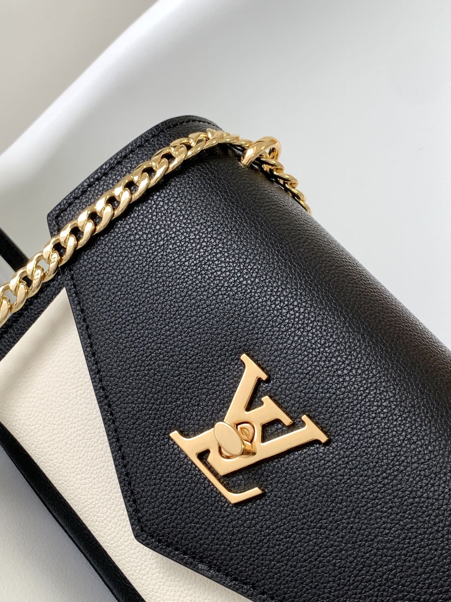 The MyLockMe Chain Bag is made from grained calf-leather in a striking two-tone colorway. With its sliding gold-color chain and gold-color LV Twist lock, this miniature “schoolbag” brings elegance to any hour of the day or night. The long chain strap can be adjusted for short-shoulder carry or worn cross-body.