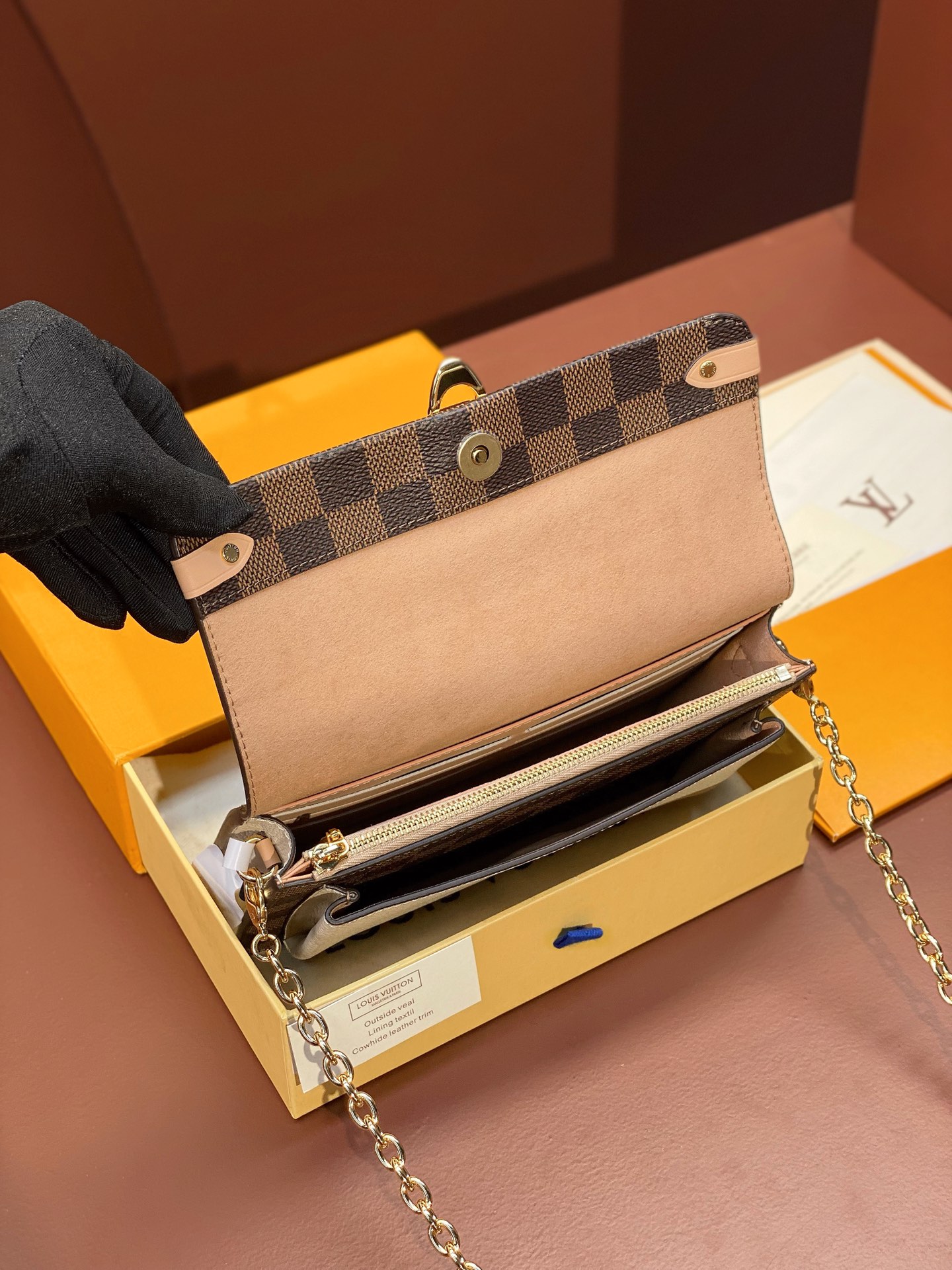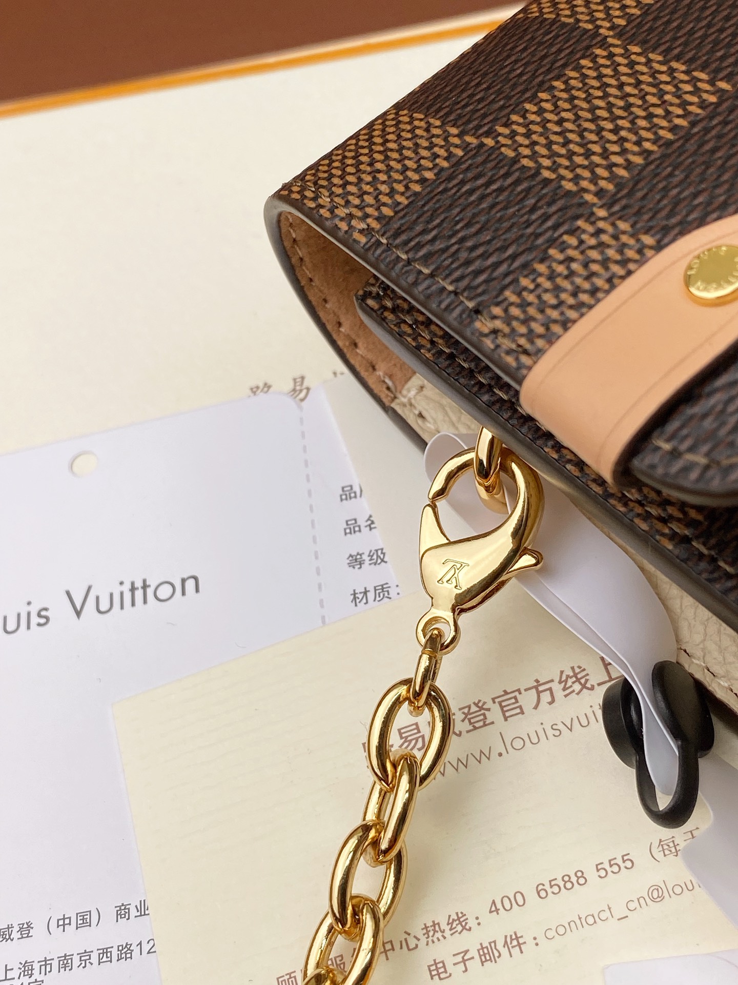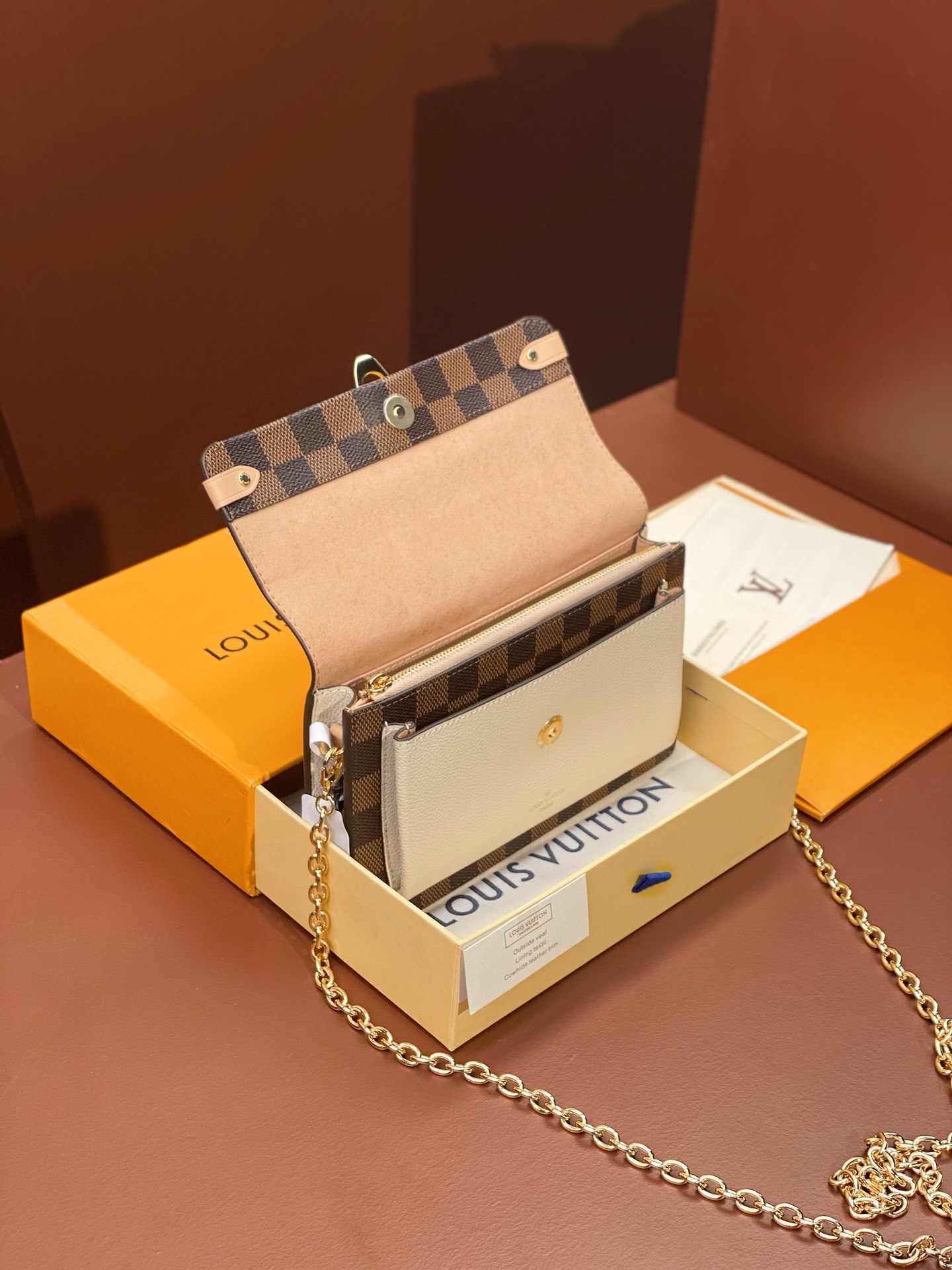 The Vavin chain wallet combines Louis Vuitton’s iconic Damier canvas with colored leather in a smart design that works for day and evening. Its flap, secured with a clasp inspired by the historic trunks, conceals a front pocket which is ideal for a smartphone. Its removable chain enables it to be carried in several different ways.