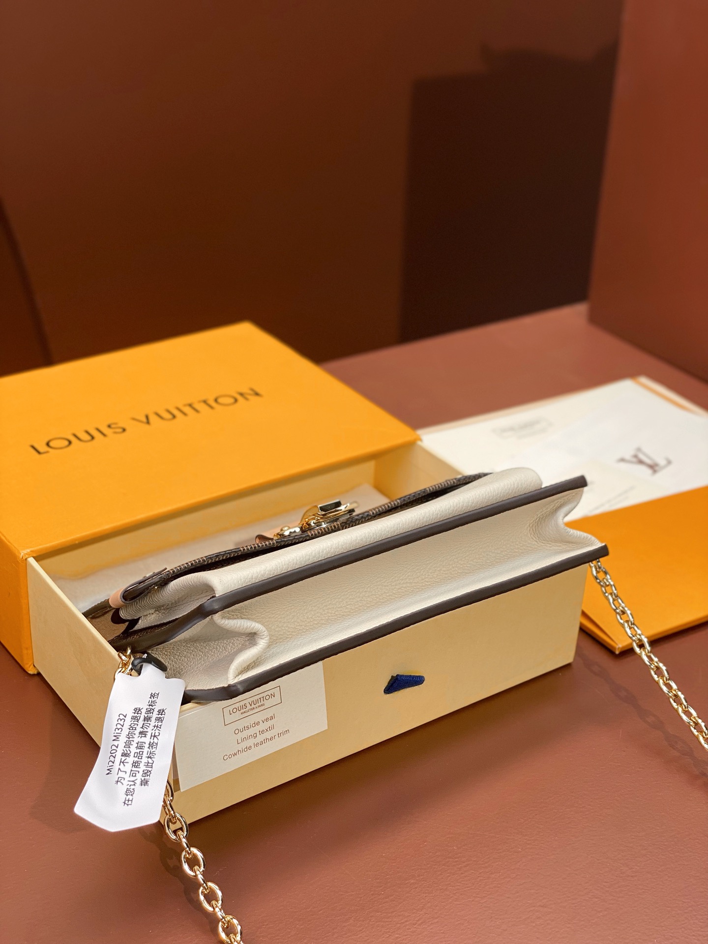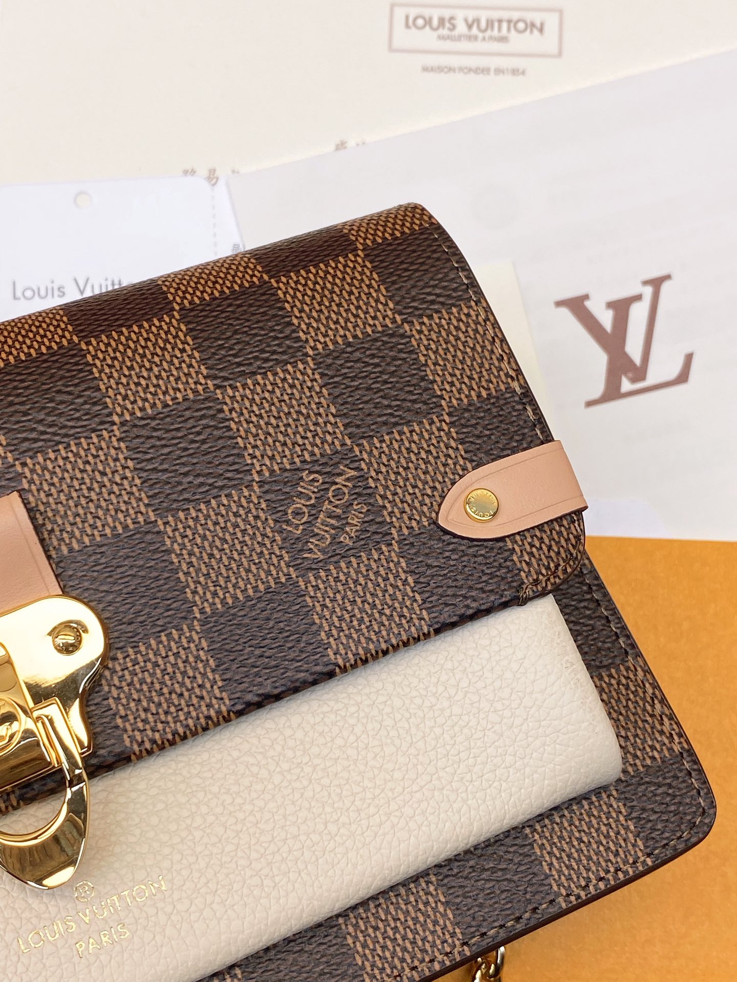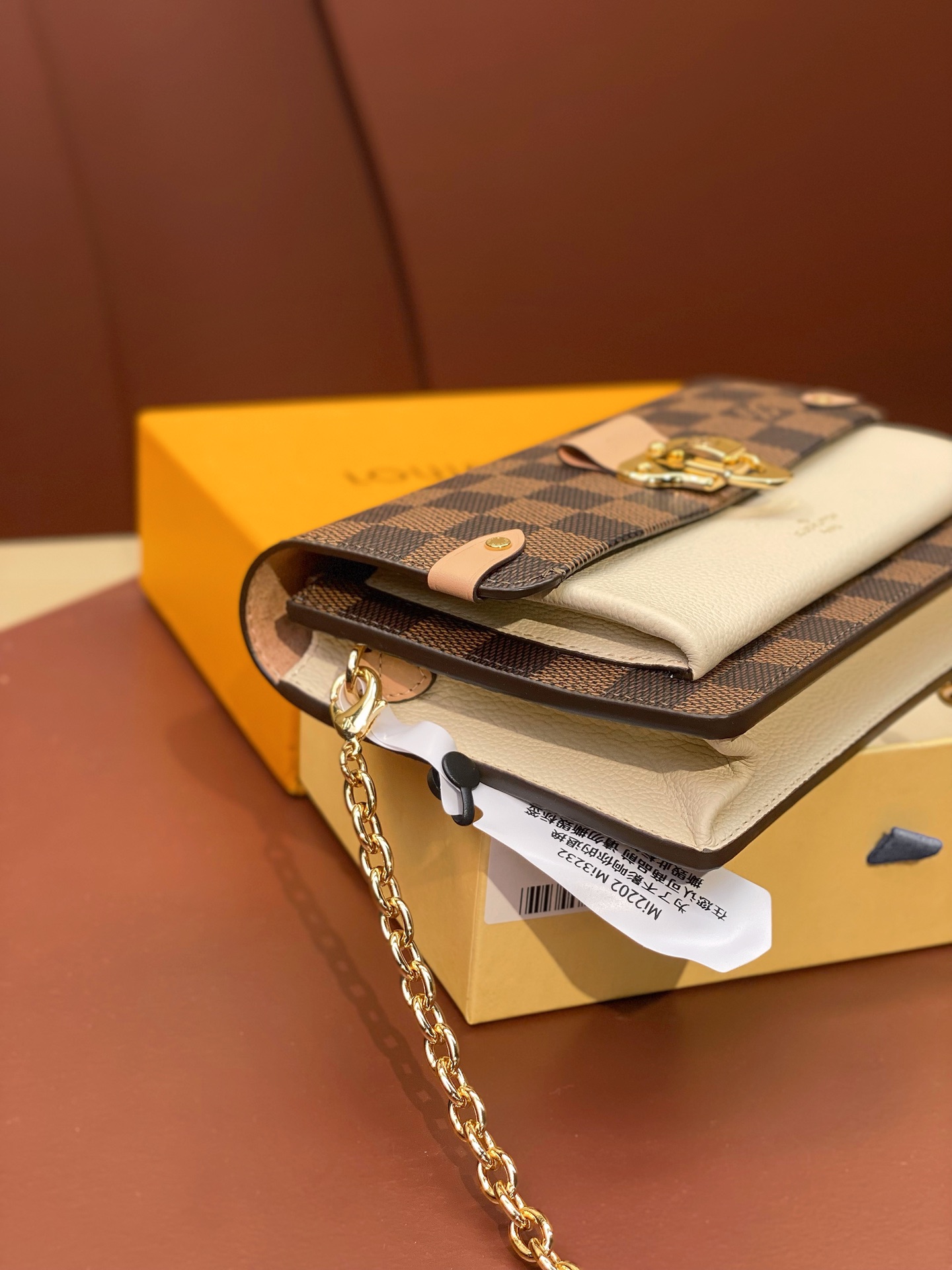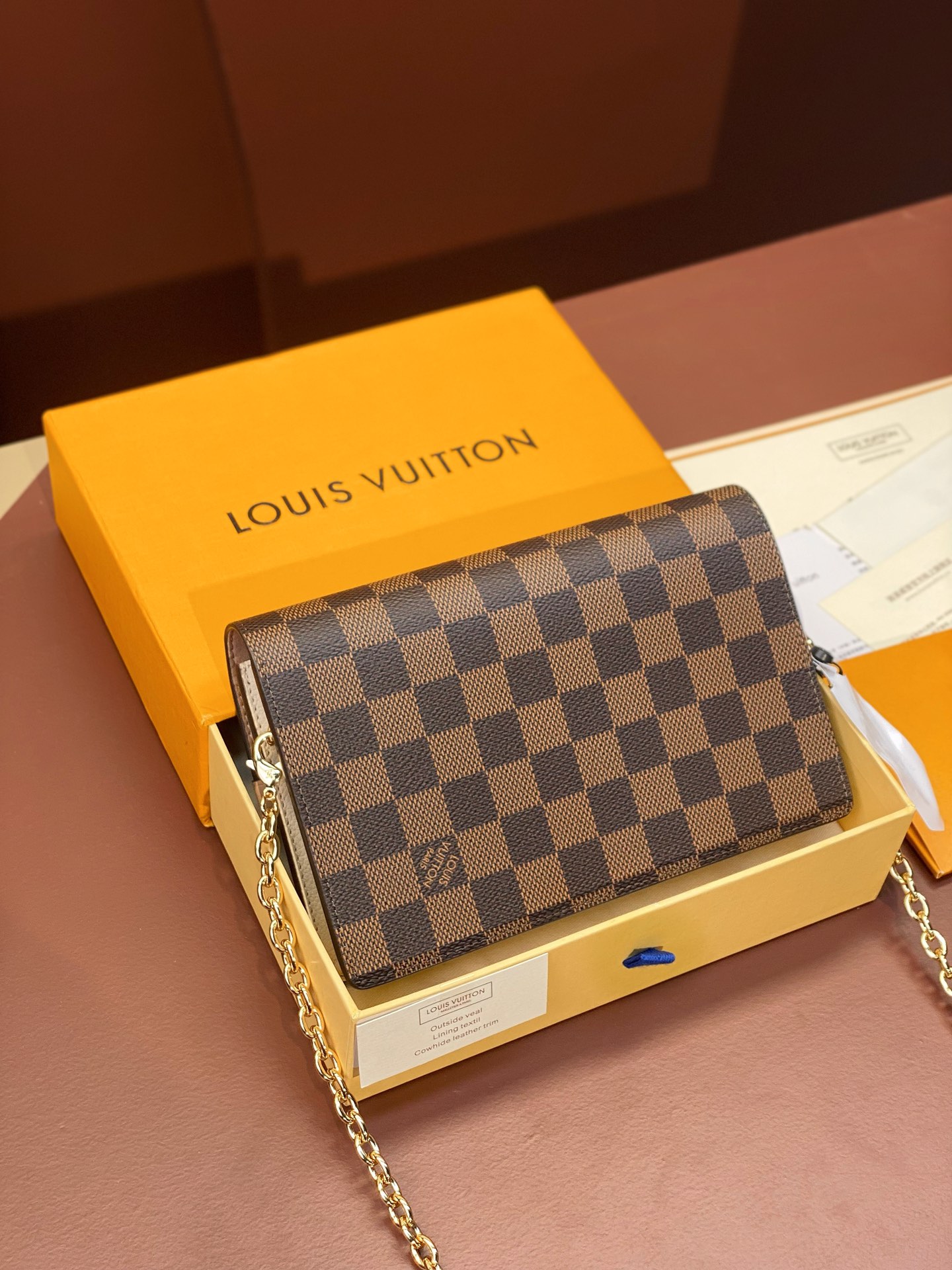 The Vavin chain wallet combines Louis Vuitton’s iconic Damier canvas with colored leather in a smart design that works for day and evening. Its flap, secured with a clasp inspired by the historic trunks, conceals a front pocket which is ideal for a smartphone. Its removable chain enables it to be carried in several different ways.