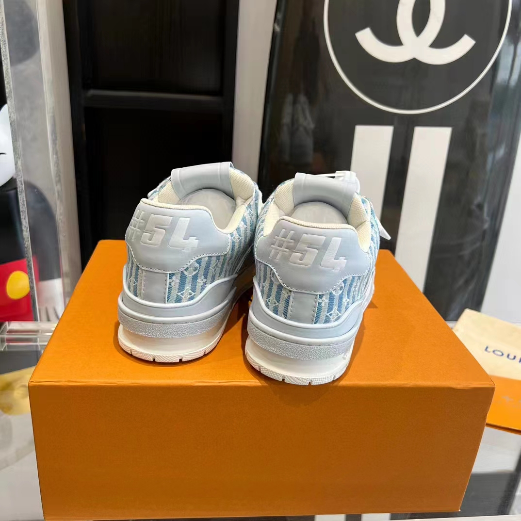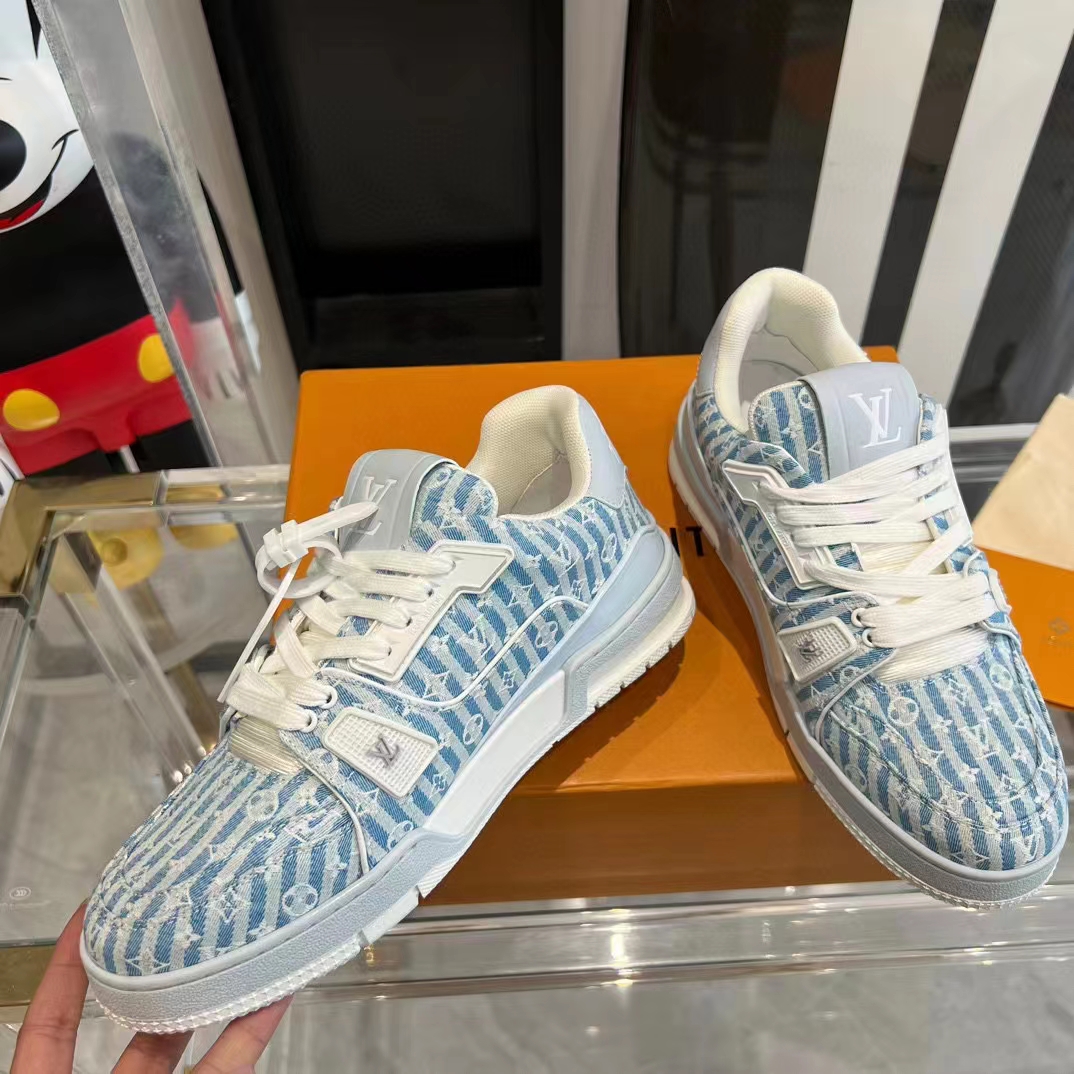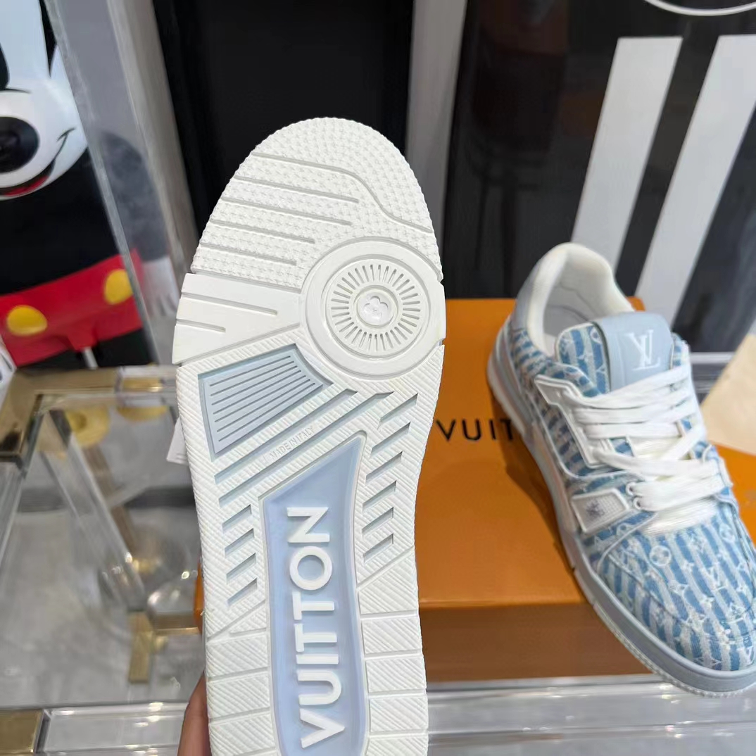 - This version of the LV Trainer sneaker comes in blue Monogram denim. a key theme of the season.