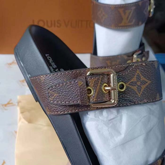 - Its two straps with Louis Vuitton-engraved gold-tone buckles can be adjusted for a perfect hold of the foot.