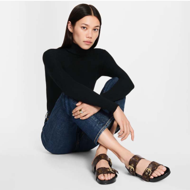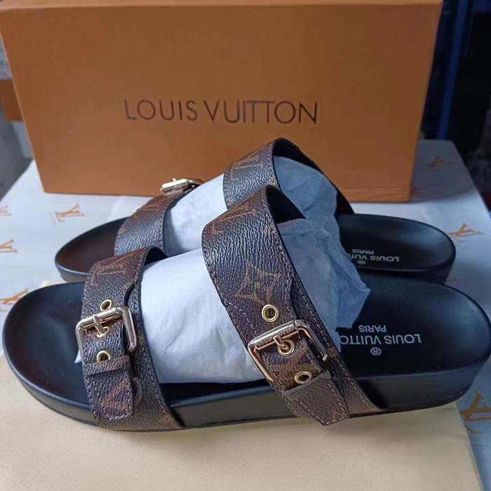 - Cool and effortlessly stylish in warm weather. the Bom Dia flat mule in patent Monogram canvas features a padded anatomic fusbet for ultimate comfort.