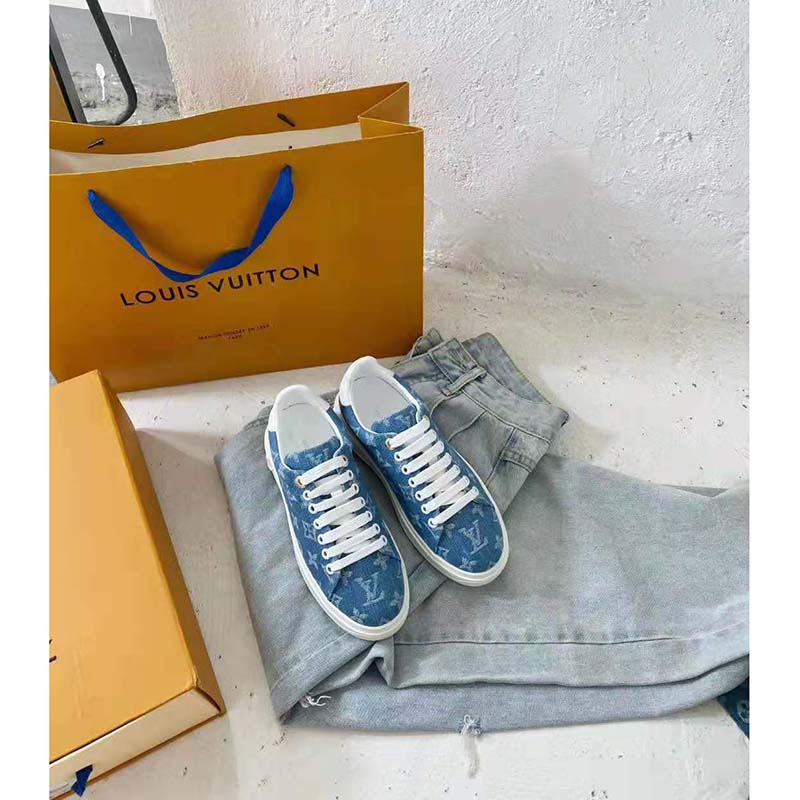 - The Time Out sneaker is given a summery twist in blue Monogram denim with white laces and calf-leather trim.