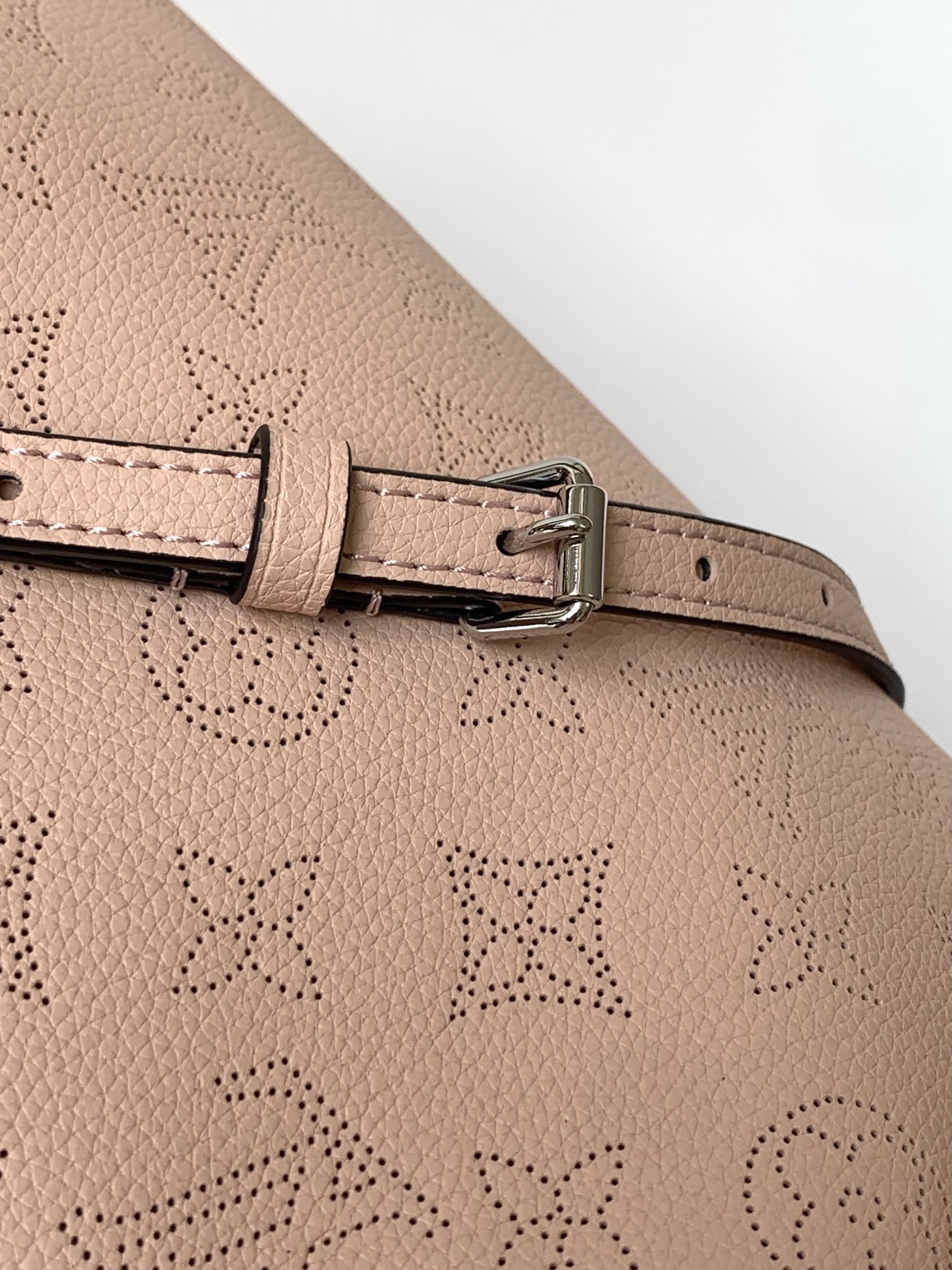 The petite Bella bucket bag and its attached round coin purse are made from supple Mahina perforated calfskin with the Monogram perforations in a slightly denser shade. The braided chain-and-leather handle allows for hand or elbow carry while the detachable leather strap can be adjusted for convenient shoulder and cross-body carry.