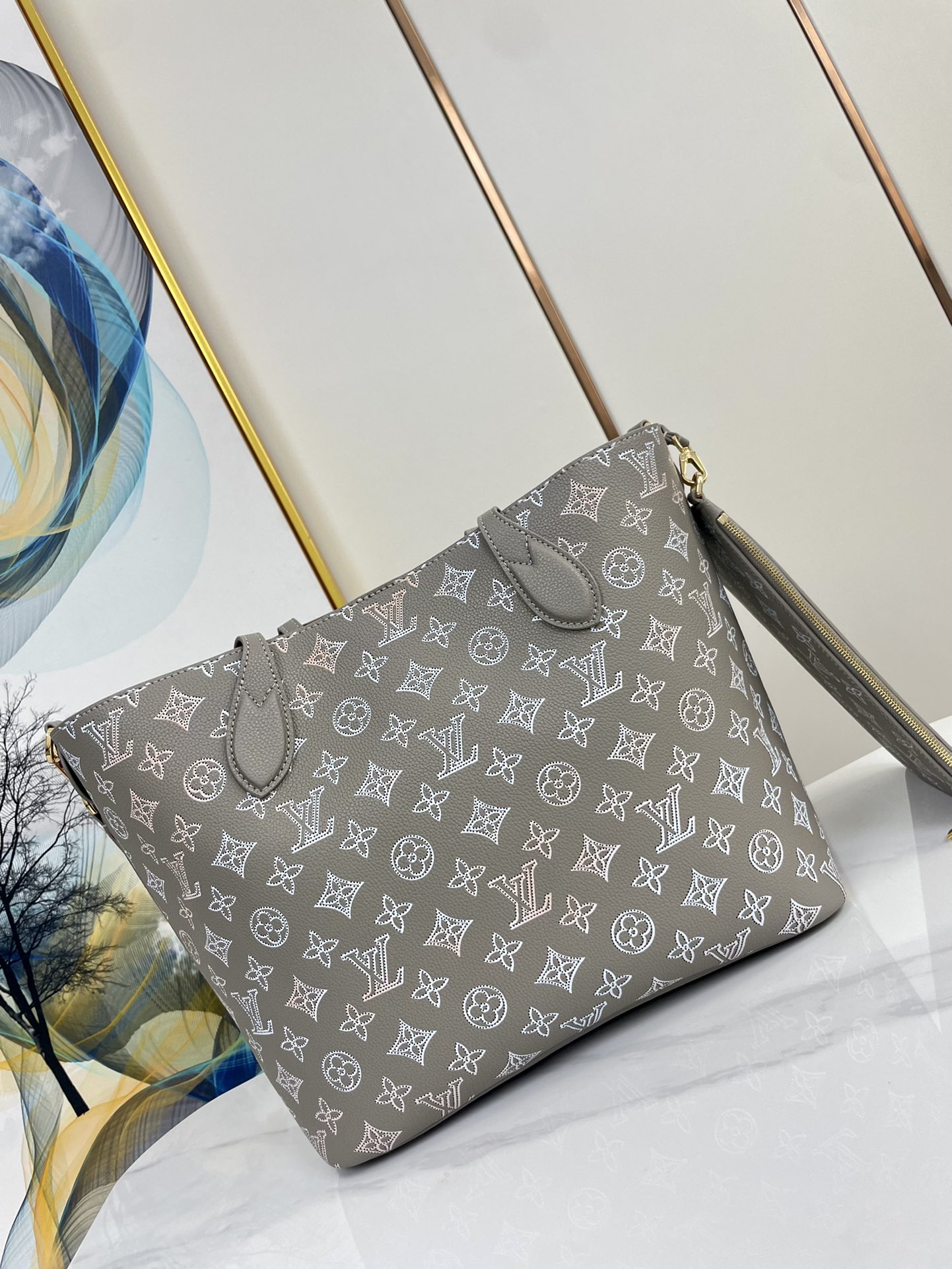 The Blossom MM tote bag is made from lightweight Mahina calfskin, with the Monogram pattern perforated into the elegant gray leather. The supple draped design makes it comfortable against the body. Inside the bag, a removable zipped pocket allows to secure belongings. Two long handles enable shoulder wear.