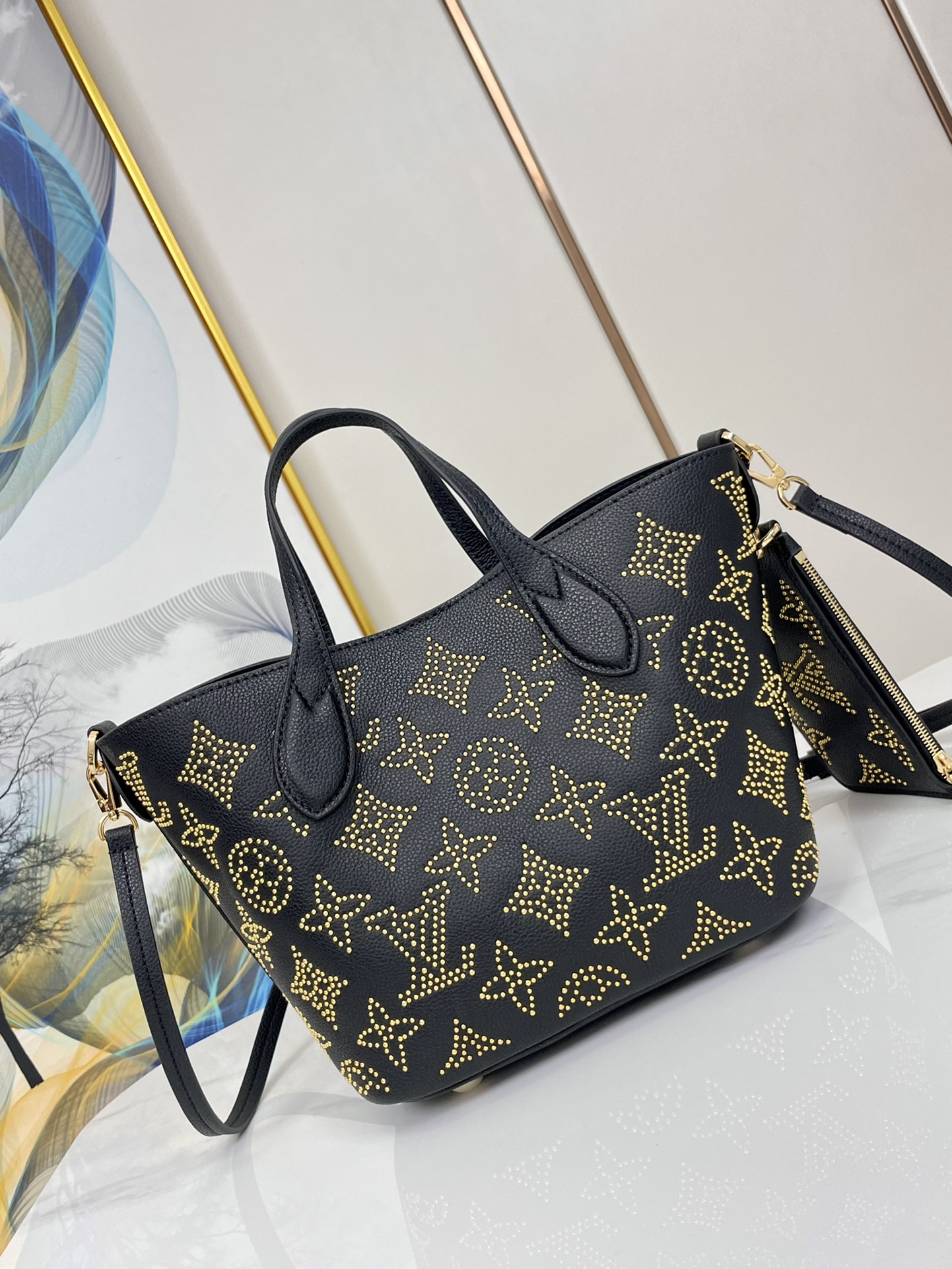 The Blossom PM tote is made from Mahina calfskin, adorned with a constellation of gold-laminated dots that come together to form the Monogram pattern. The Monogram Flowers and LVs are then overprinted to give them a subtle 3-dimensional aspect. The inside compartment includes a zipped pouch that can be removed and used separately.