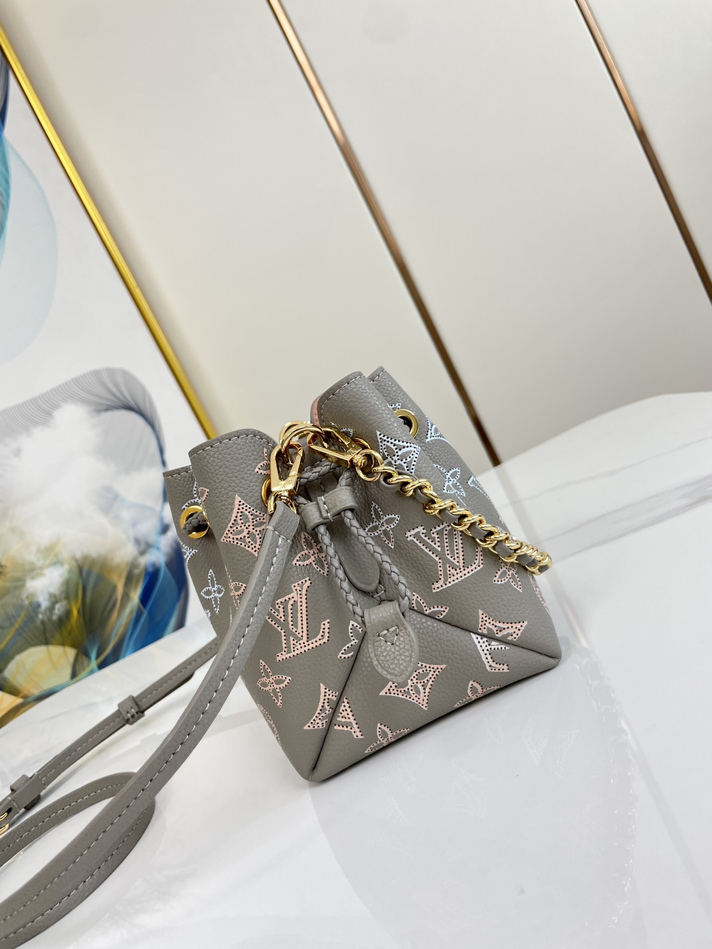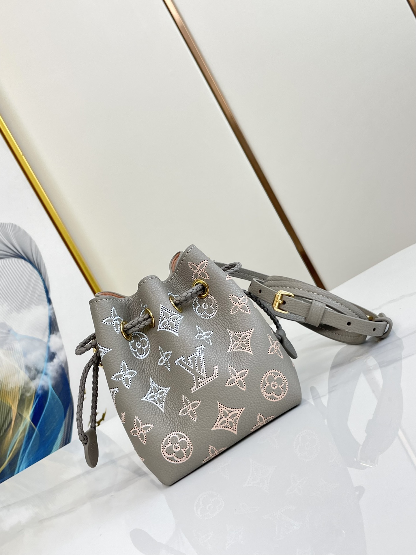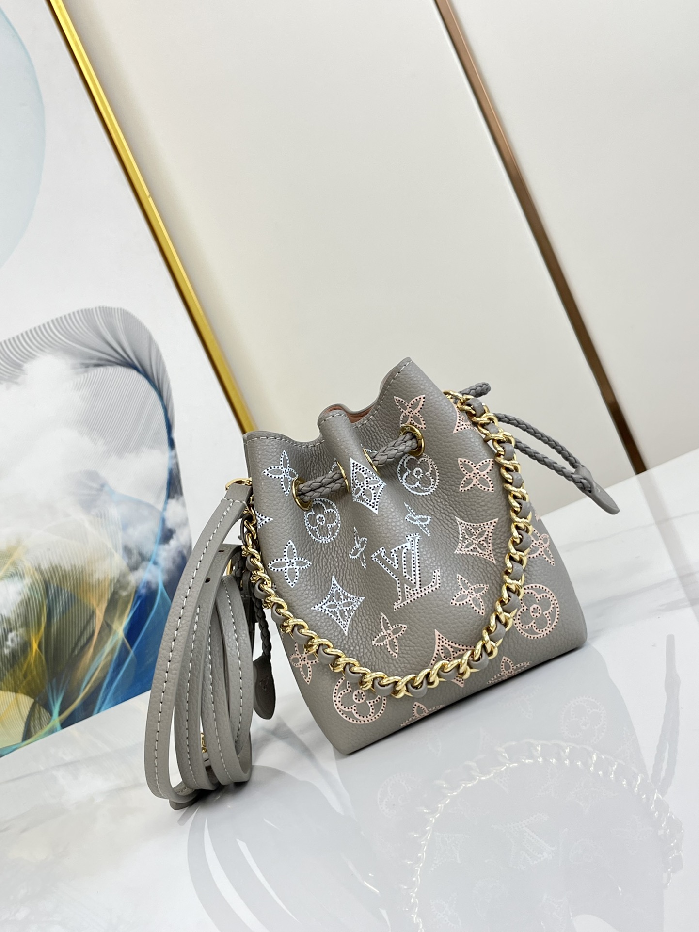 The adorable Pico Bella bucket bag is fashioned from the House’s emblematic Mahina calfskin, with Monogram Flowers and LVs delicately perforated into the leather. The understated colorway and pale-gold-color hardware bring a tastefully luxurious feel. The leather drawstring ensures that belongings stay secure.