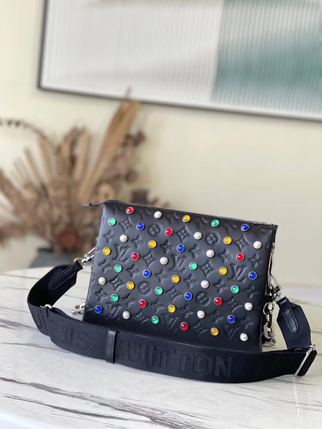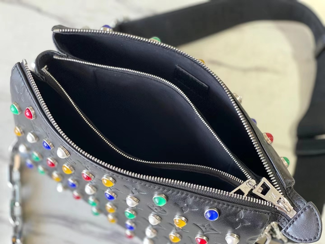 From the Exceptional capsule highlighted on the Spring-Summer 2023 runway through shoes comes this precious Coussin BB handbag. Crafted from soft, padded lambskin, it is adorned with sparkling cabochon crystals in joyful primary colors. This piece offers a variety of styling options, thanks to a removable leather strap and a detachable chain with black resin inserts, a glamorous touch for evening.