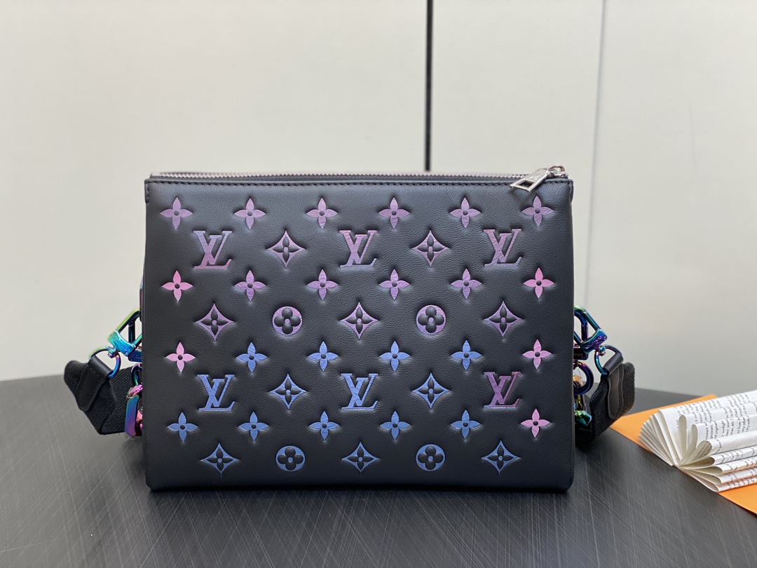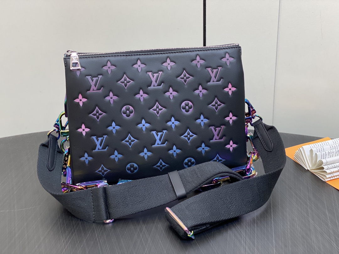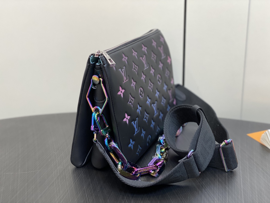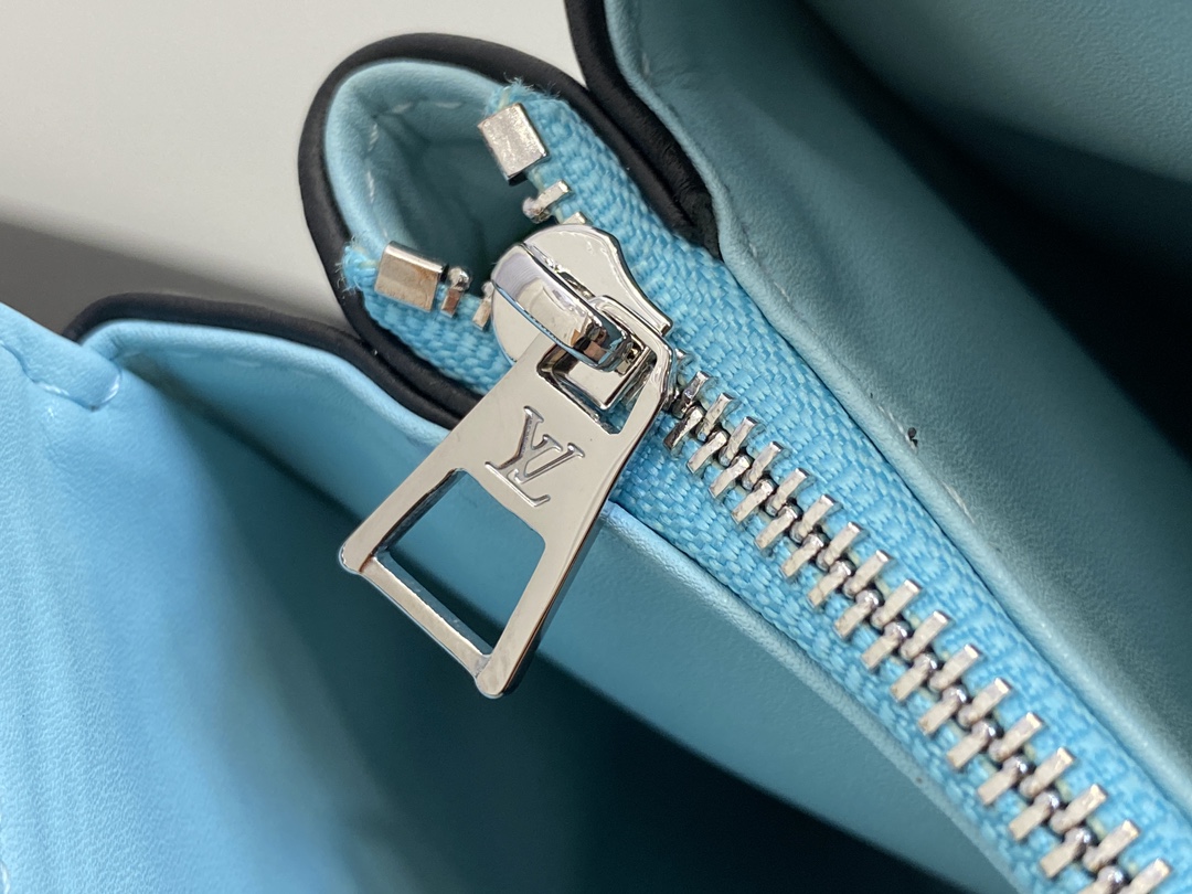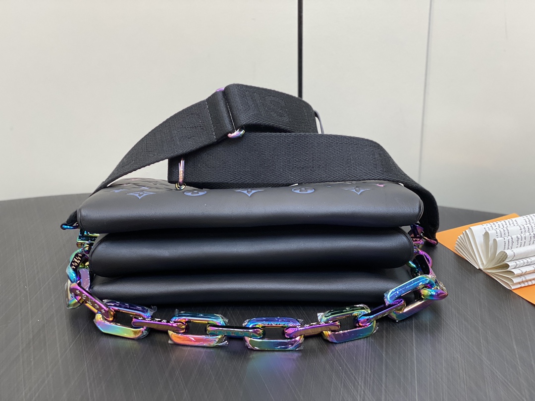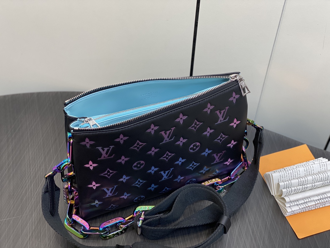 This Coussin PM is made from puffy lambskin with a shimmery finish an almost-holographic aspect on the Monogram pattern. It’s accessorized with a removable chain, ornamented with an exquisite iridescent finish that changes from yellow color to subtle shades of blue, depending on the light.