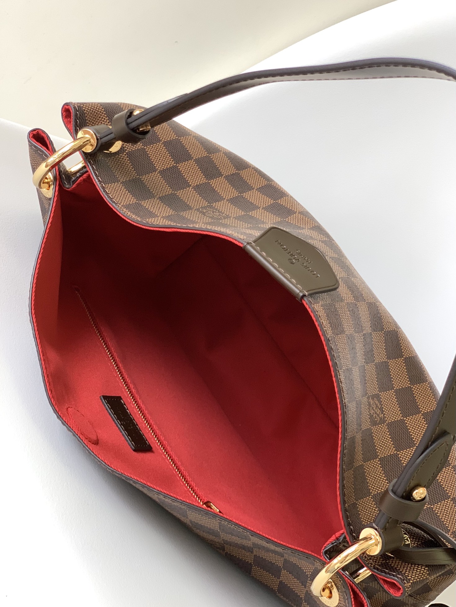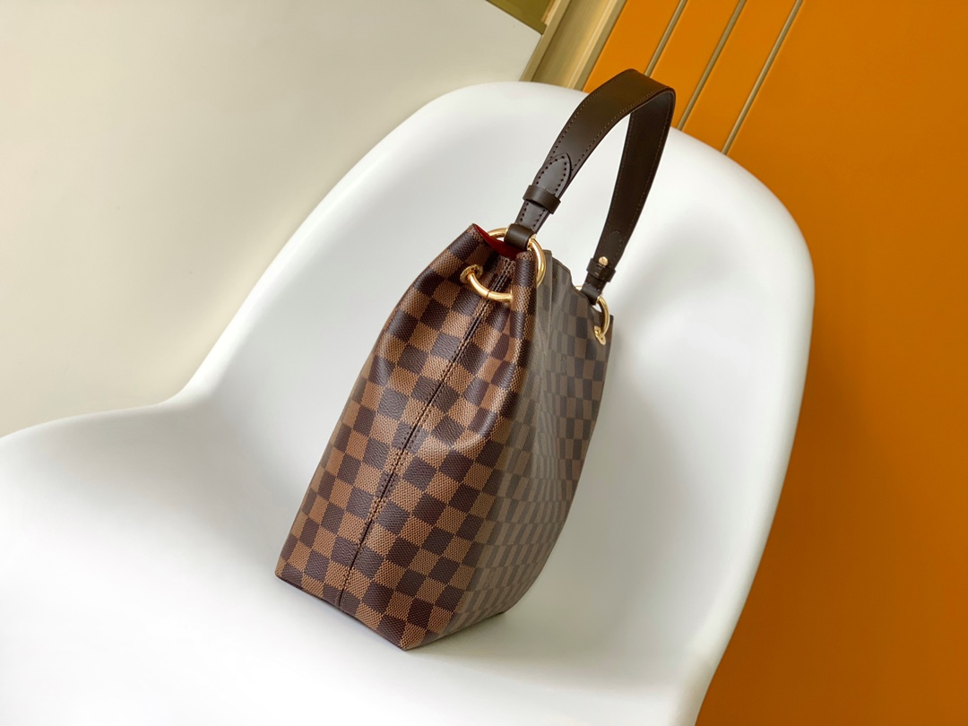 The Graceful PM hobo in graphic Damier Ebenecanvas is a lightweight, roomy bag to carry every day. Natural leather detailing and golden hardware add a refined touch. The body-friendly design combines with a supple, flat handle for stylish and comfortable over-the-shoulder wear. The magnetic closure and zipped inside pocket keep belongings secure.