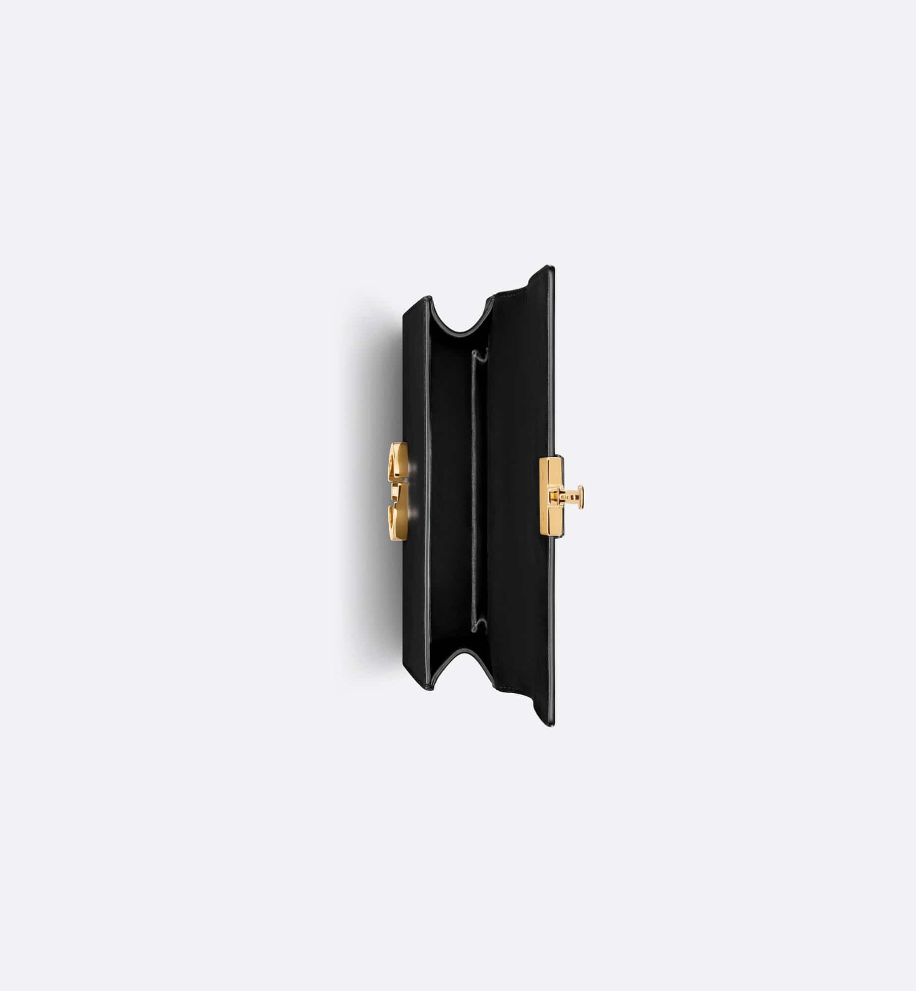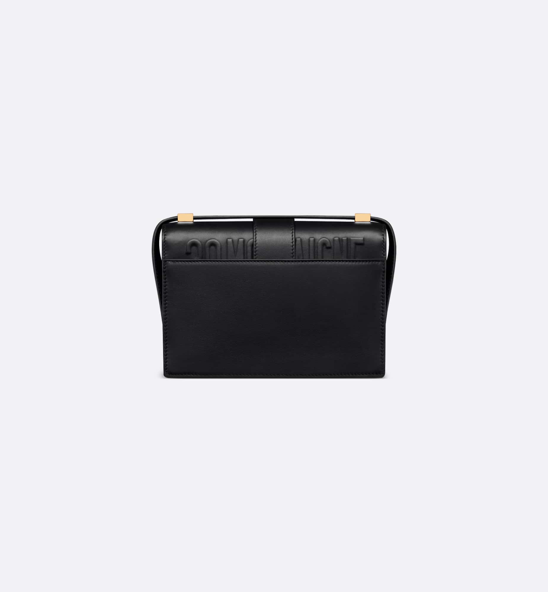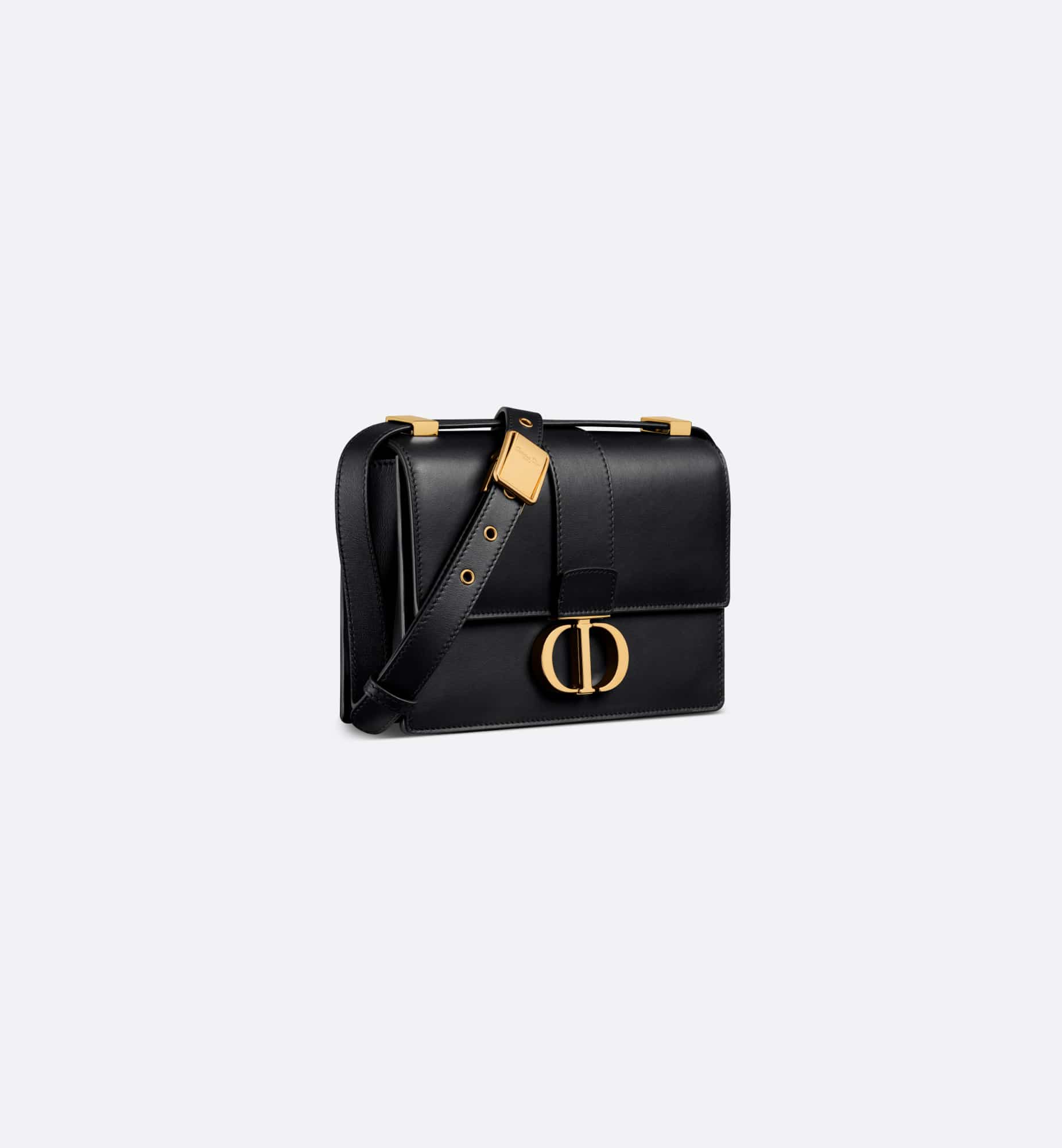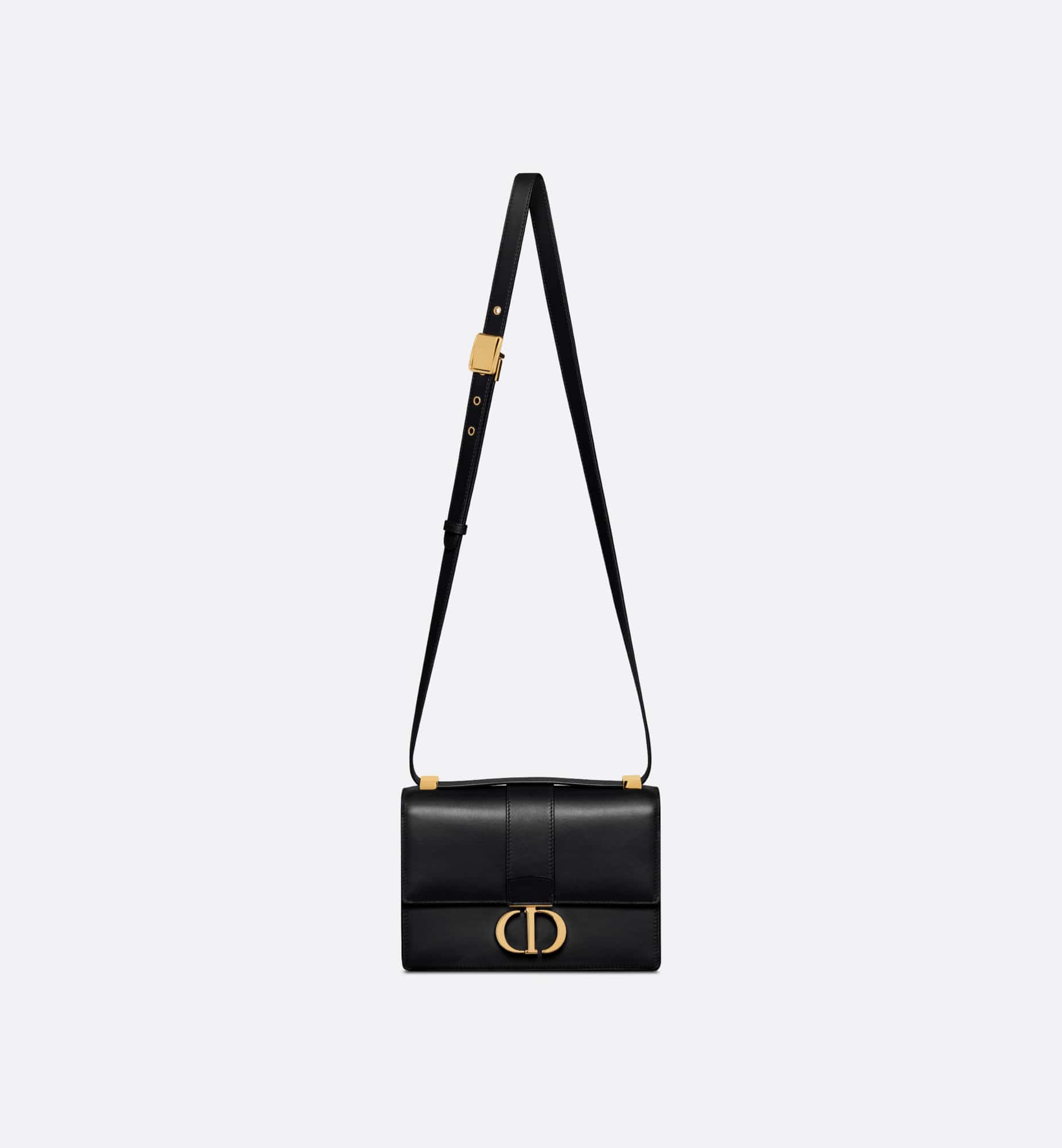The bag enhances the 30 Montaigne line with a timeless and elegant design crafted in black calfskin. The flap has an antique gold-finish metal CD clasp, inspired by the seal of a Christian Dior perfume bottle. Other details, like the embossed 30 Montaigne signature on the back and the military-inspired buckle, highlight the streamlined design. Featuring an adjustable leather shoulder strap, the small 30 Montaigne bag can be carried by hand, worn over the shoulder or crossbody.