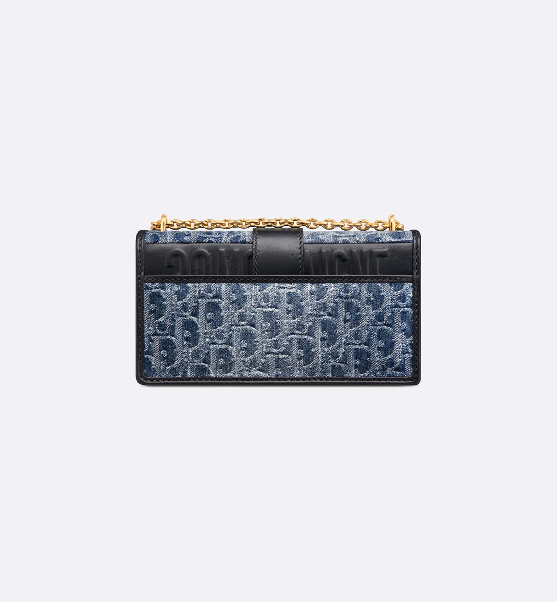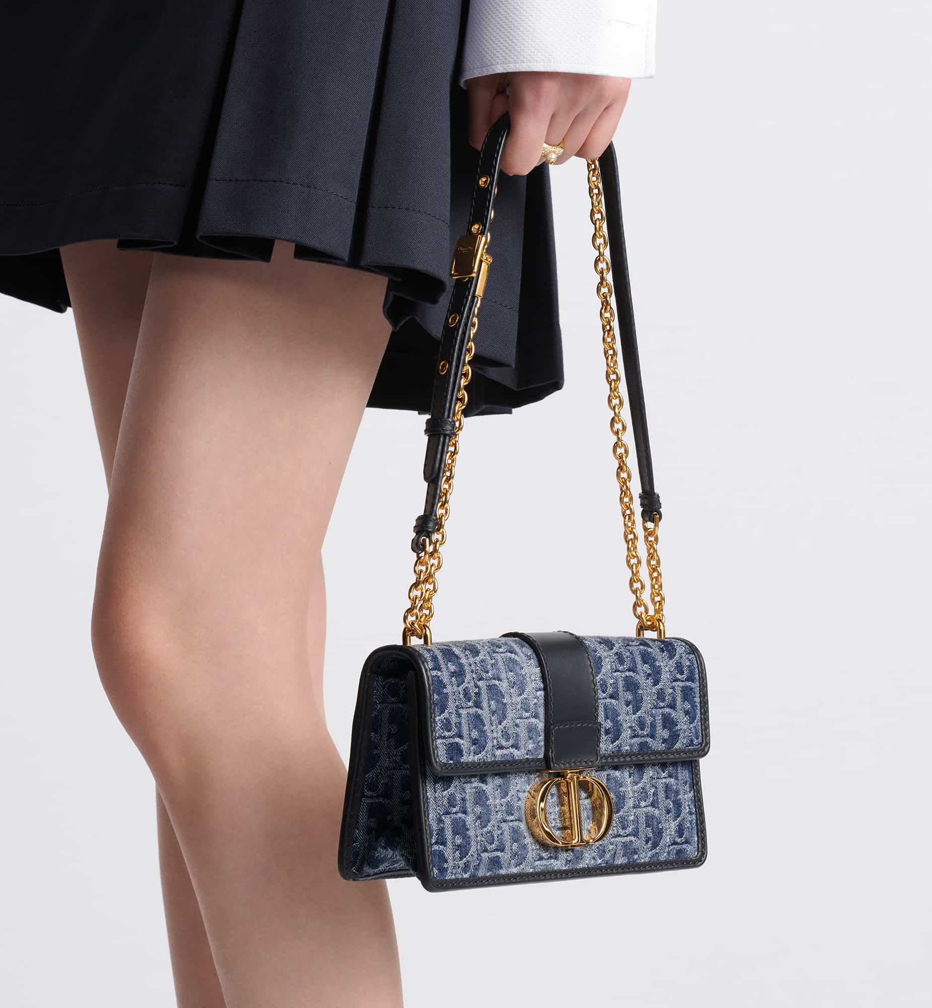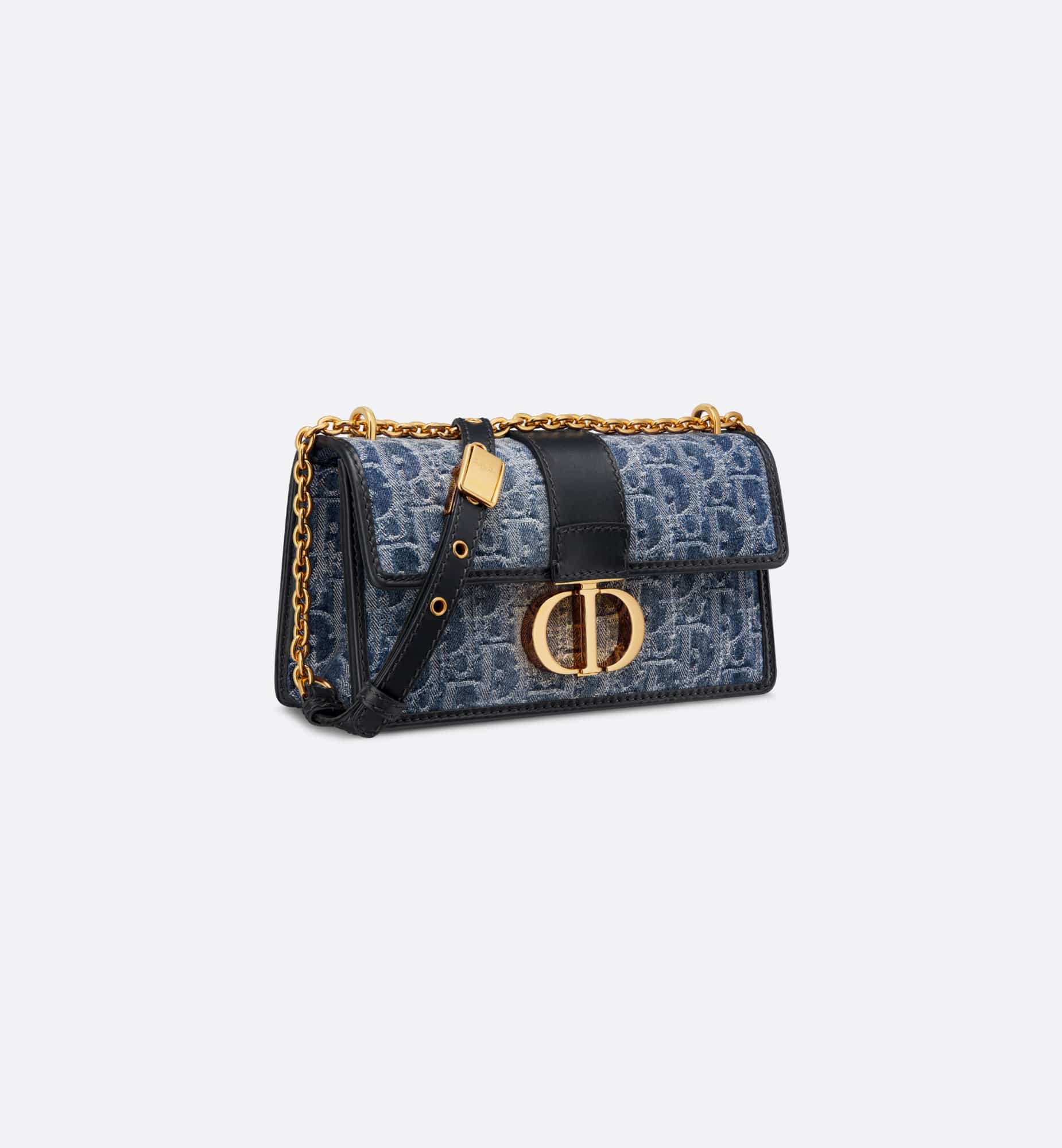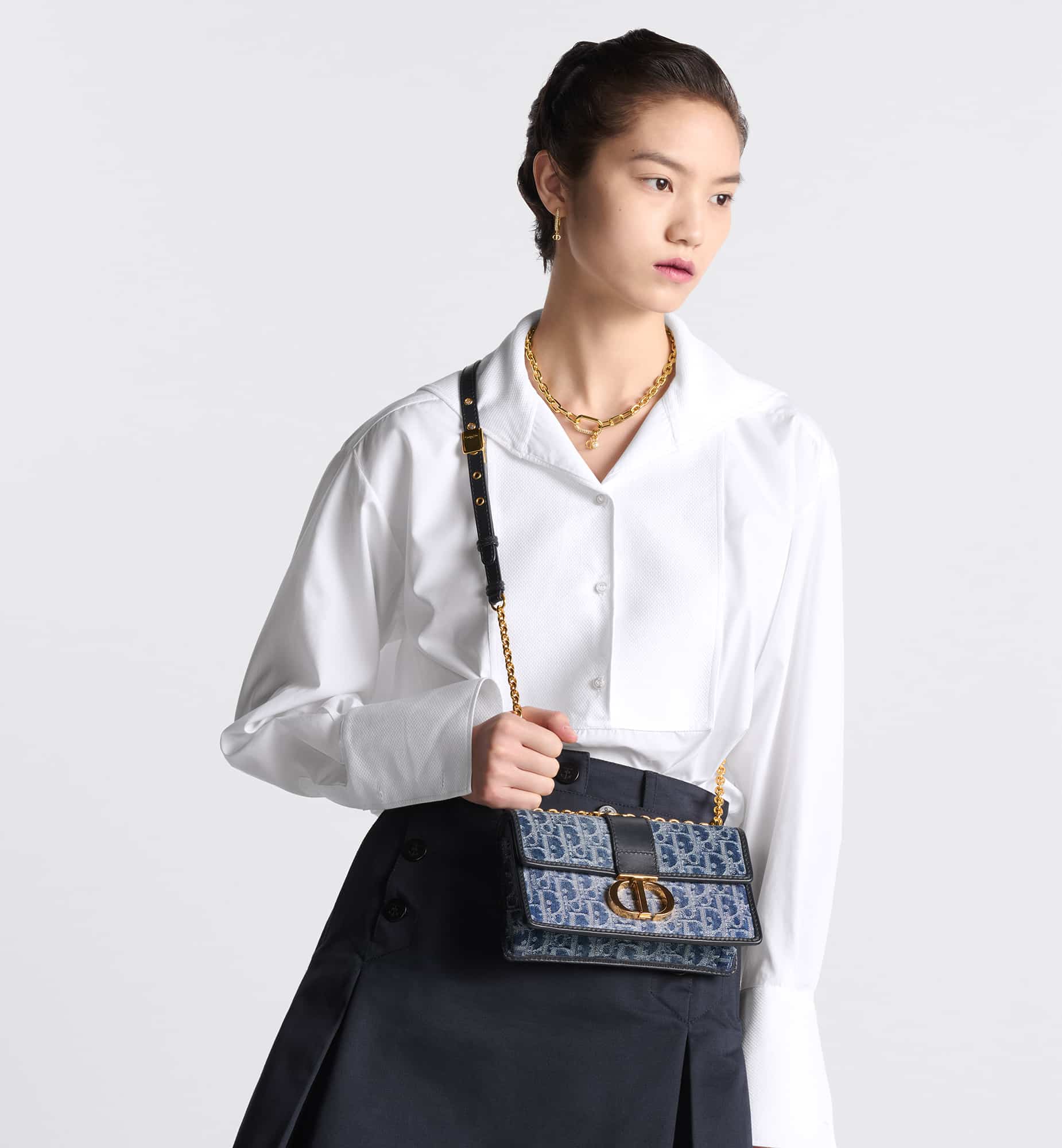 The East-West bag with chain enhances the 30 Montaigne line with a timeless and elegant design. The bag is crafted in blue Denim Dior Oblique jacquard, offering a new take on the iconic House motif with the modern appeal of an irregular stonewashed effect. The flap has an antique gold-finish metal CD clasp, inspired by the seal of a Christian Dior perfume bottle. Other details, like the embossed 30 Montaigne signature on the back, highlight the streamlined style. The bag features a removable chain strap with a leather insert that allows it to be comfortably carried by hand, worn over the shoulder or crossbody.