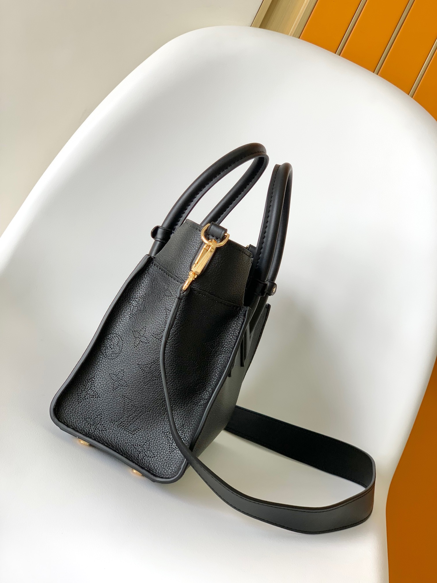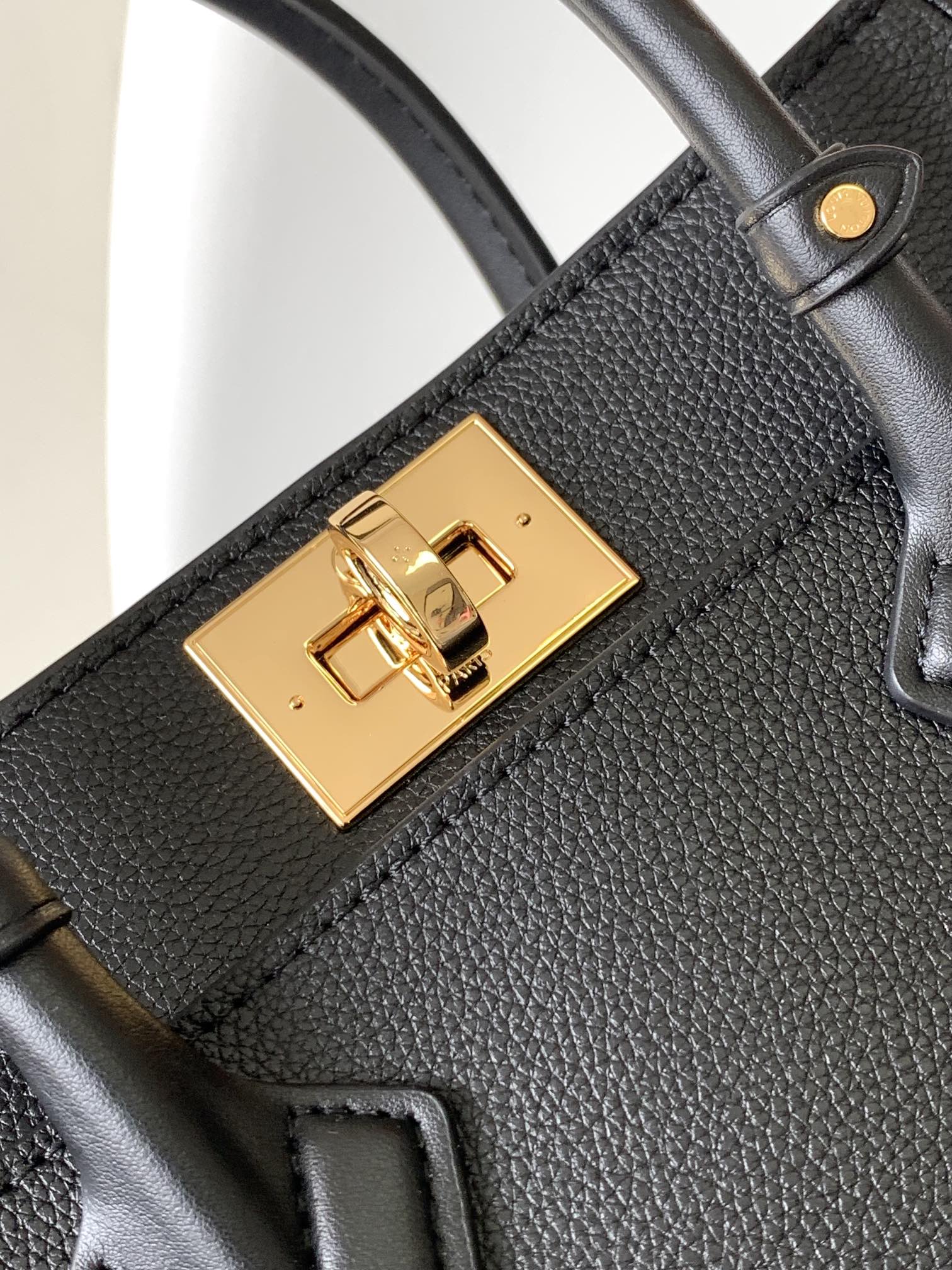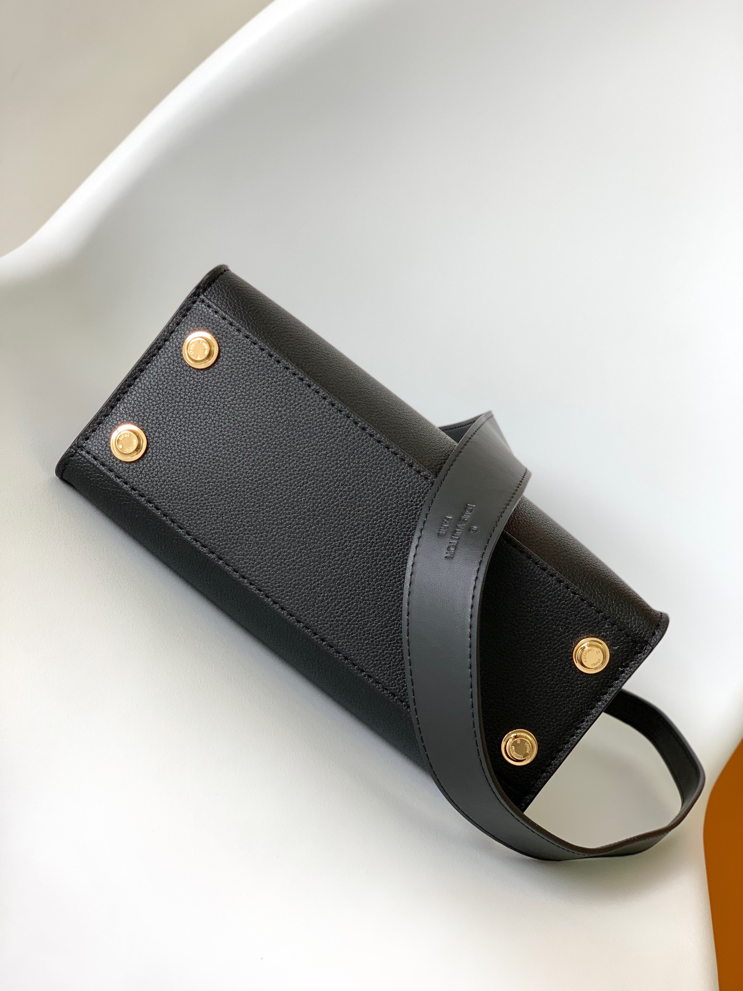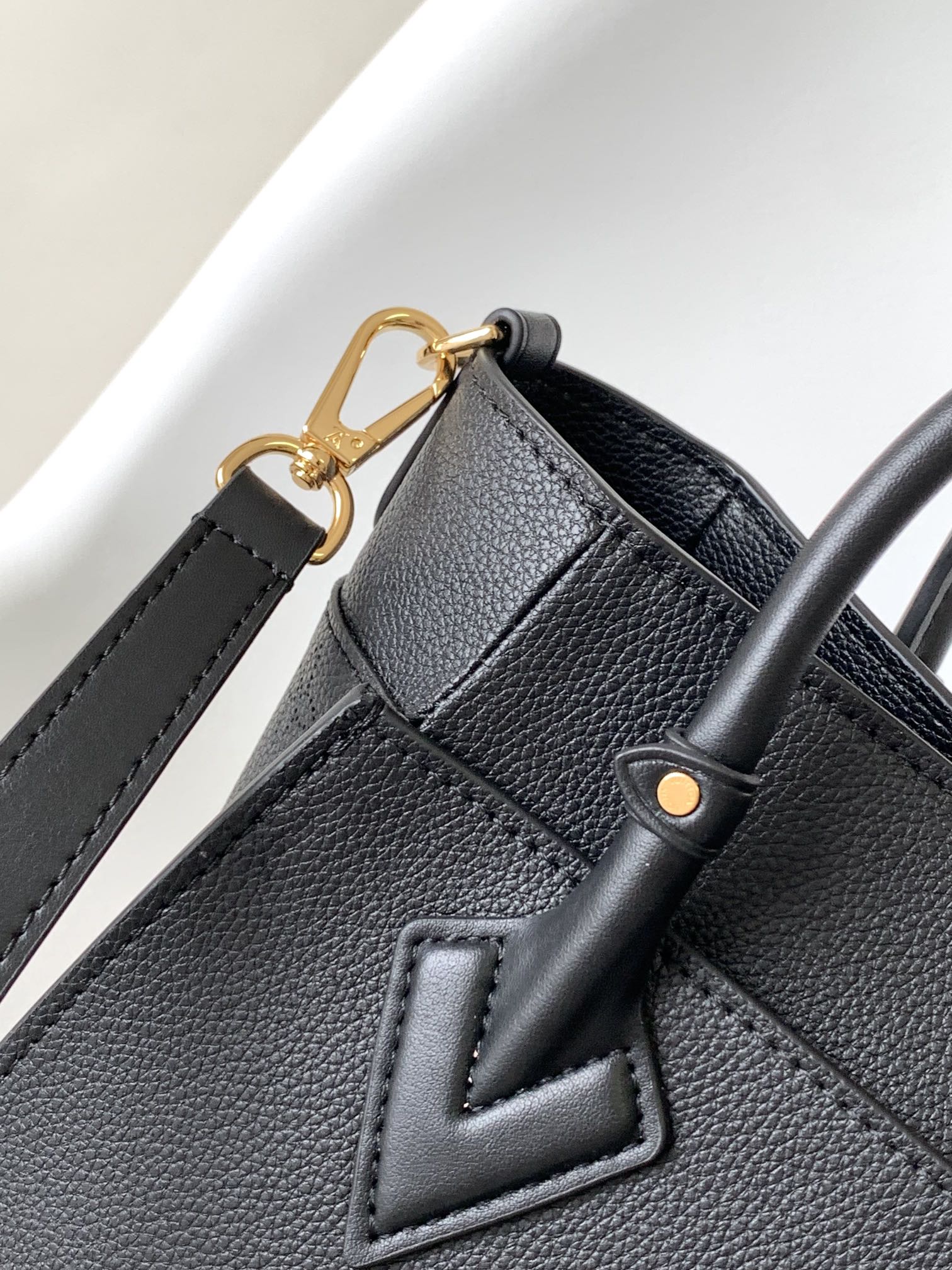 The On My Side tote bag is made from calf leather, with perforated calf leather on the gusseted sides. The elegant colorway is livened up with a gold-color twist closure and gold-color buckles on the removable strap. Two outside pockets and a roomy interior makes this a practical bag.