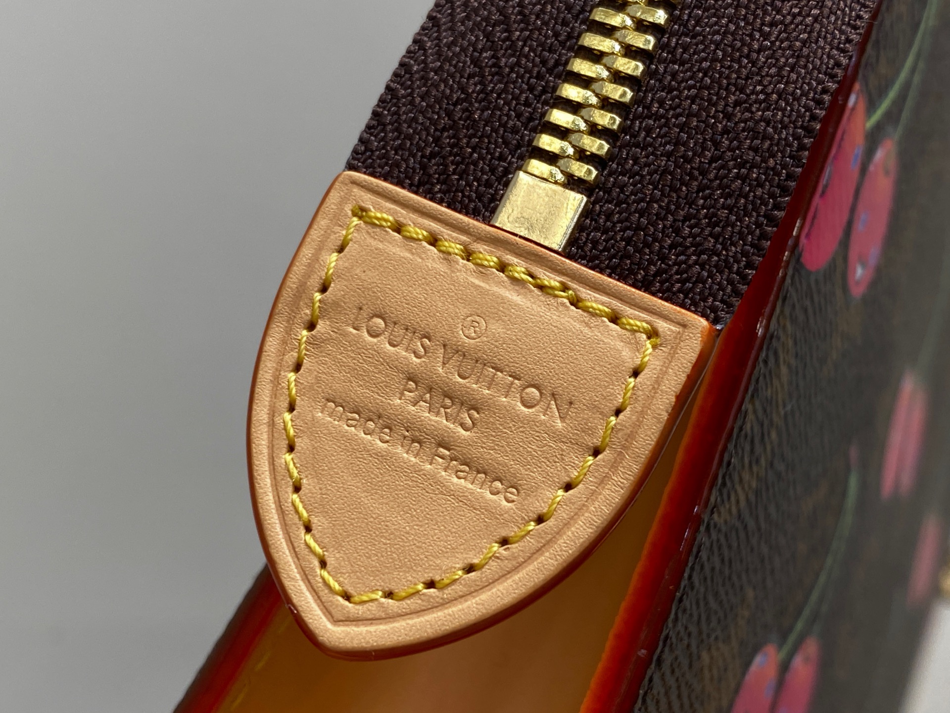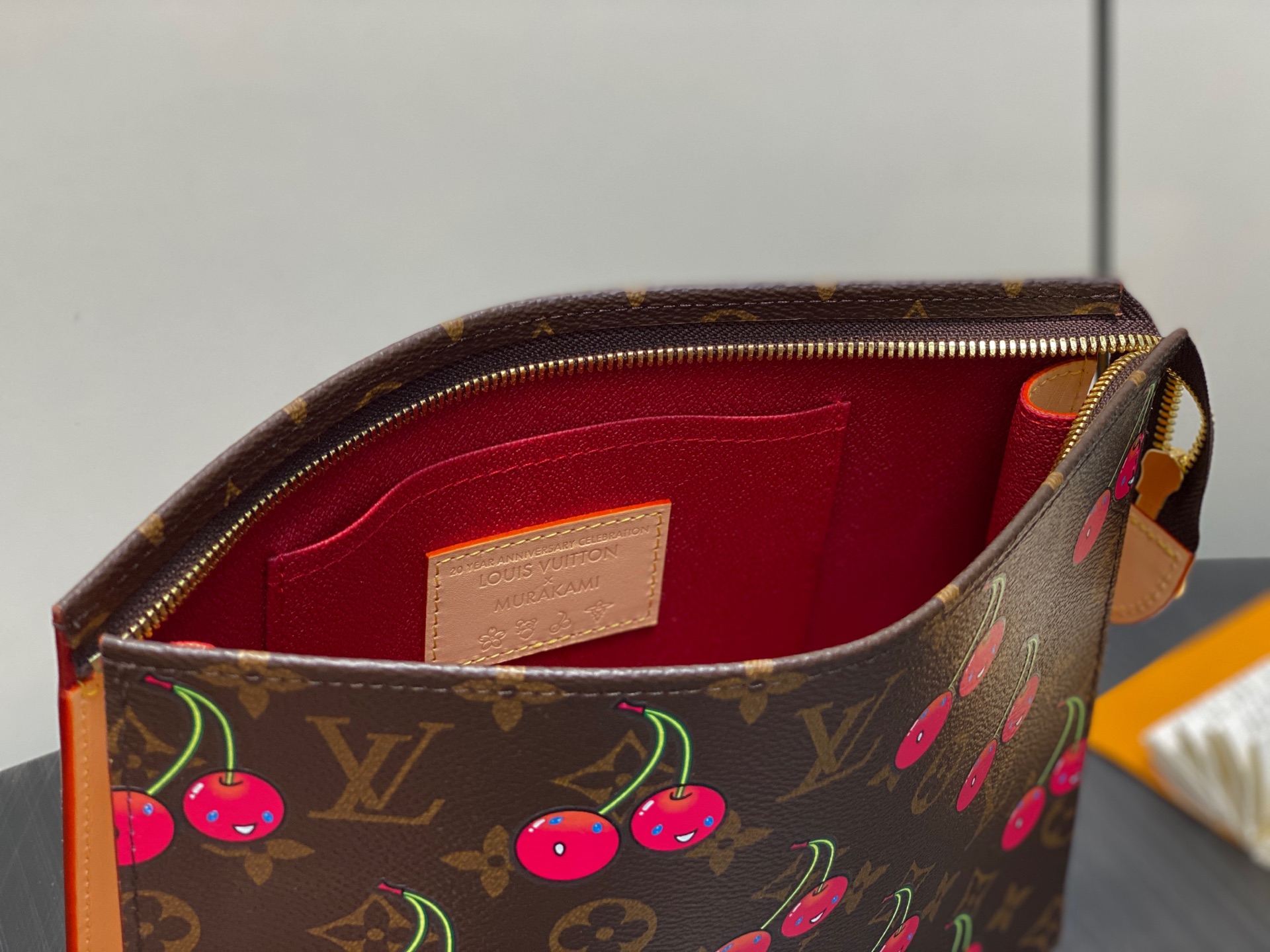 M14372 Monogram Cherry Clutch Handbag for Men Exclusive Sticker LV x TM Toiletry Bag This toiletry bag is shaped in a neat configuration with classic Monogram coated canvas, and features a lovely cherry pattern from the Louis Vuitton x Takashi Murakami replica series. The top glossy zipper, washable lining and patch pockets complete the sophisticated details. 25 x 5.5 x 20 cm