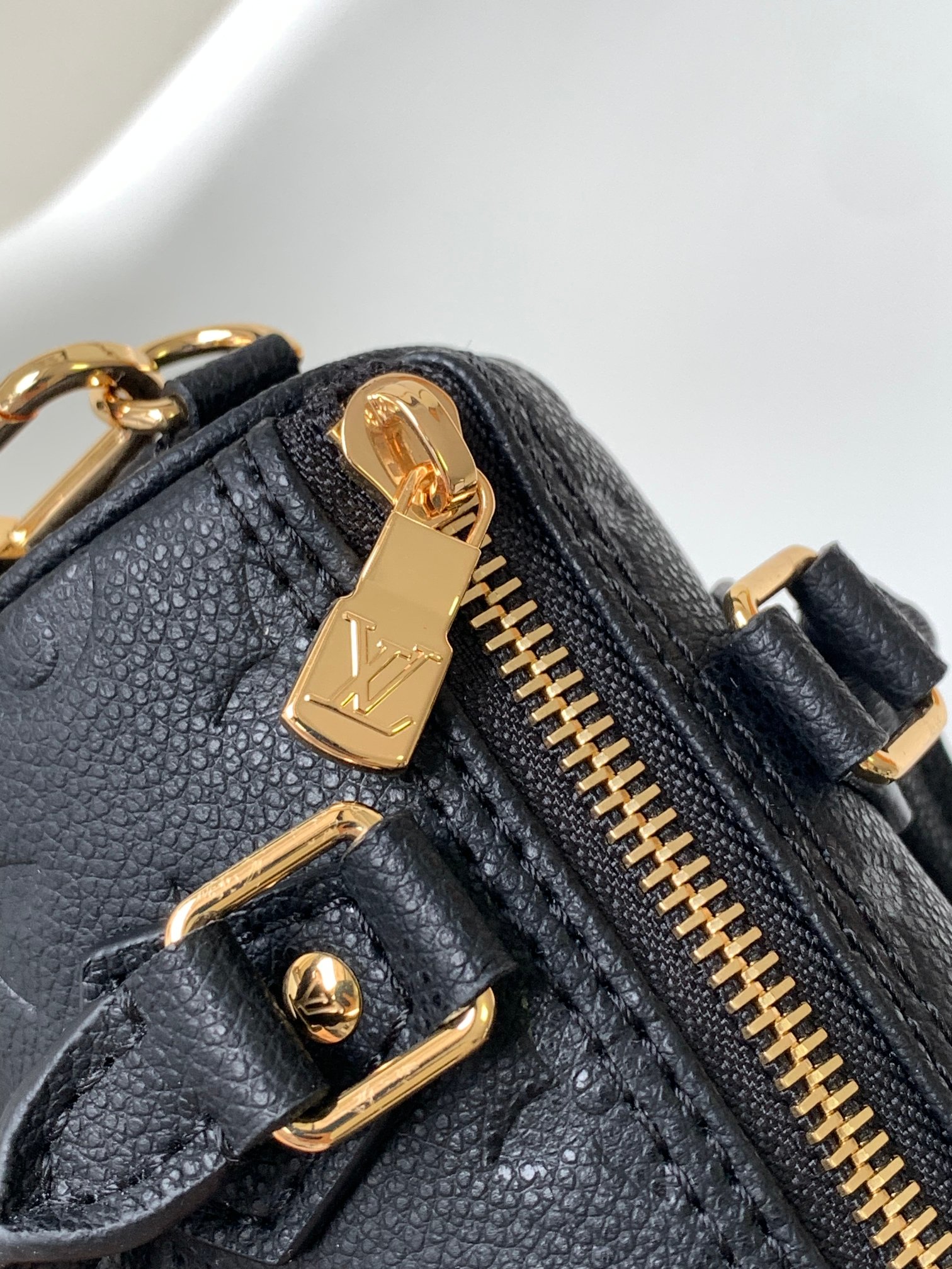 A miniature replica of the iconic Speedy bag, the Nano Speedy is crafted from Monogram Empreinte leather, embossed with the Monogram pattern. This grained leather is notable for its supple feel, which complements the bag’s rounded, body-friendly shape. Two top handles and a removable, adjustable shoulder strap offer different carry options.