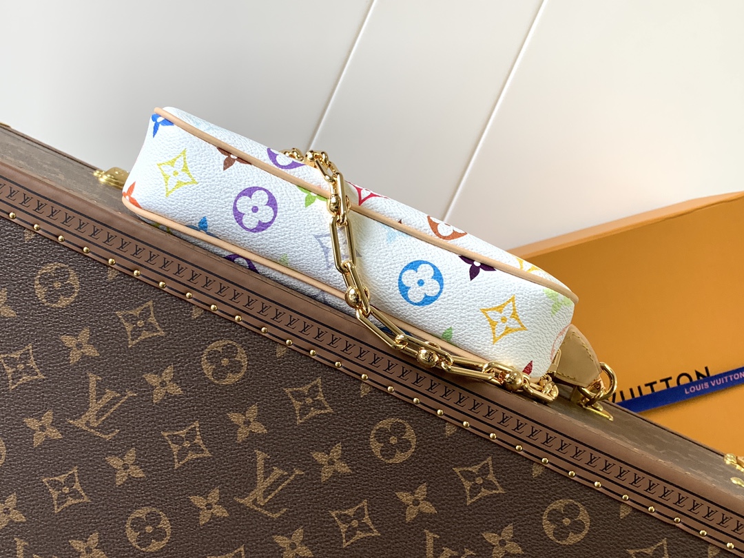 This playful edition of the classic Pochette Accessoires is joyfully reimagined with a multicolored Monogram motif as part of the cross-category Louis Vuitton x Murakami collection. Crafted from coated canvas in a petite pouch shape, a natural cowhide-leather trim adds an emblematic House touch, while golden hardware introduces a chic polished accent. Complete with a removable strap and chain for versatile styling options.