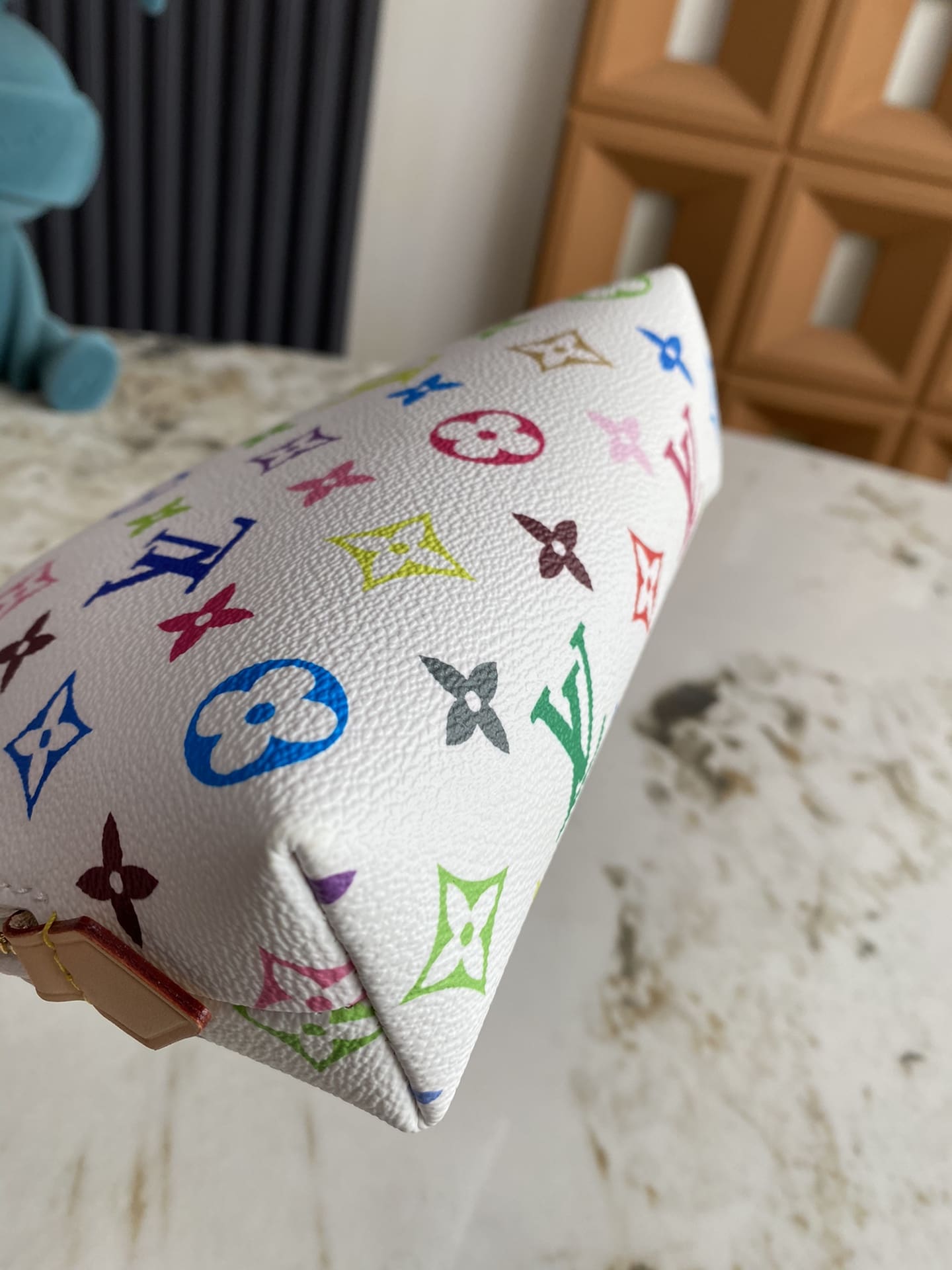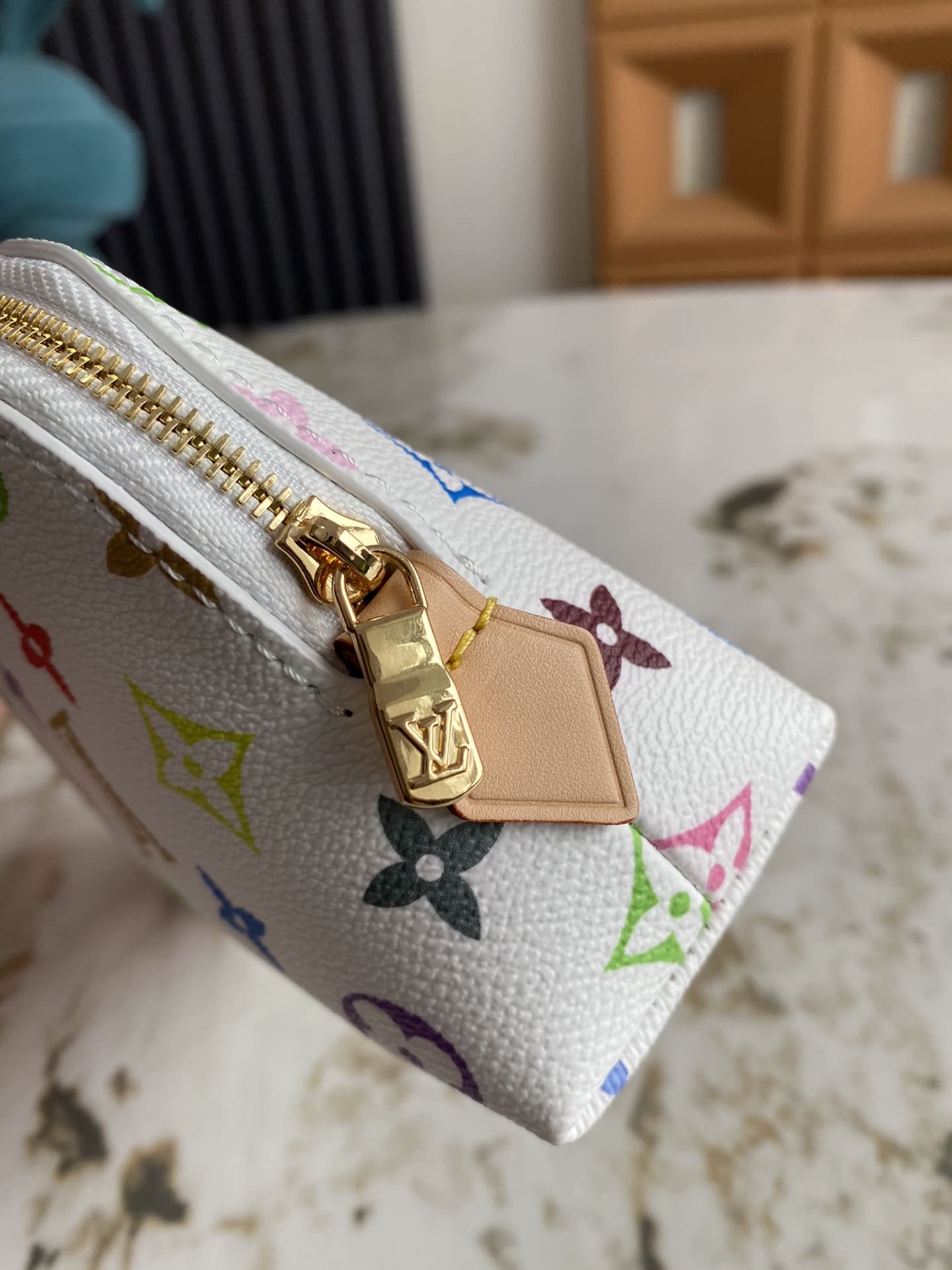 Colorful and compact, this essential Cosmetic Pouch PM is part of the celebratory cross-category Louis Vuitton x Murakami collaboration. Crafted from Monogram coated canvas, the House’s iconic signature is revisited in the playful rainbow tones of the world-renowned artist’s work. It is fastened with a golden zipper and finished with a practical washable lining complete with an additional flat pocket for small items.