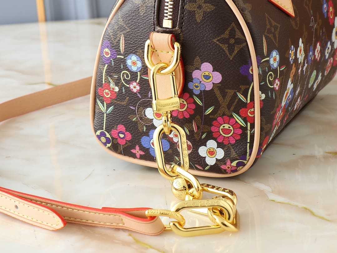 Joyful detailing from the exclusive re-edition of the Louis Vuitton x Murakami collection elevates this classic Speedy Bandoulière 20 handbag into a striking statement. Crafted from classic Monogram canvas trimmed with natural cowhide leather, the front and back is embellished with Monogram Flowers that have been playfully reimagined in the Japanese artist’s vernacular superflat style. It is finished with two Toron top handles, a golden padlock on the zipper fastening and a detachable, adjustable chain.