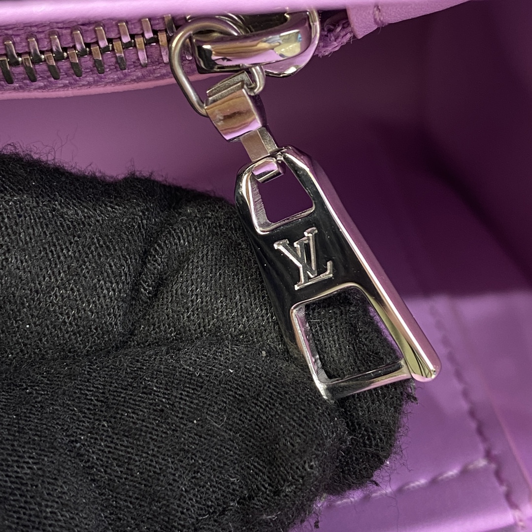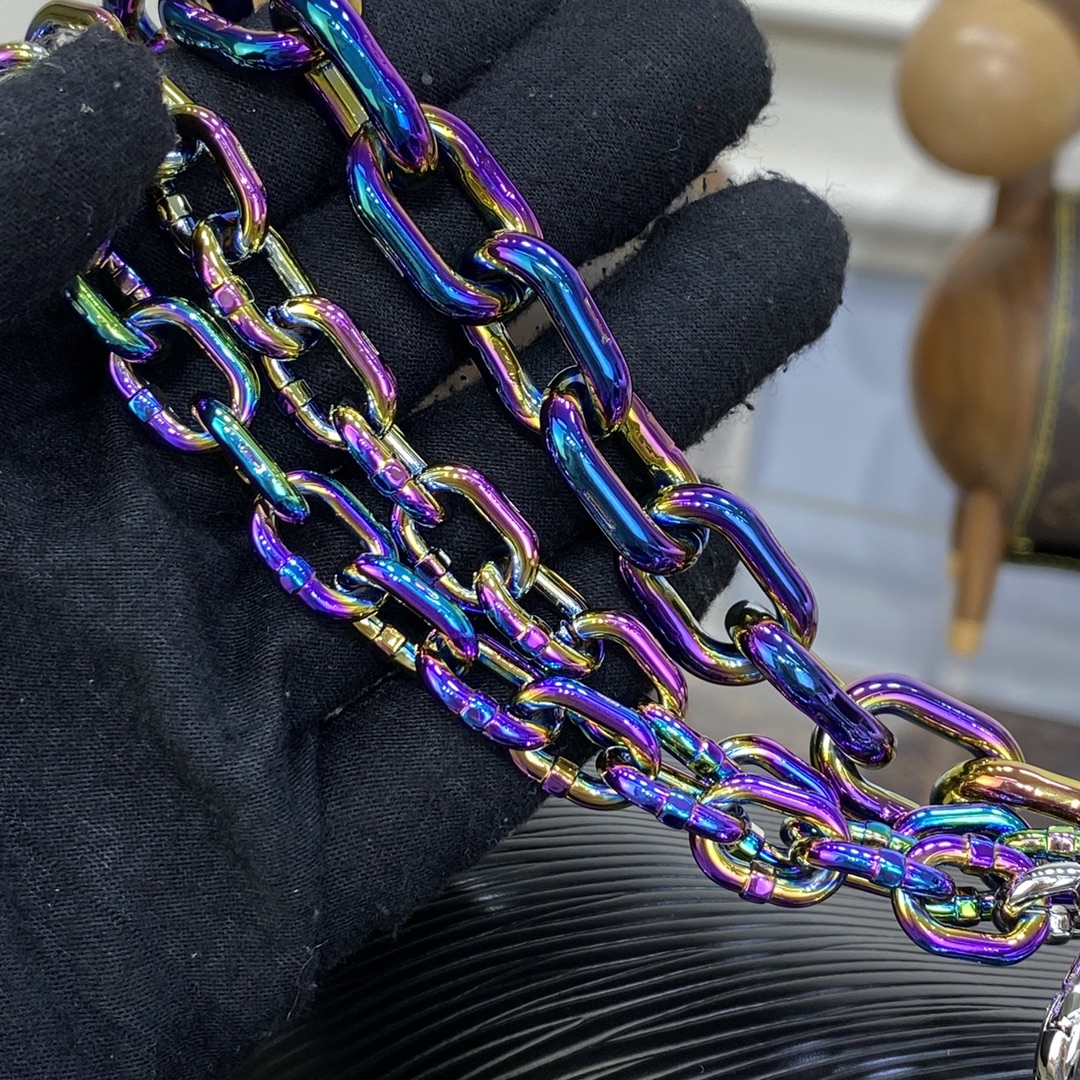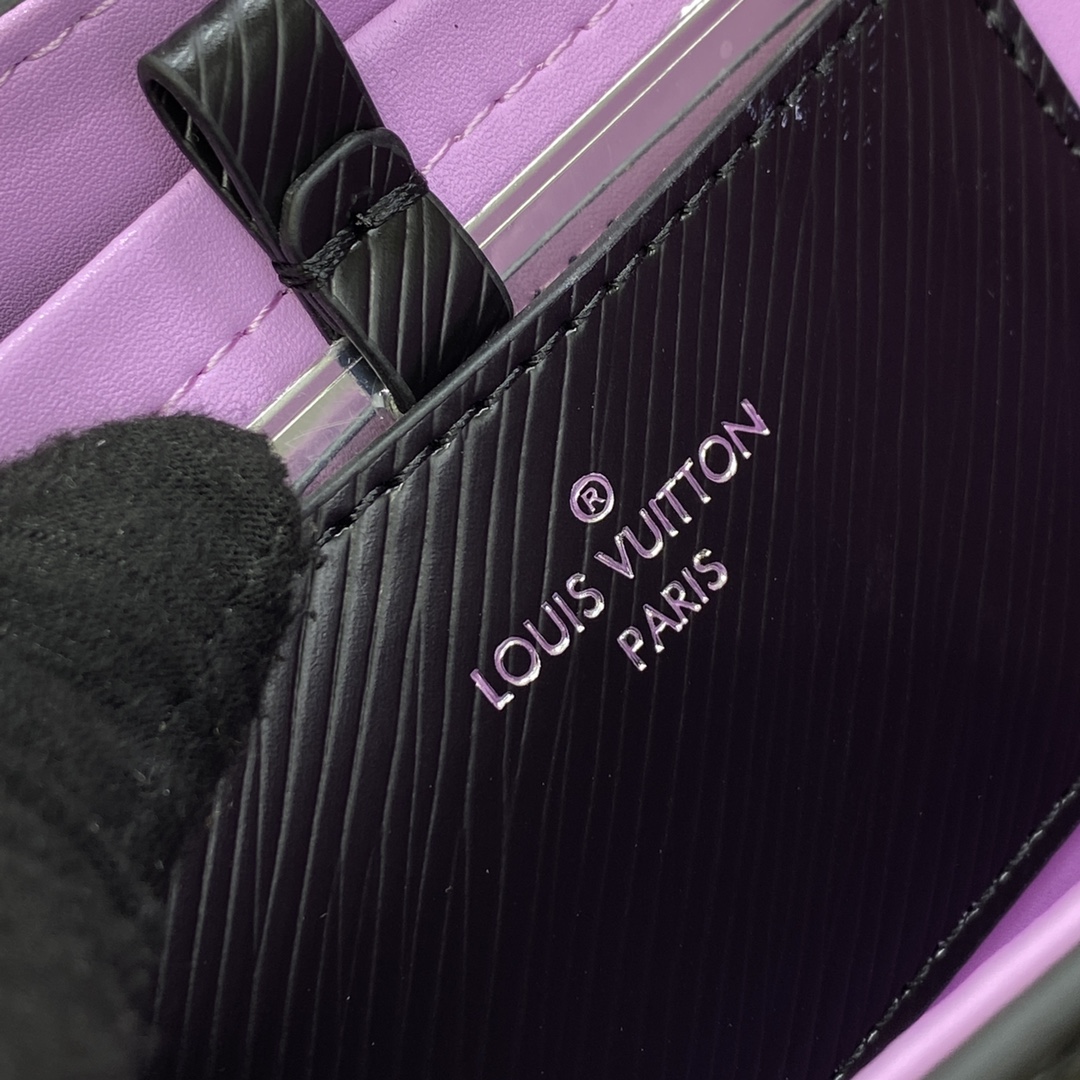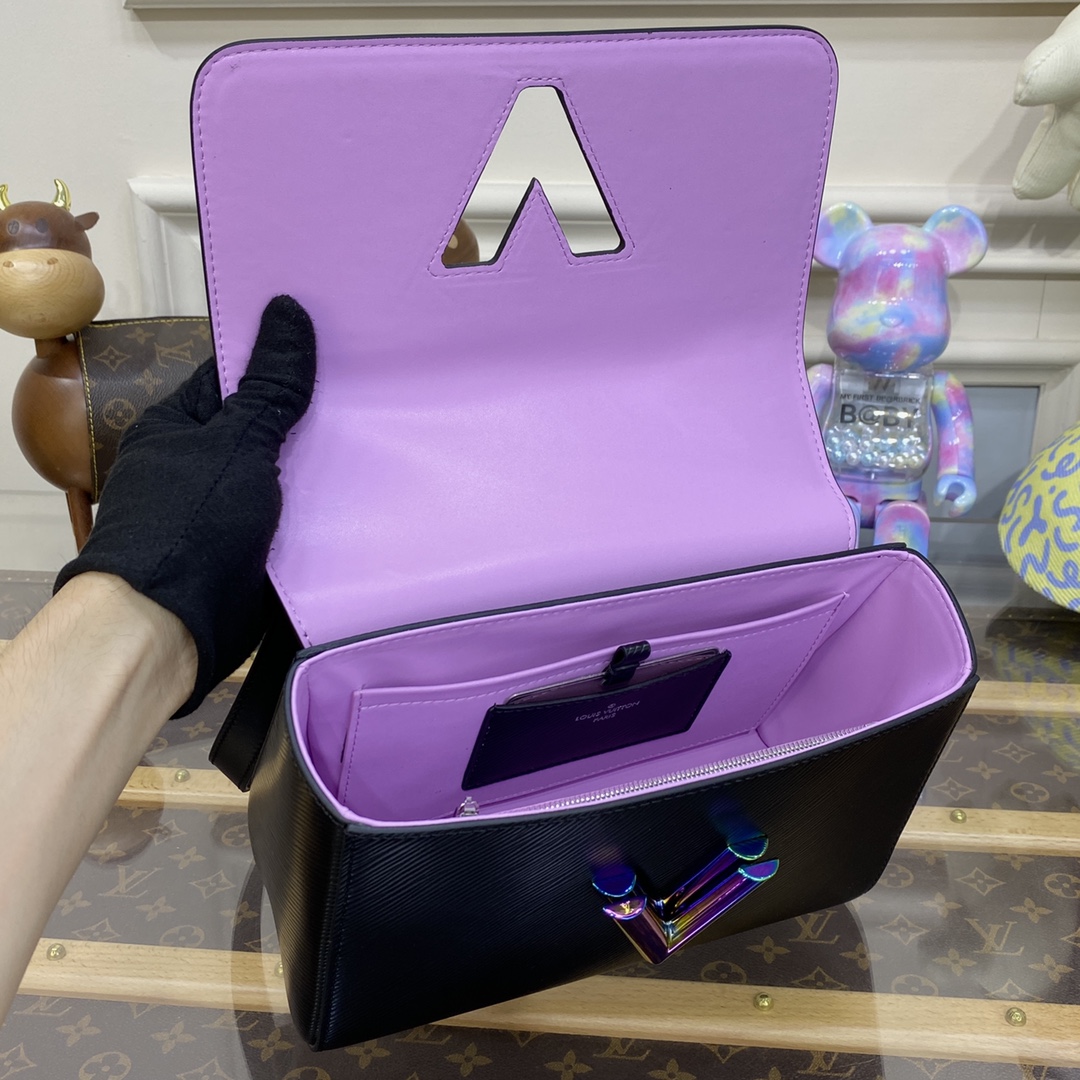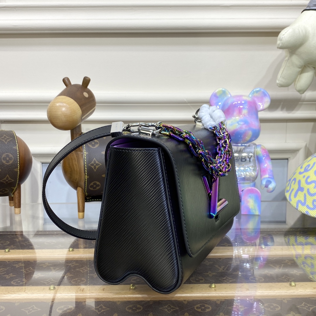 This Twist MM handbag in Epi grained leather is adorned with a unique triple chain that enables hand-carry, but also shoulder and cross-body wear when two of the thin chains are attached to the leather strap. The triple chain and LV Twist lock feature an iridescent finish that makes them shimmer like a scarab beetle.